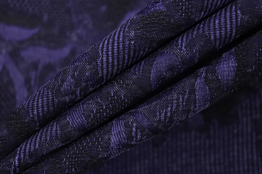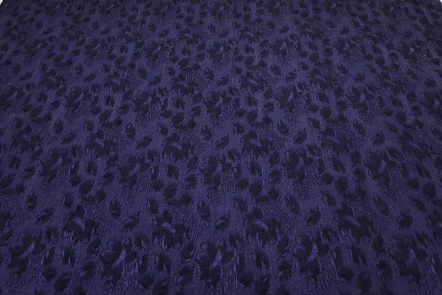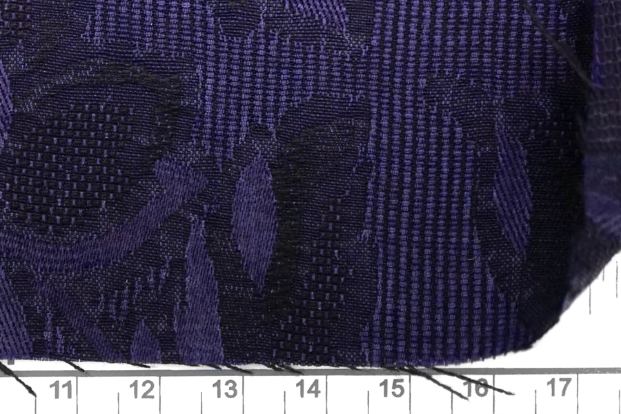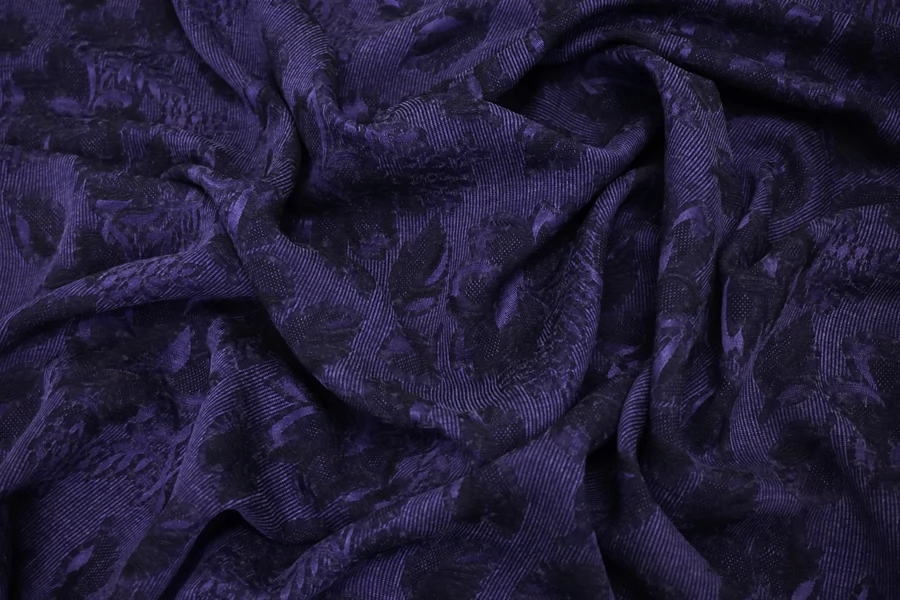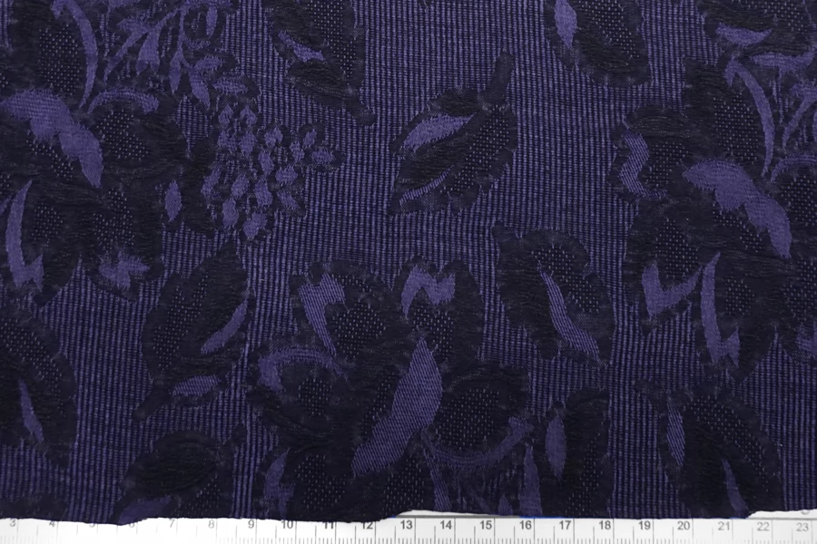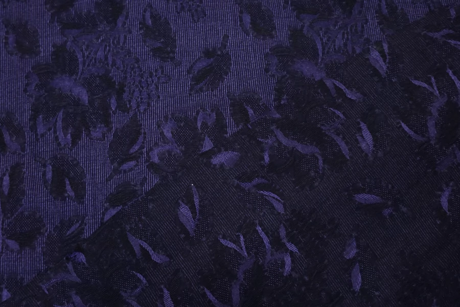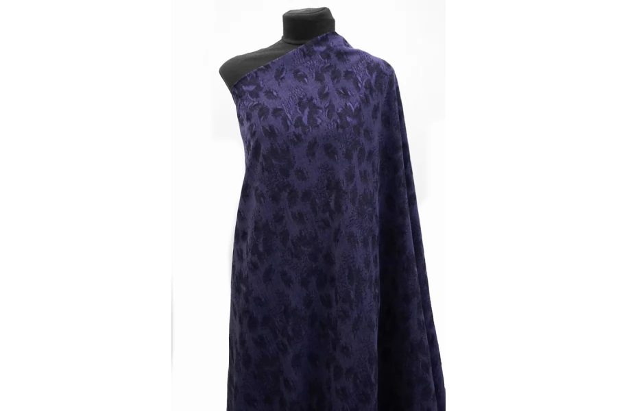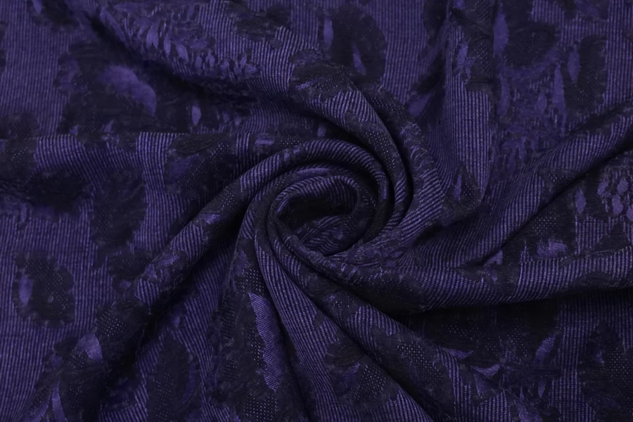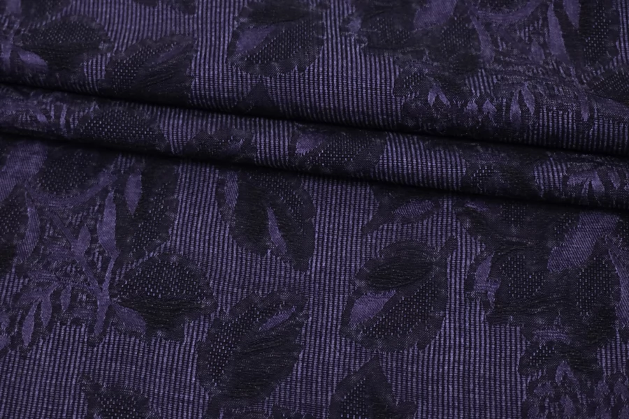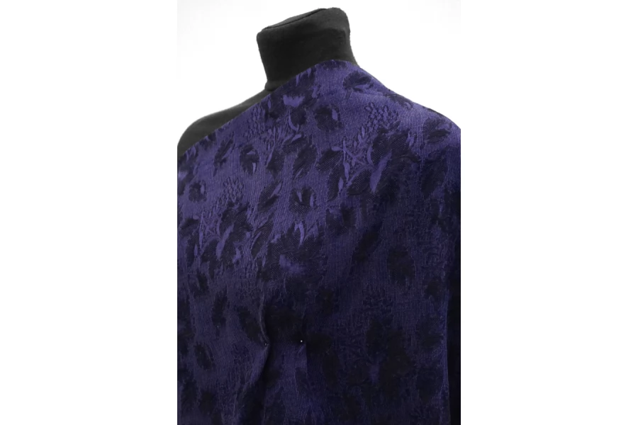 Красивая жаккардовая купра, узор цветочный, нити чёрного и сине-фиолетового цвета. Тактильно приятная, бархатистая, присутствует свойственная купре белёсость. Пластичная, плательной плотности. Не тянется. Не просвечивает. Довольно тяжелая, подойдет для пошива брюк, платья, юбки. При необходимости используйте подкладочный материал. Обязательно учитывайте усадку 5-10%.