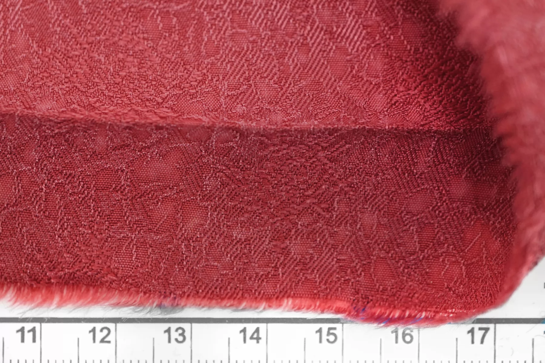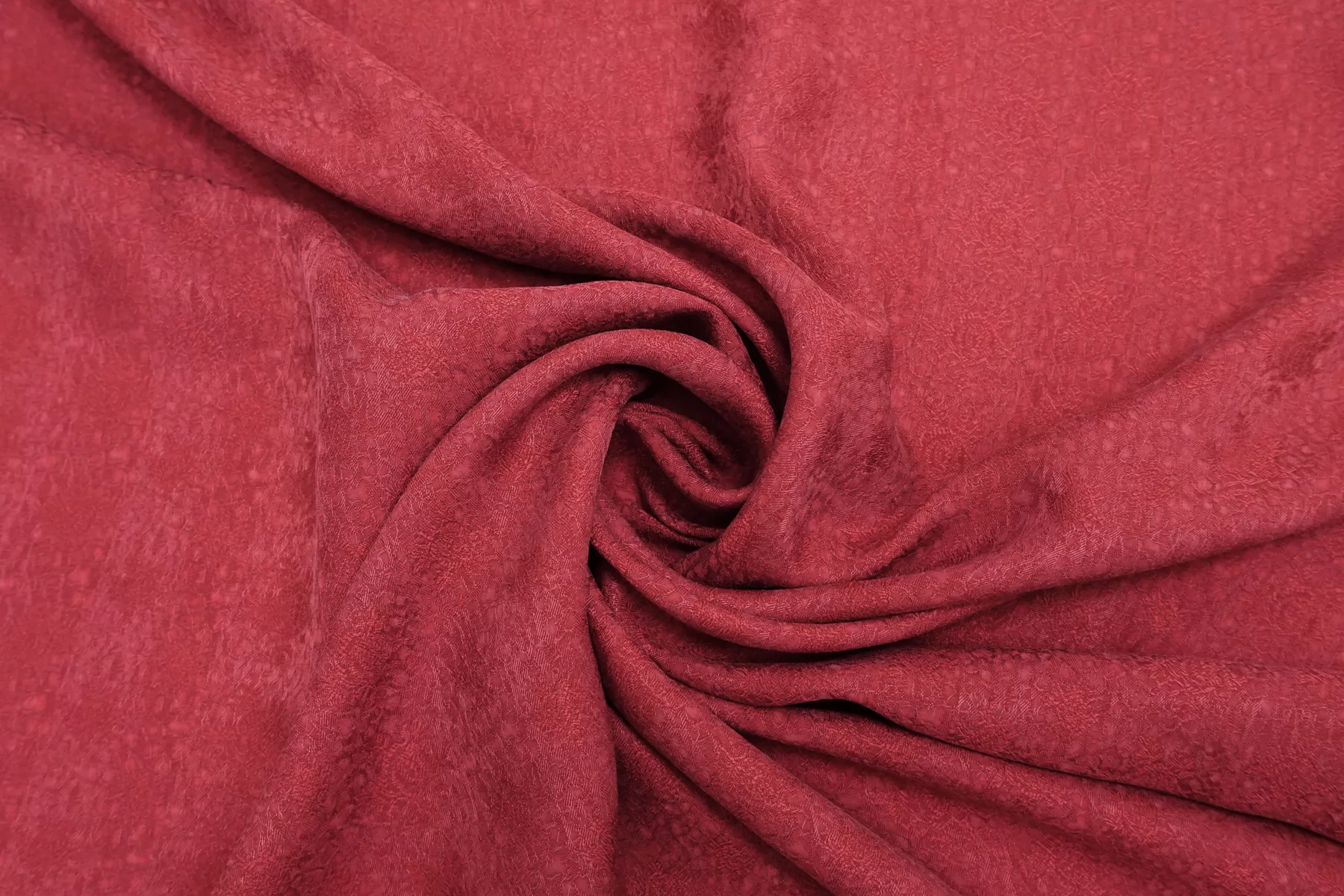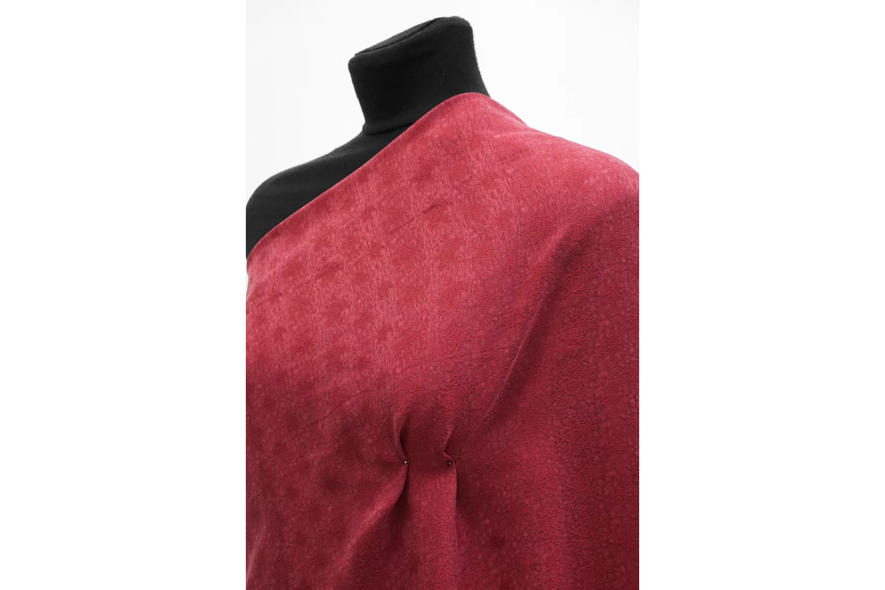 Красивая жаккардовая купра в бордово-ягодном оттенке, узор абстрактно-цветочный, и напоминает чешую. Тактильно невероятно приятная бархатистая. С белёсым отливом, характерным для купры. Тонкая, очень пластичная. Не тянется. Плетение неплотное, просвечивает силуэт. Красиво струится. Вариант на платья, юбки, блузки и одежду в бельевом стиле. При необходимости используйте подкладочный материал. Обязательно учитывайте усадку 5-10%.