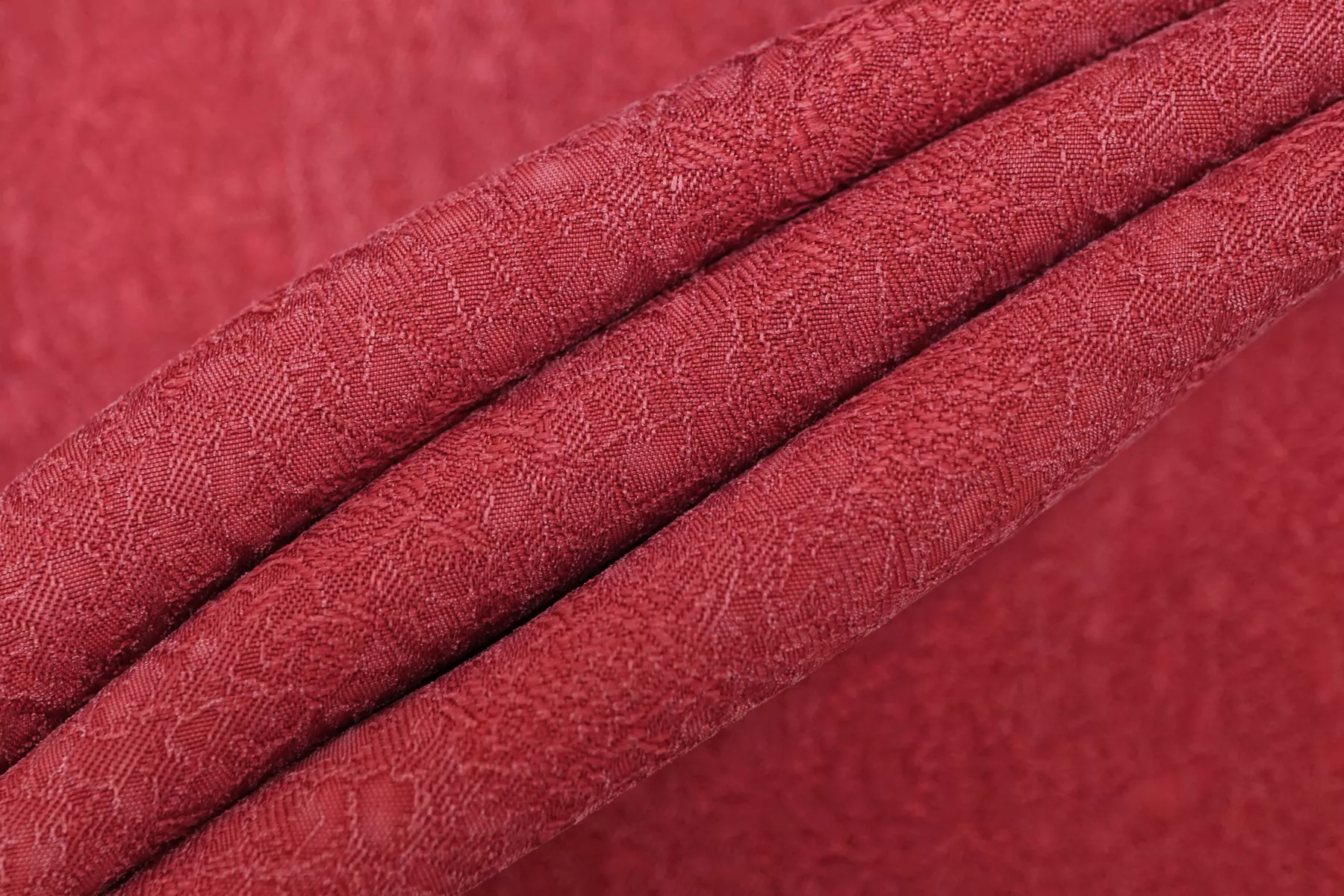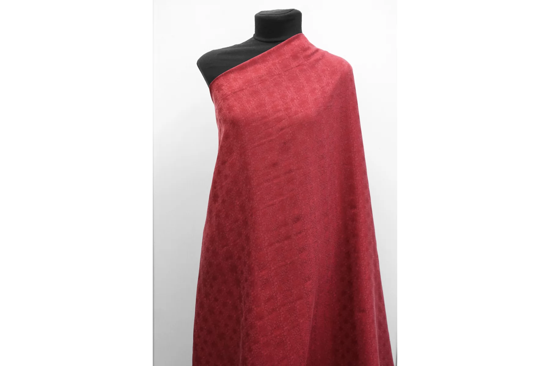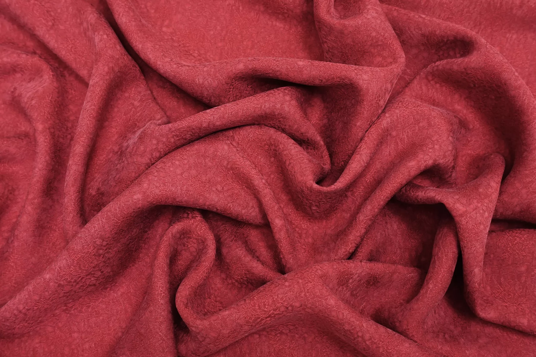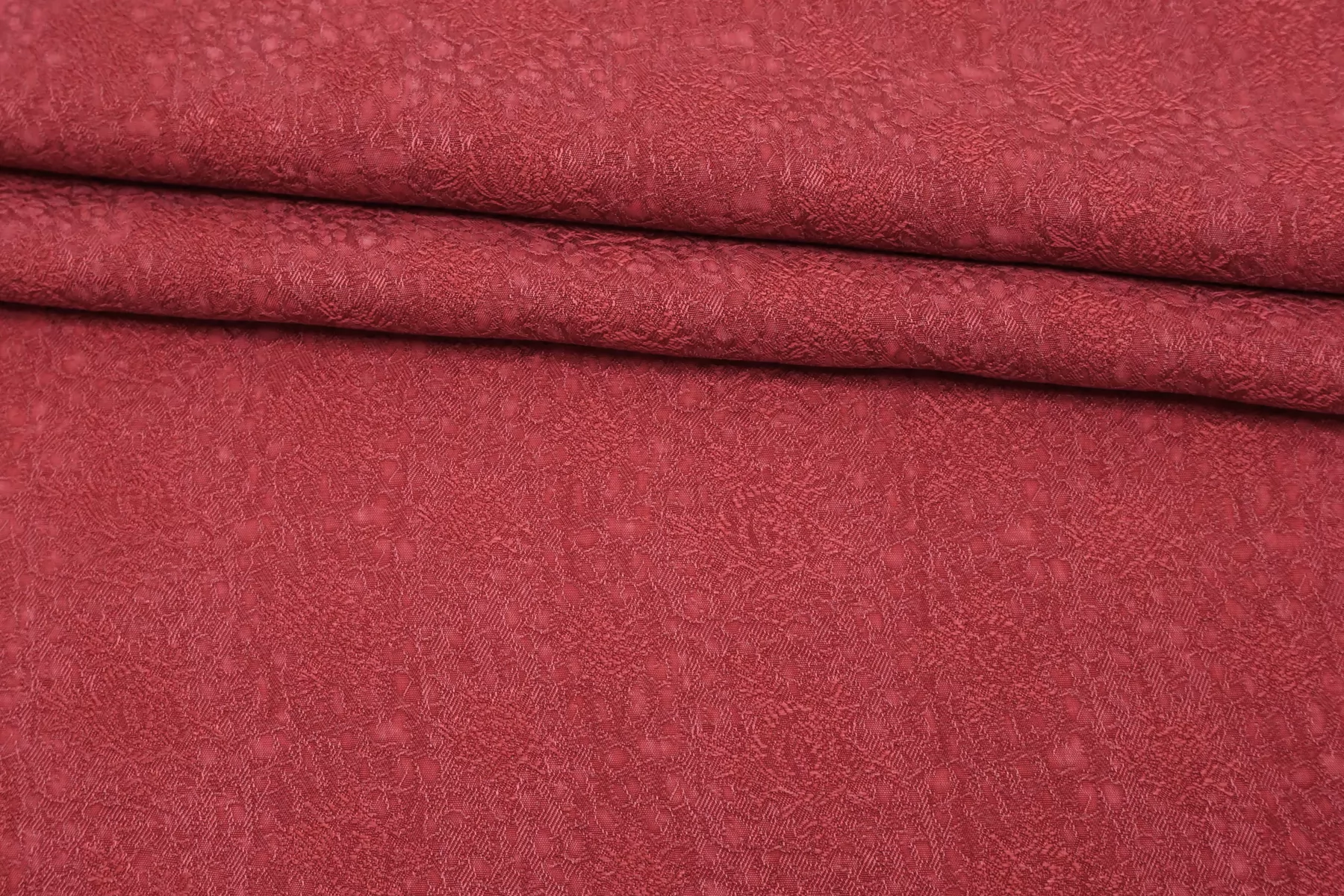 Красивая жаккардовая купра в бордово-ягодном оттенке, узор абстрактно-цветочный, и напоминает чешую. Тактильно невероятно приятная бархатистая. С белёсым отливом, характерным для купры. Тонкая, очень пластичная. Не тянется. Плетение неплотное, просвечивает силуэт. Красиво струится. Вариант на платья, юбки, блузки и одежду в бельевом стиле. При необходимости используйте подкладочный материал. Обязательно учитывайте усадку 5-10%.