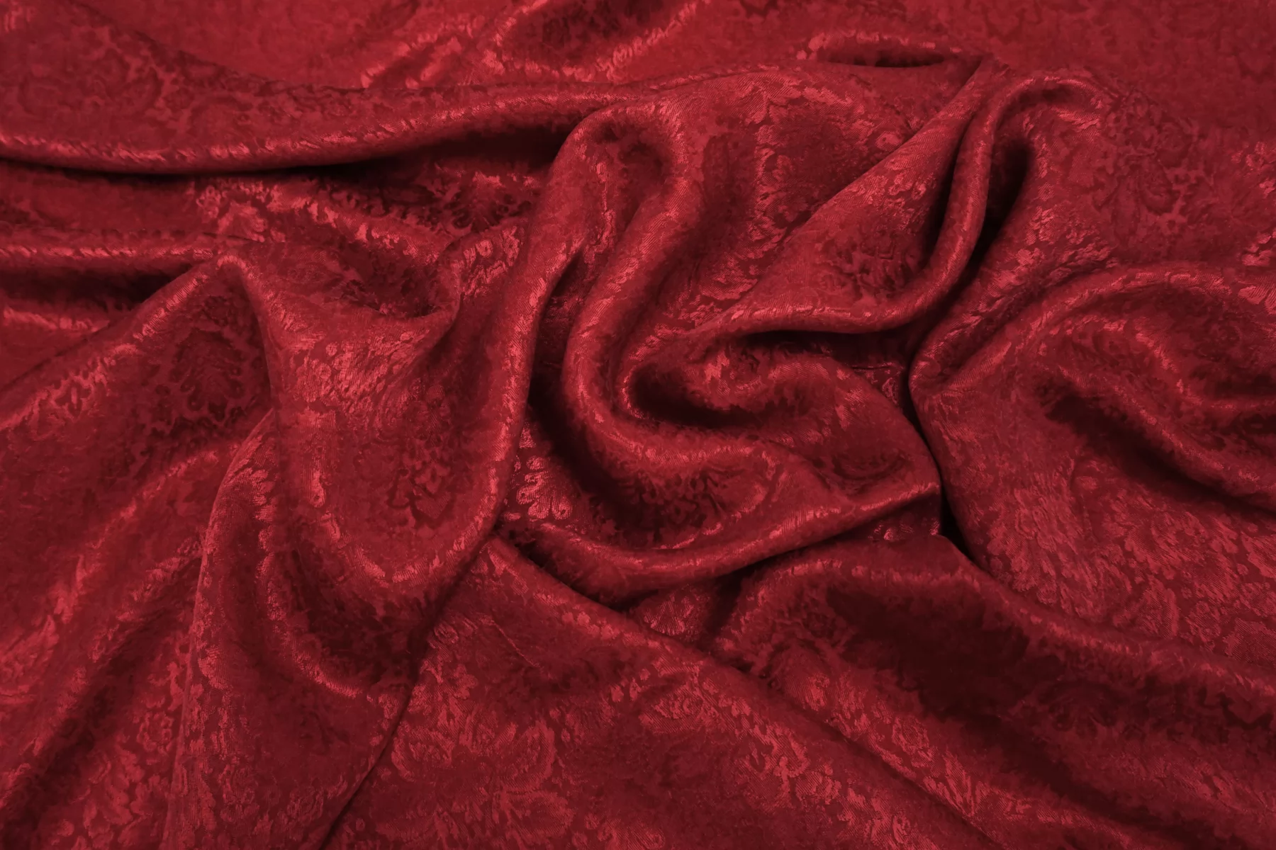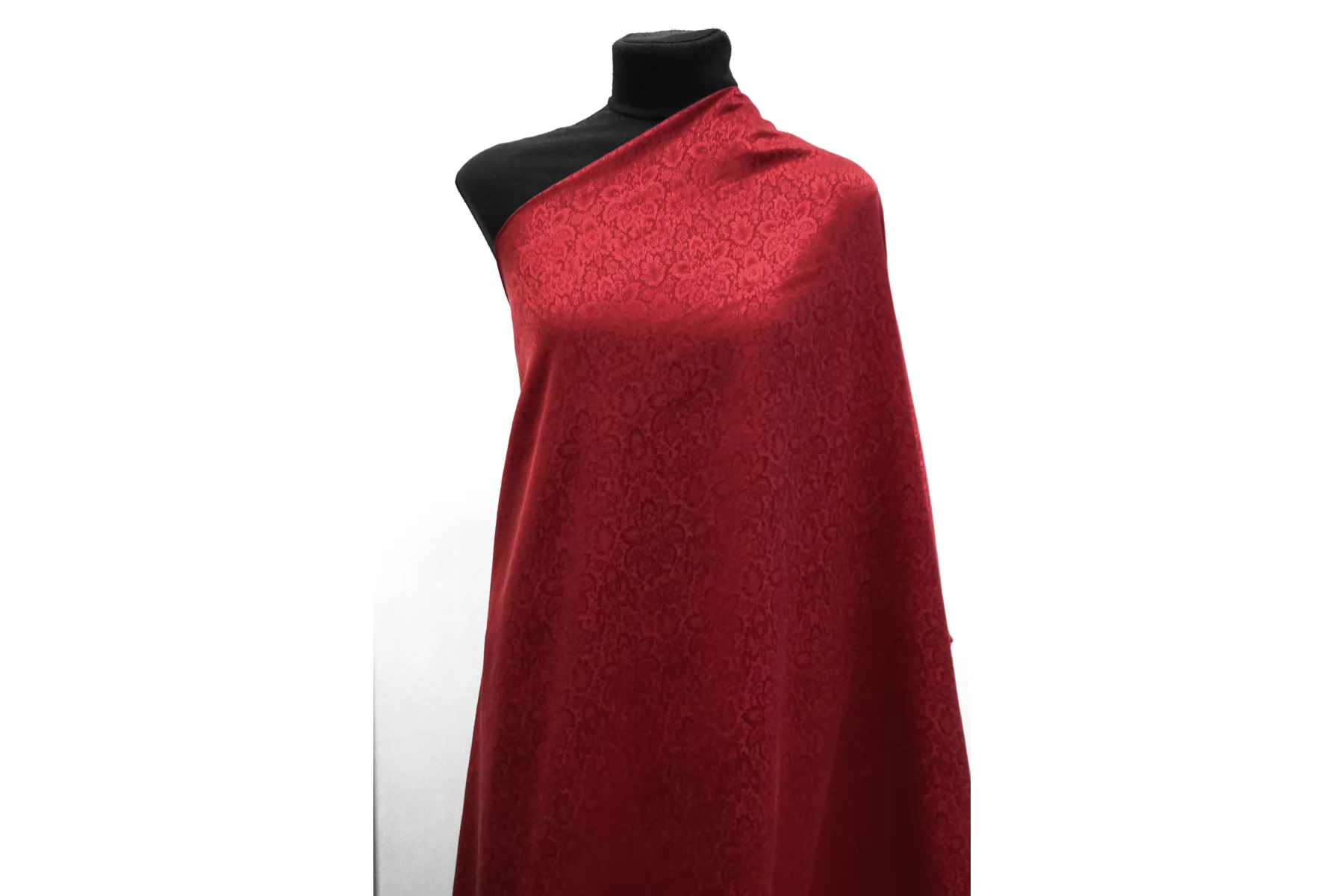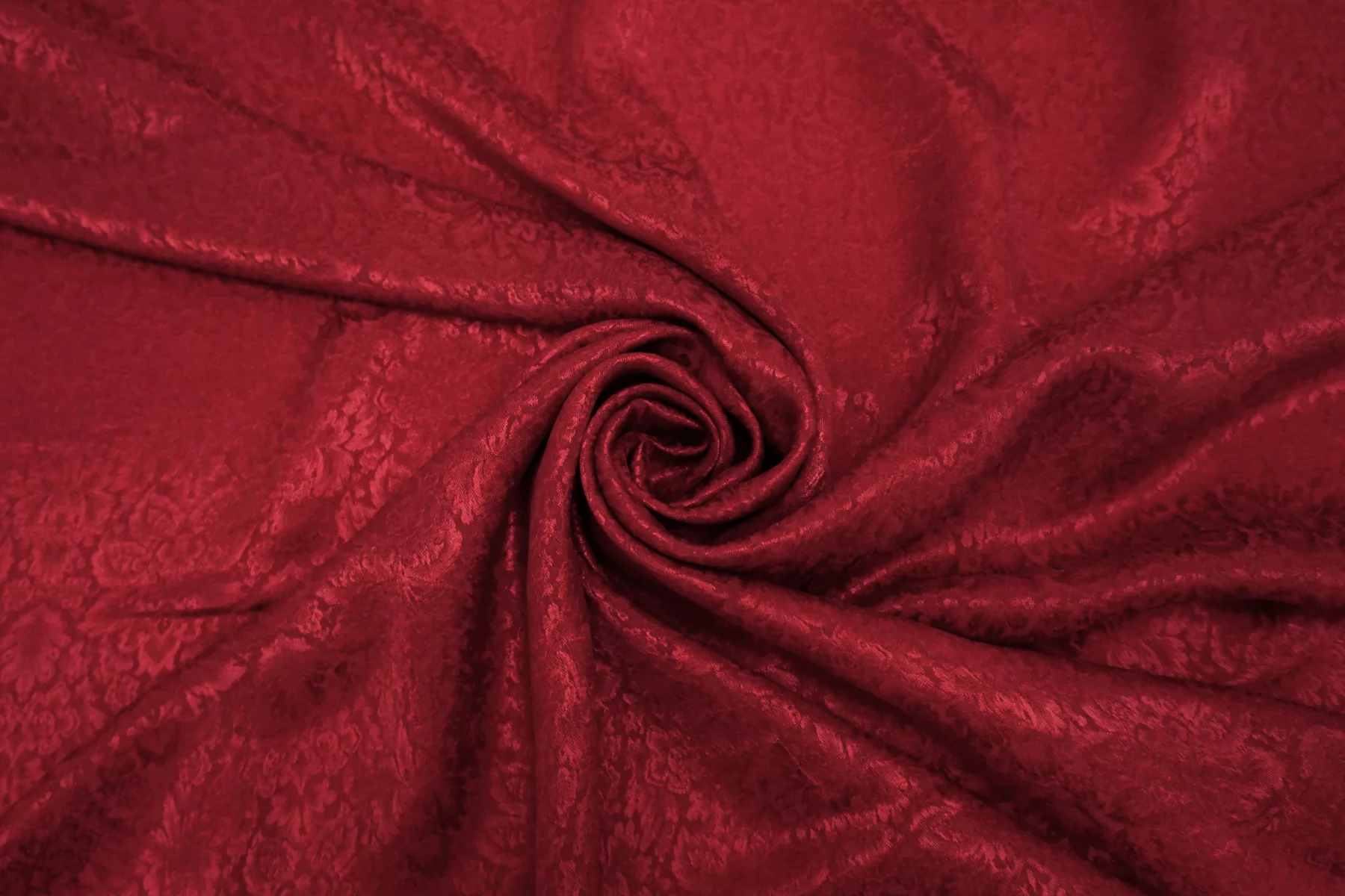Очень красивая жаккардовая вискоза в бордовом цвете с абстрактно-цветочным принтом. Тактильно очень приятная. Обладает мягким блеском. Тонкая, очень пластичная. Не тянется. Плетение неплотное, просвечивает силуэт. Красиво струится. Вариант на платья, юбки, блузки и одежду в бельевом стиле. При необходимости используйте подкладочный материал. Обязательно учитывайте усадку 5-10%.