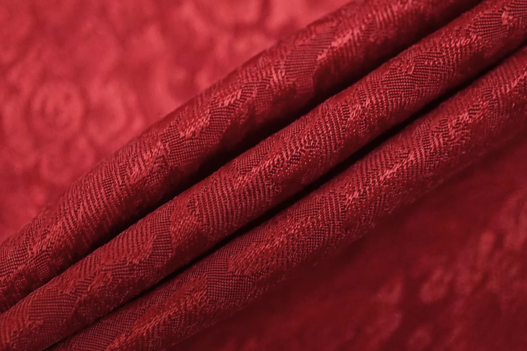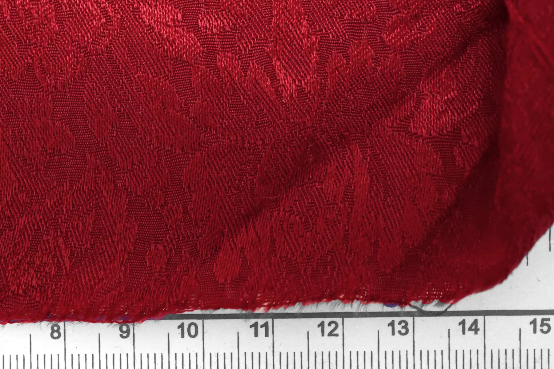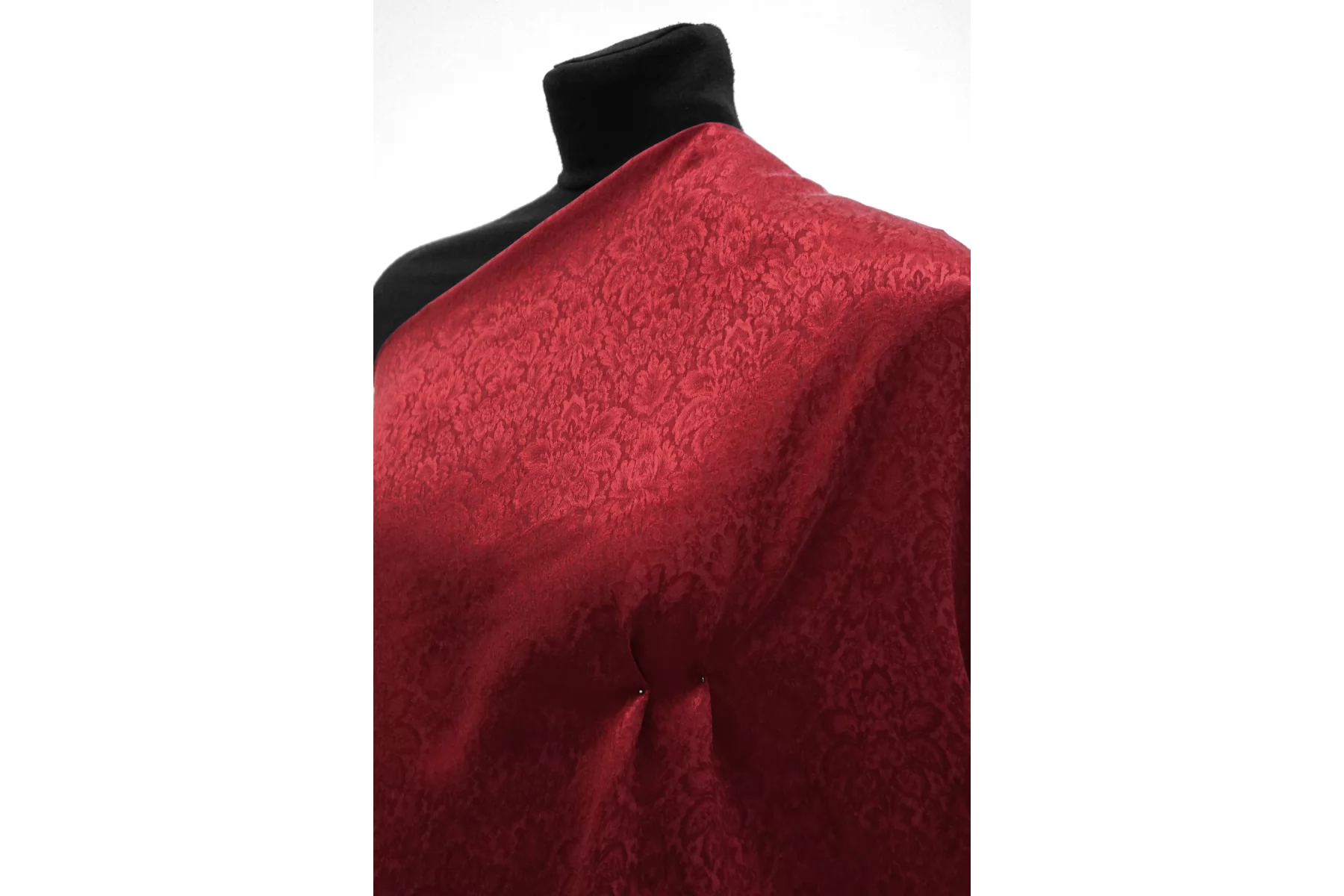 Очень красивая жаккардовая вискоза в бордовом цвете с абстрактно-цветочным принтом. Тактильно очень приятная. Обладает мягким блеском. Тонкая, очень пластичная. Не тянется. Плетение неплотное, просвечивает силуэт. Красиво струится. Вариант на платья, юбки, блузки и одежду в бельевом стиле. При необходимости используйте подкладочный материал. Обязательно учитывайте усадку 5-10%.