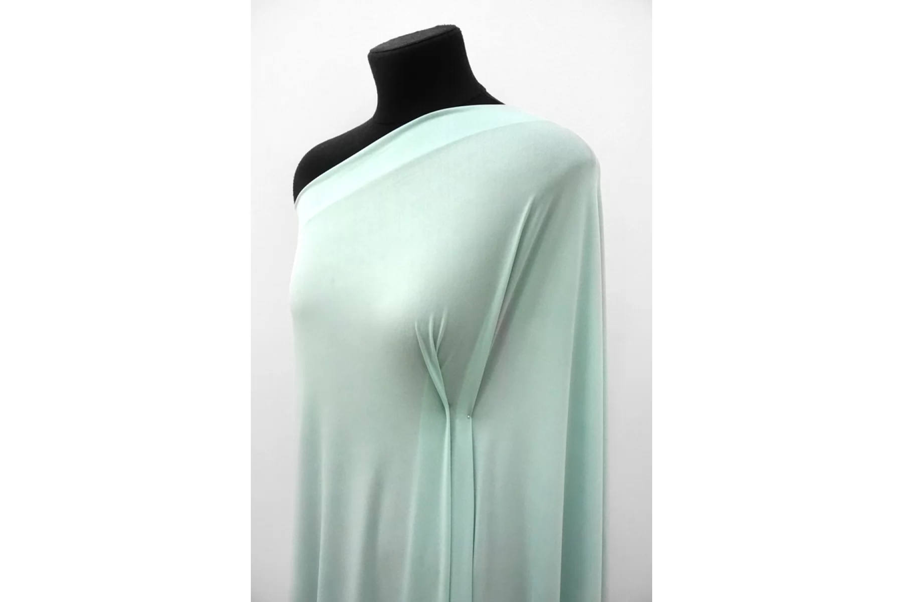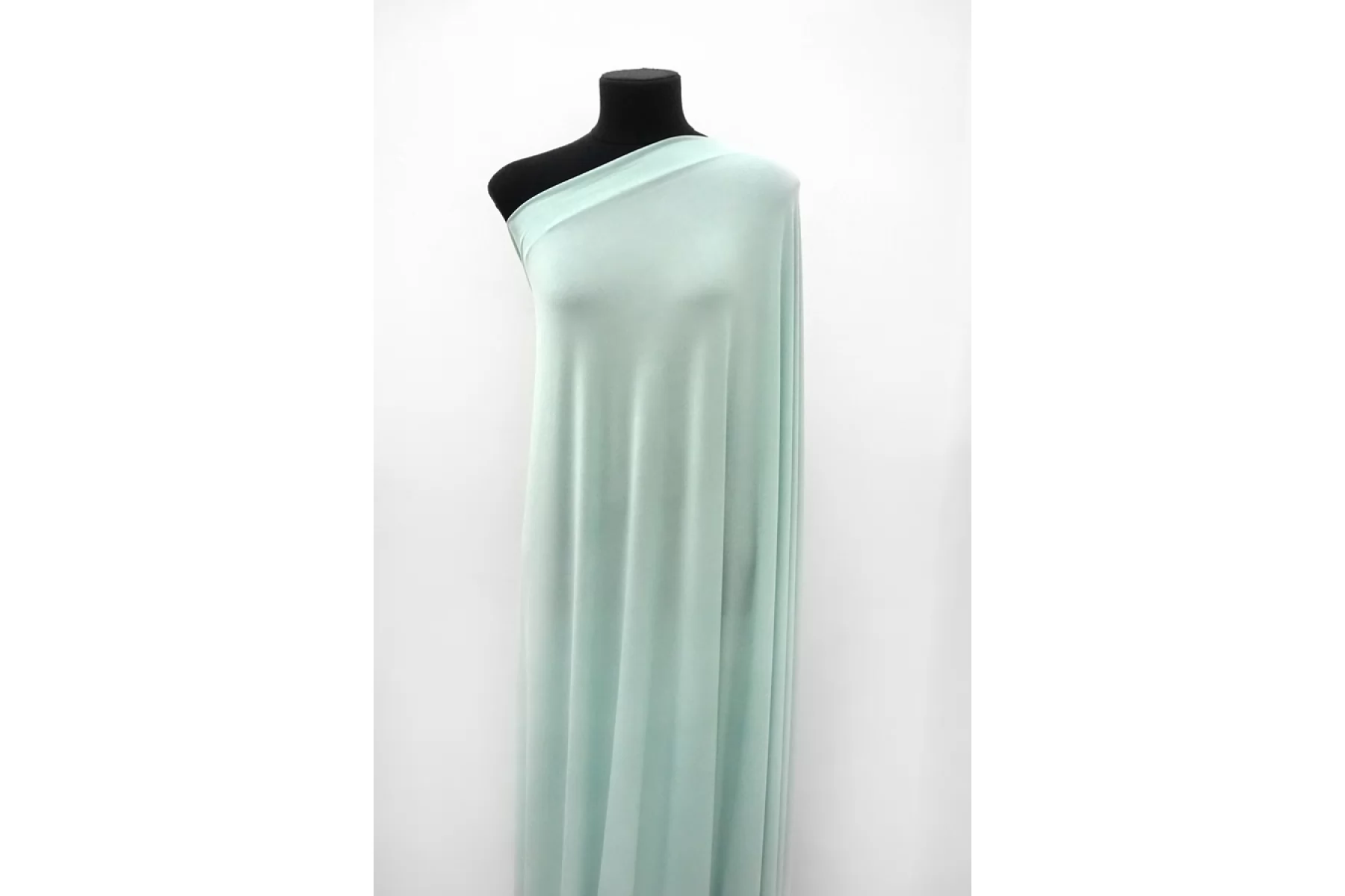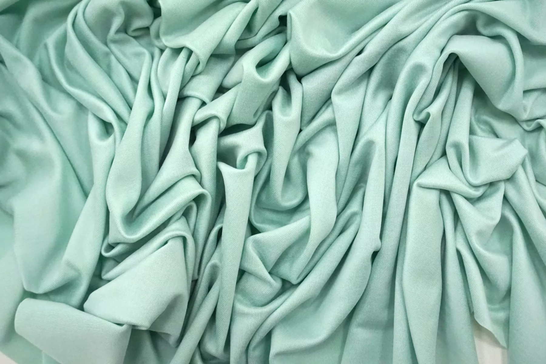 Холодный тонкий трикотаж из купро в красивом пастельно-бирюзовом цвете. Приятный на ощупь, гладкий, мягкий, легкий. Имеет красивый легкий блеск как у шелка. Подойдет для пошива летнего платья, туники, сарафана, блузки, свободных брюк, одежды в пижамном стиле.