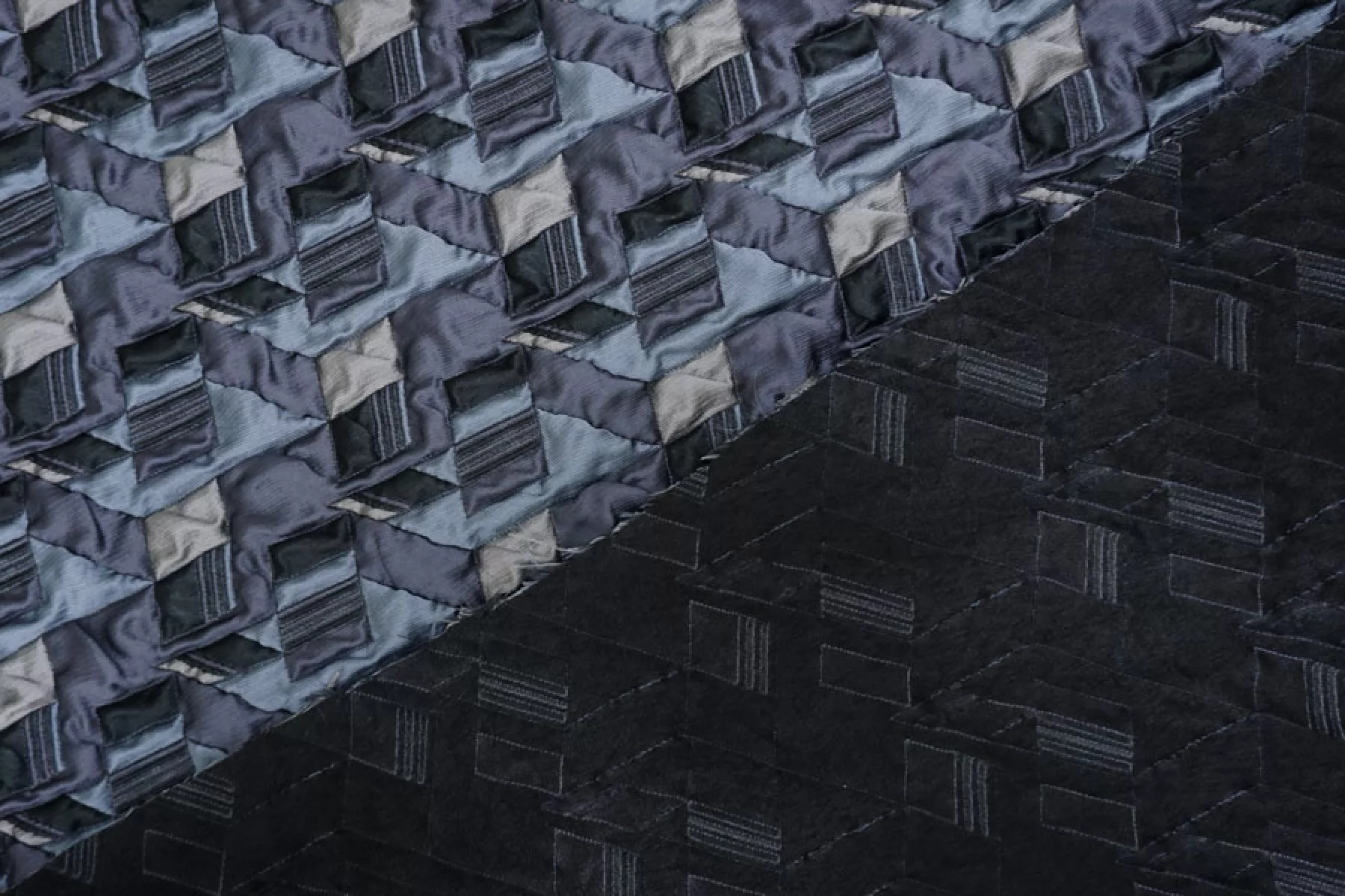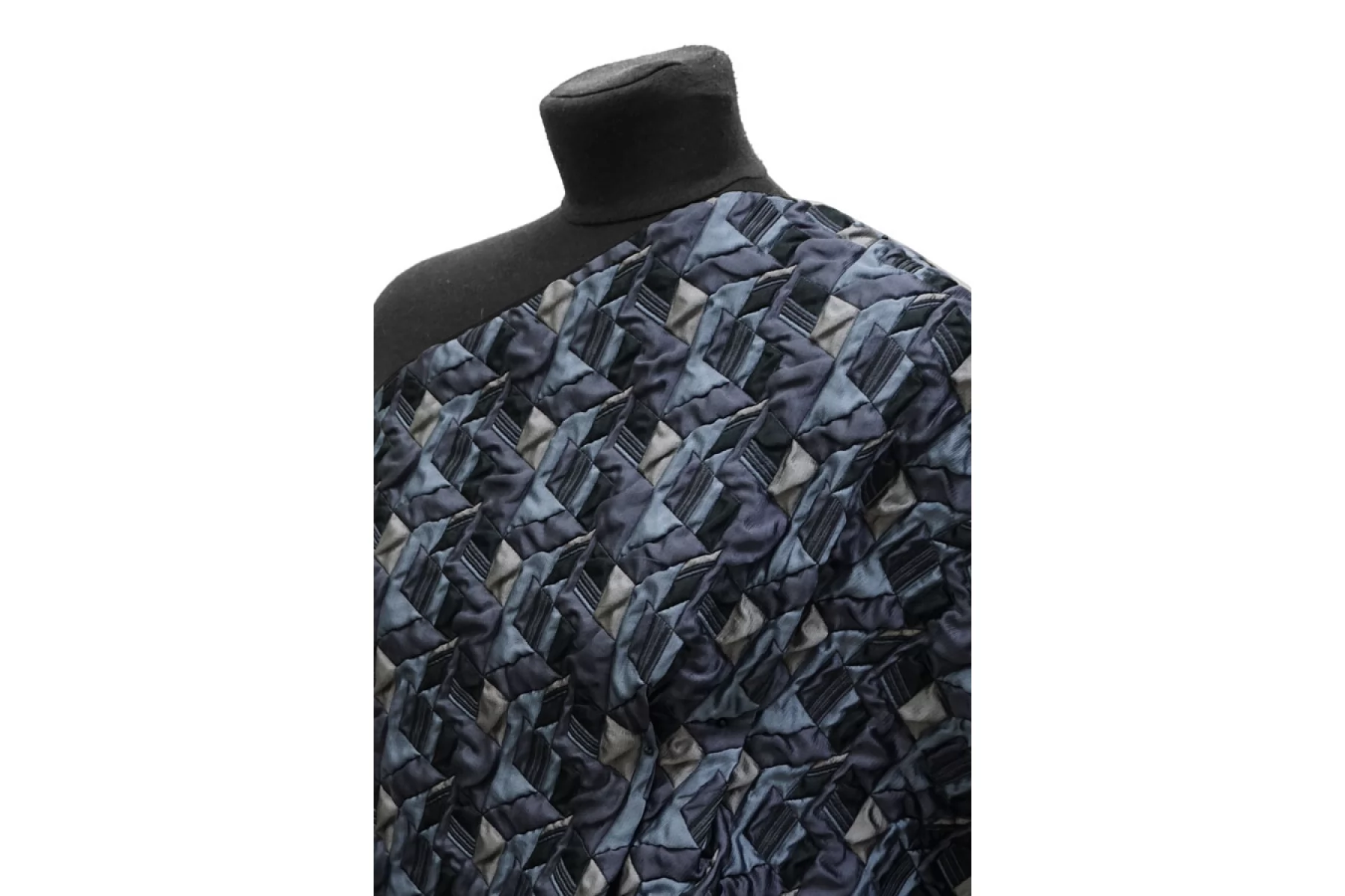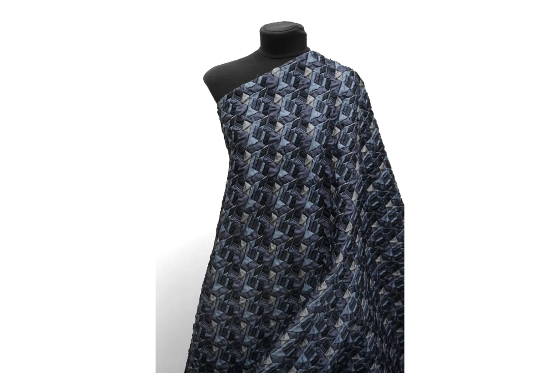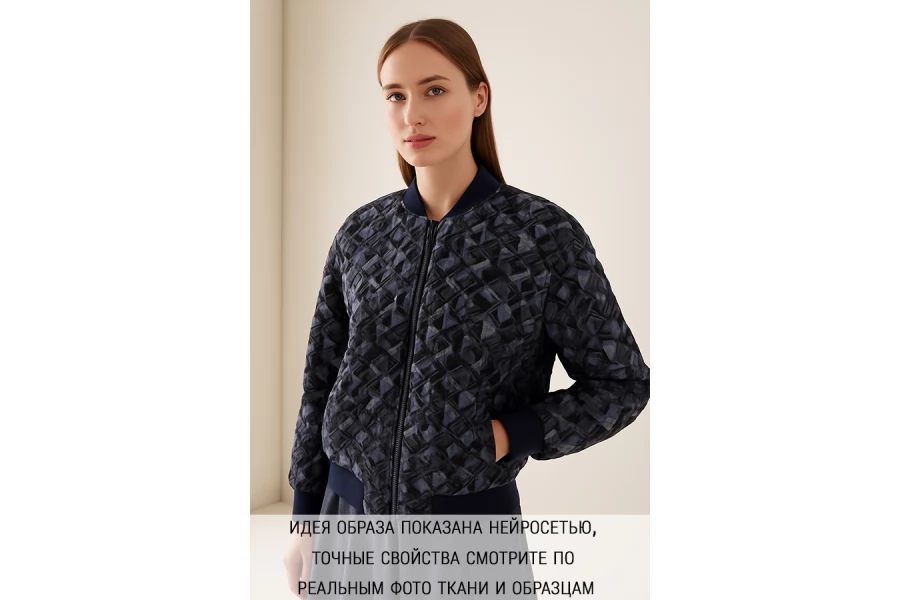 Итальянская синтетическая ткань с фактурным, выпуклым геометрическим узором. Цвета: серый, серо-голубой, приглушённо-фиолетовый, чёрный. Не тянется, не просвечивает. Тактильно шероховатая, лучше закрыть подкладкой. Подойдет для пошива интересных бомберов, курток, жакетов.