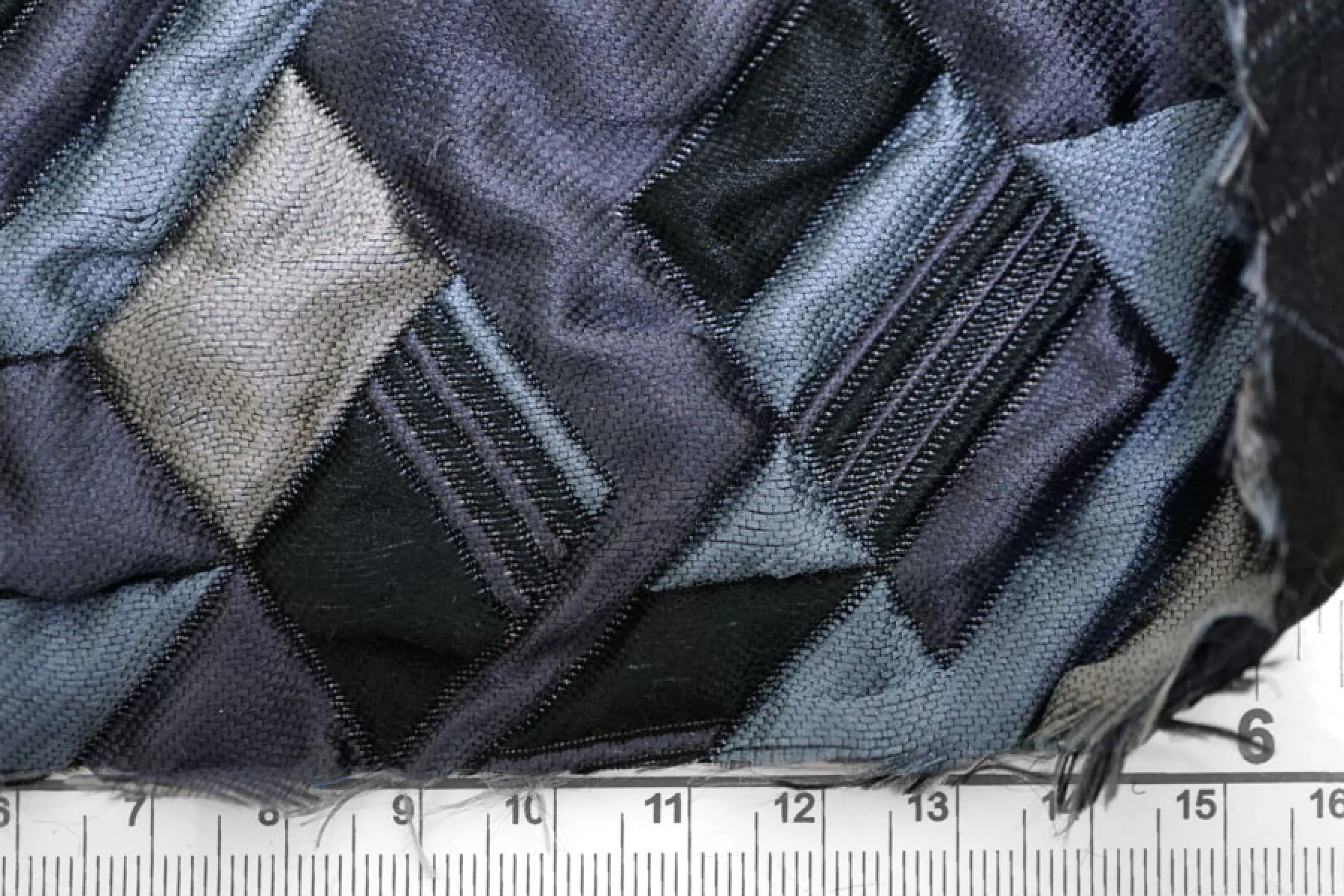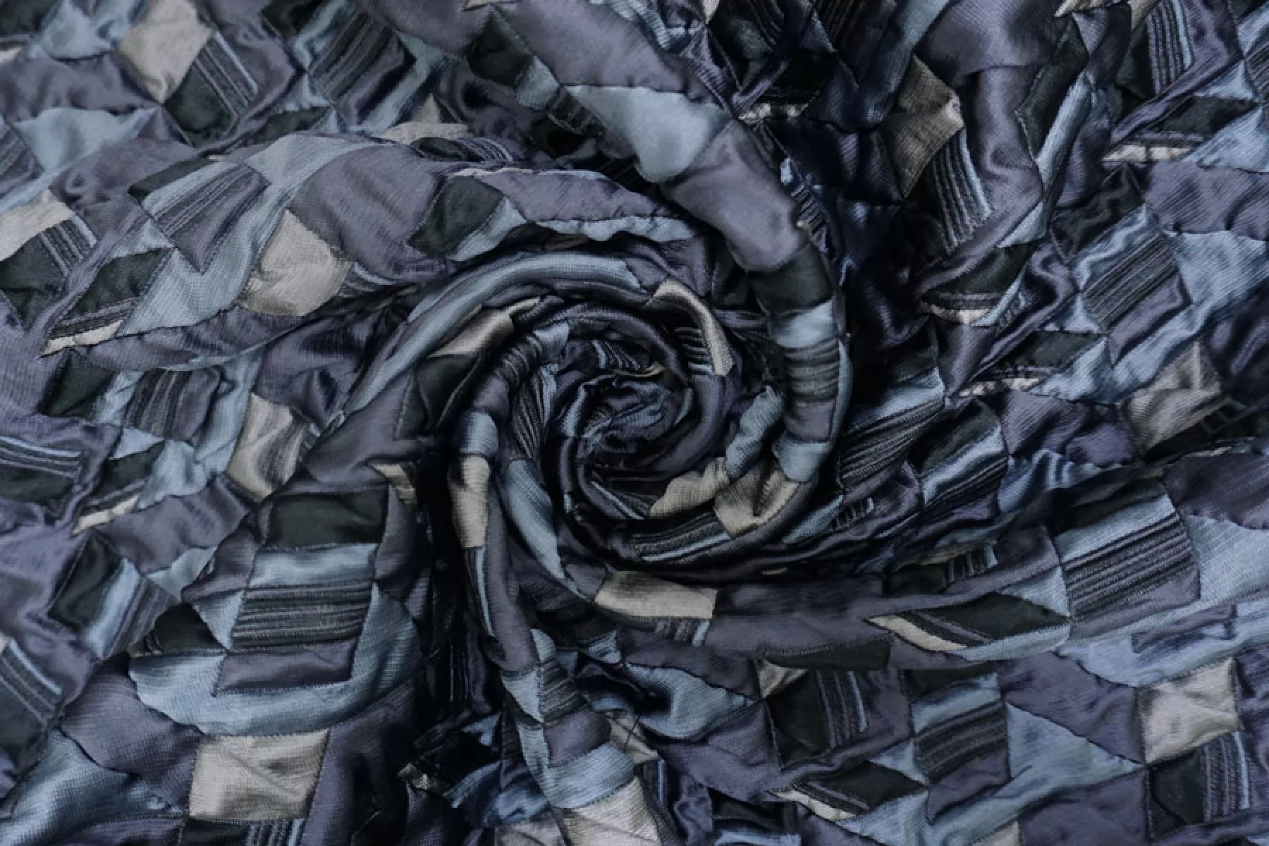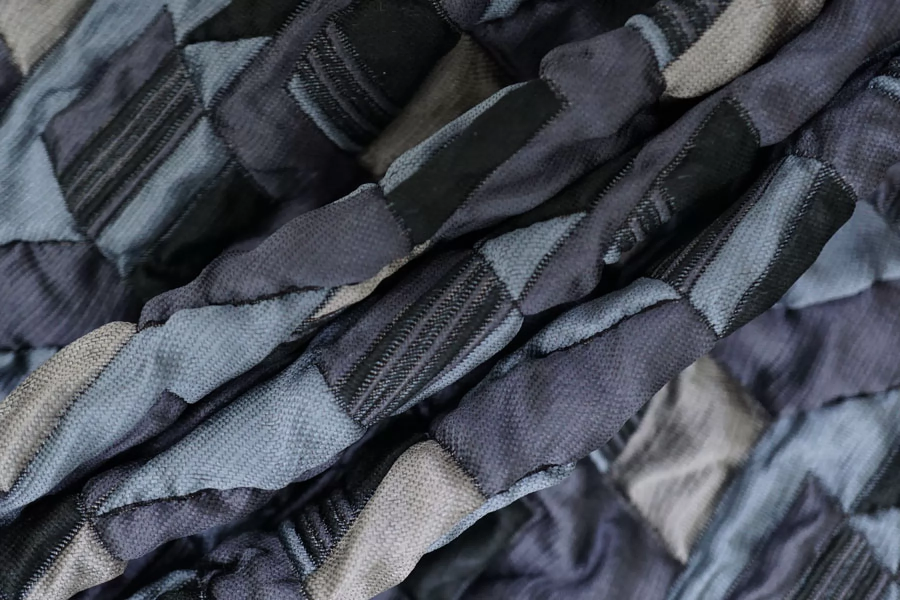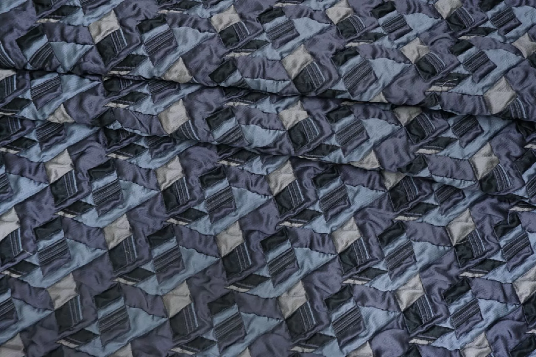 Итальянская синтетическая ткань с фактурным, выпуклым геометрическим узором. Цвета: серый, серо-голубой, приглушённо-фиолетовый, чёрный. Не тянется, не просвечивает. Тактильно шероховатая, лучше закрыть подкладкой. Подойдет для пошива интересных бомберов, курток, жакетов.