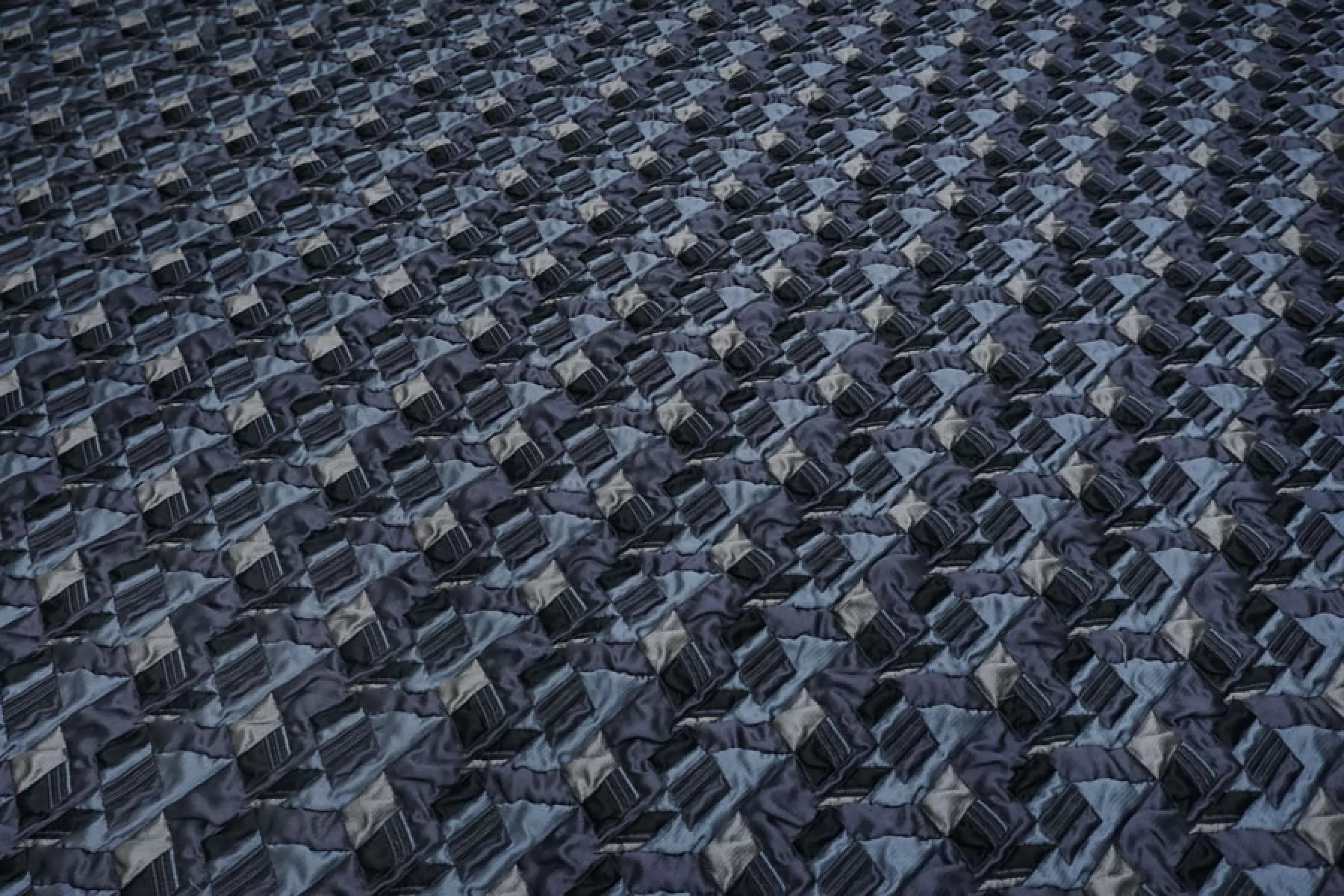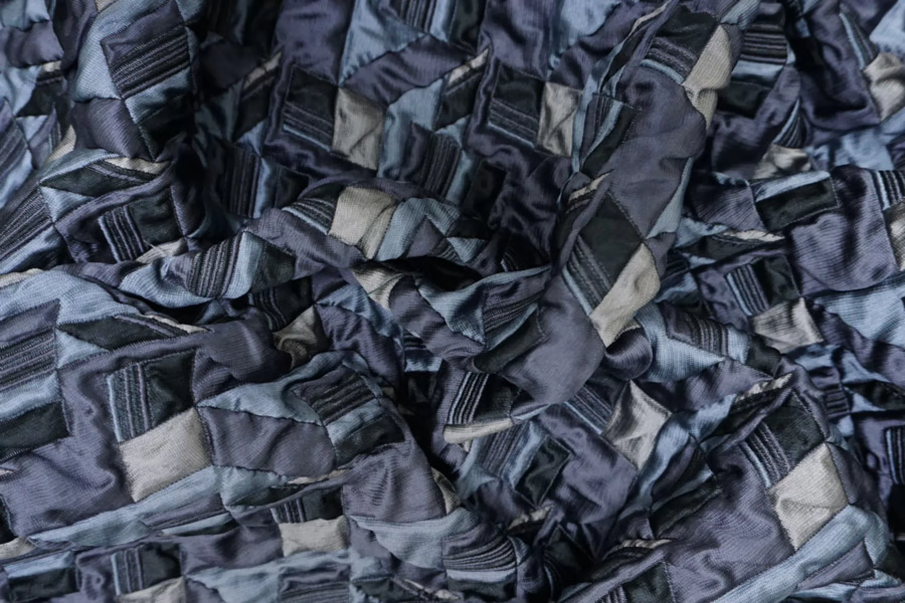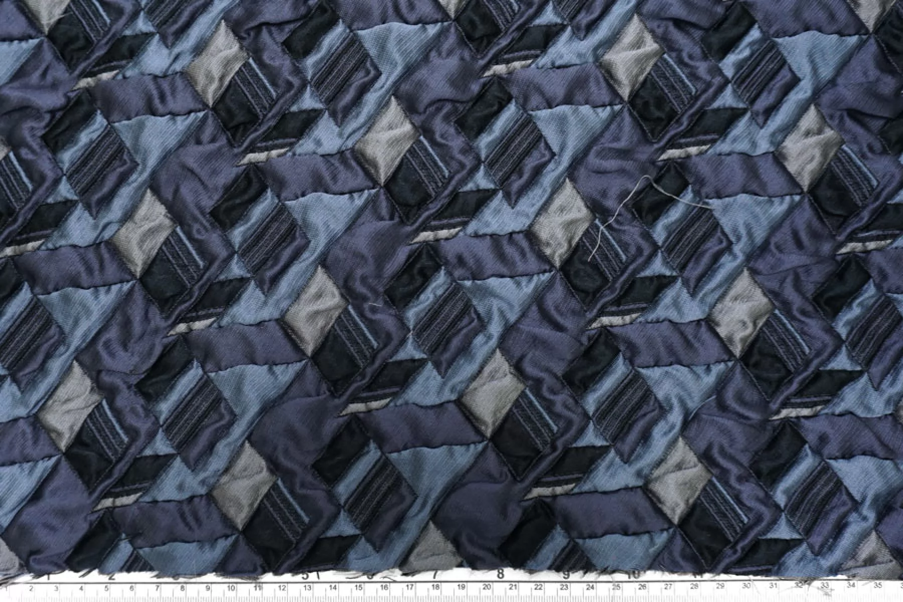 Итальянская синтетическая ткань с фактурным, выпуклым геометрическим узором. Цвета: серый, серо-голубой, приглушённо-фиолетовый, чёрный. Не тянется, не просвечивает. Тактильно шероховатая, лучше закрыть подкладкой. Подойдет для пошива интересных бомберов, курток, жакетов.