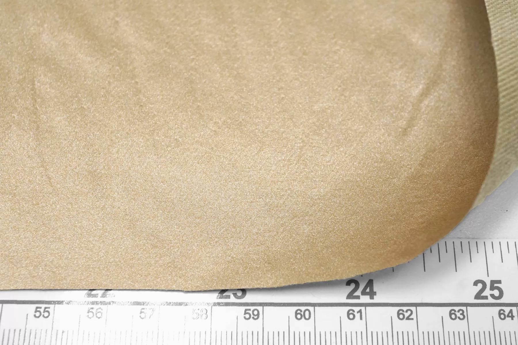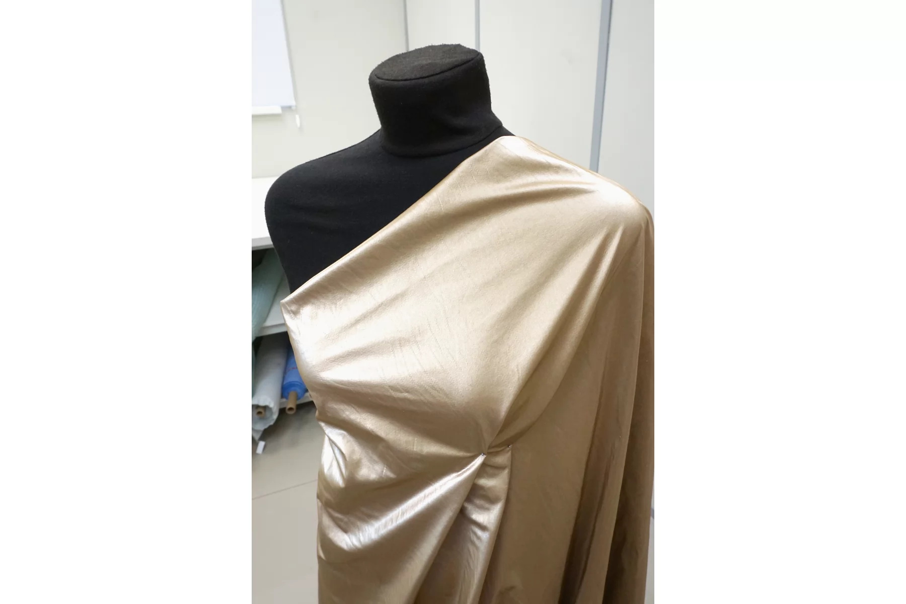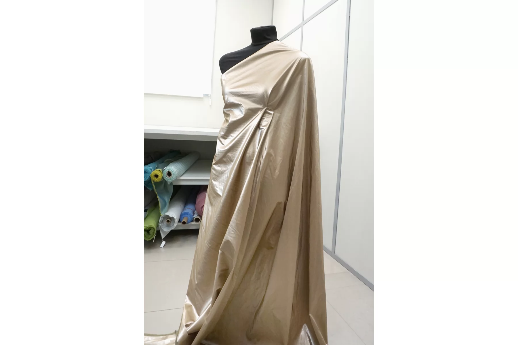 Ткань-лаке на вискозной основе. Цвет золотистый на лице, изнанка бежевая. Не просвечивает. Умеренной плотности, из-за натуральной основы может слегка мяться, но восстанавливается и хорошо отпаривается. Пластичная, с интересным лоском,не тянется. Мягкая, приятная как с лицевой, так и с изнаночной стороны. Пластичная, умеренно держит форму. Подойдет для пошива костюмно-плательной группы, плащей и ветровок. Не промокает.