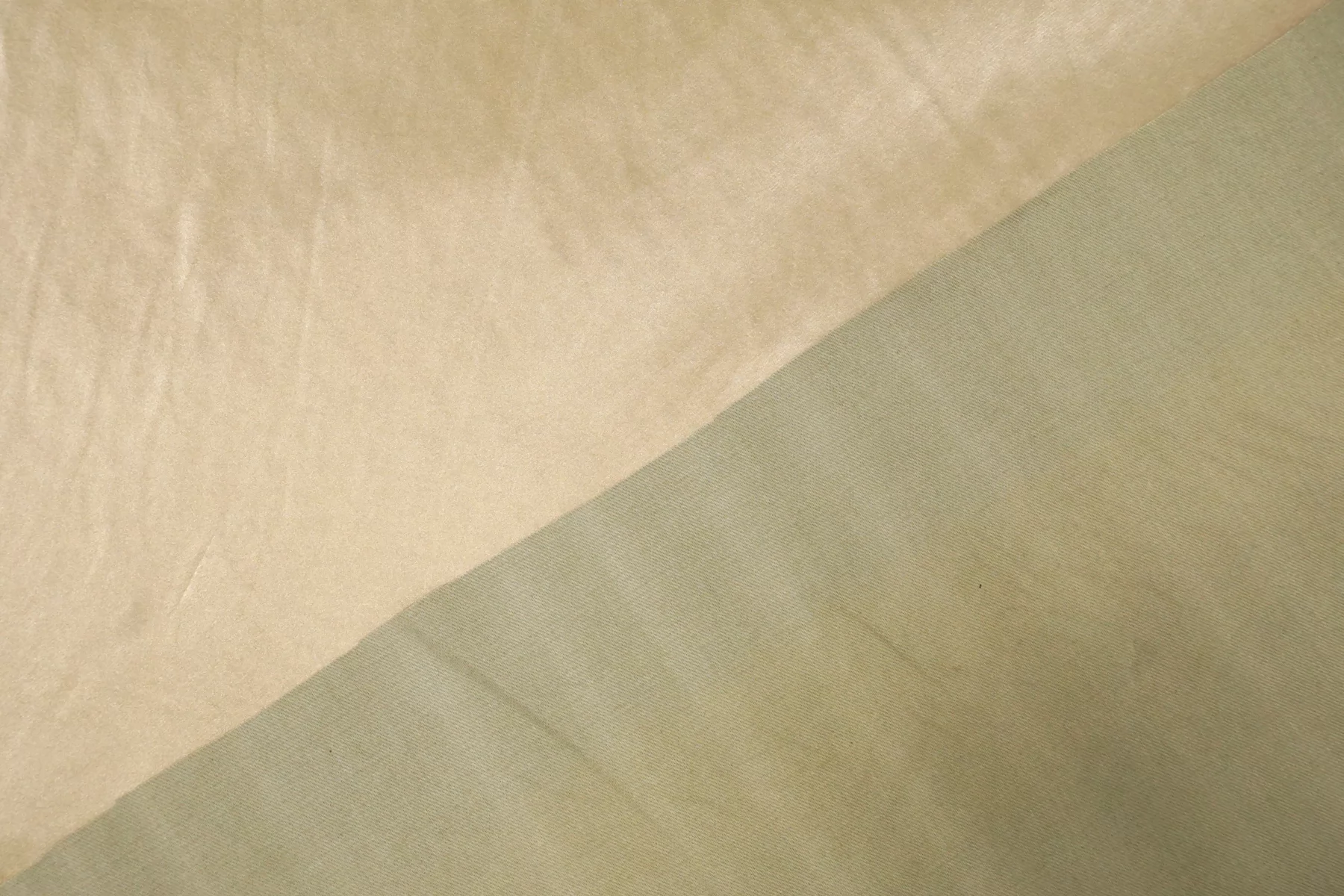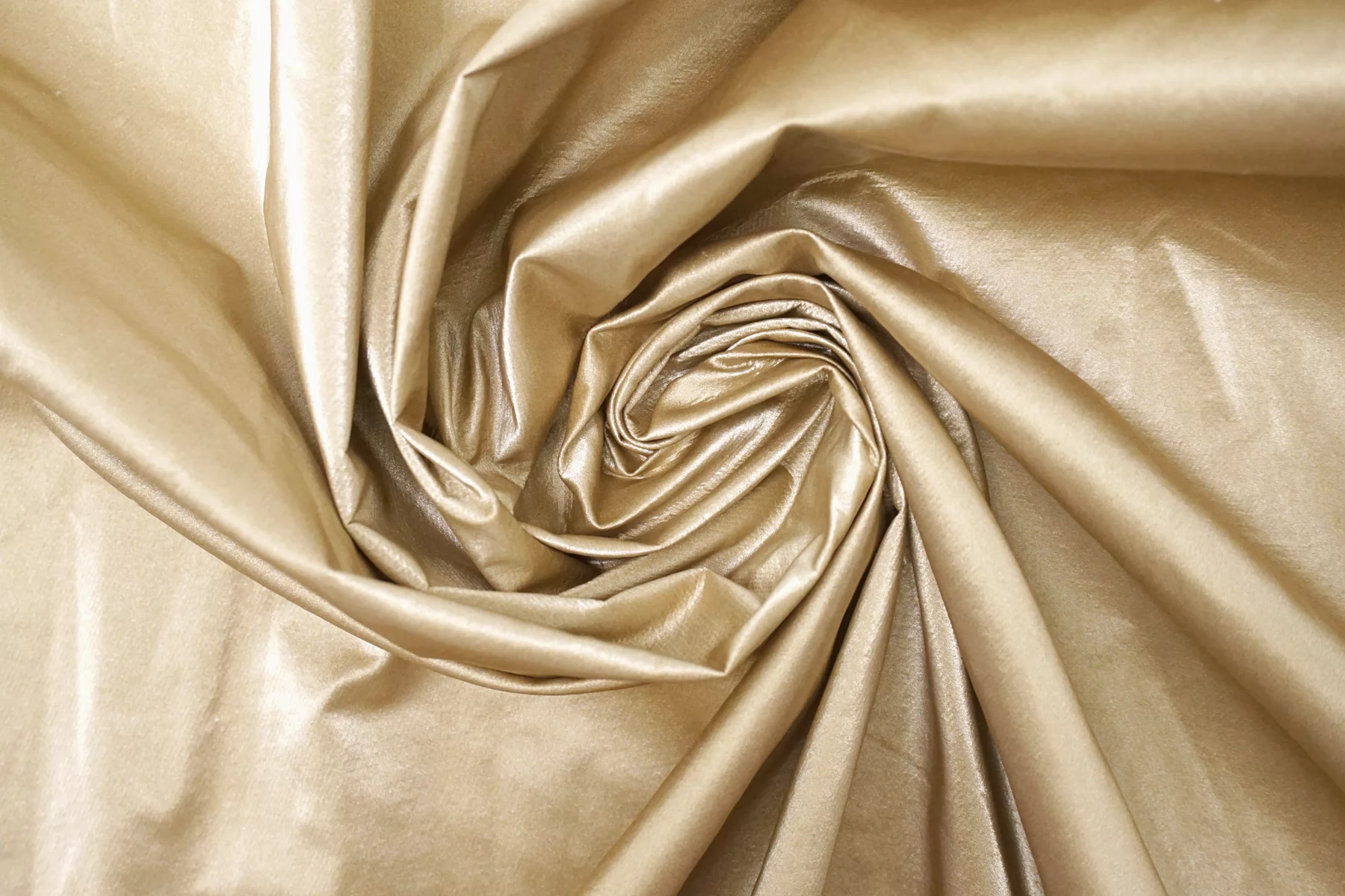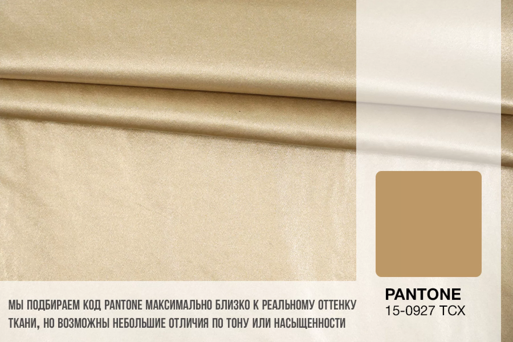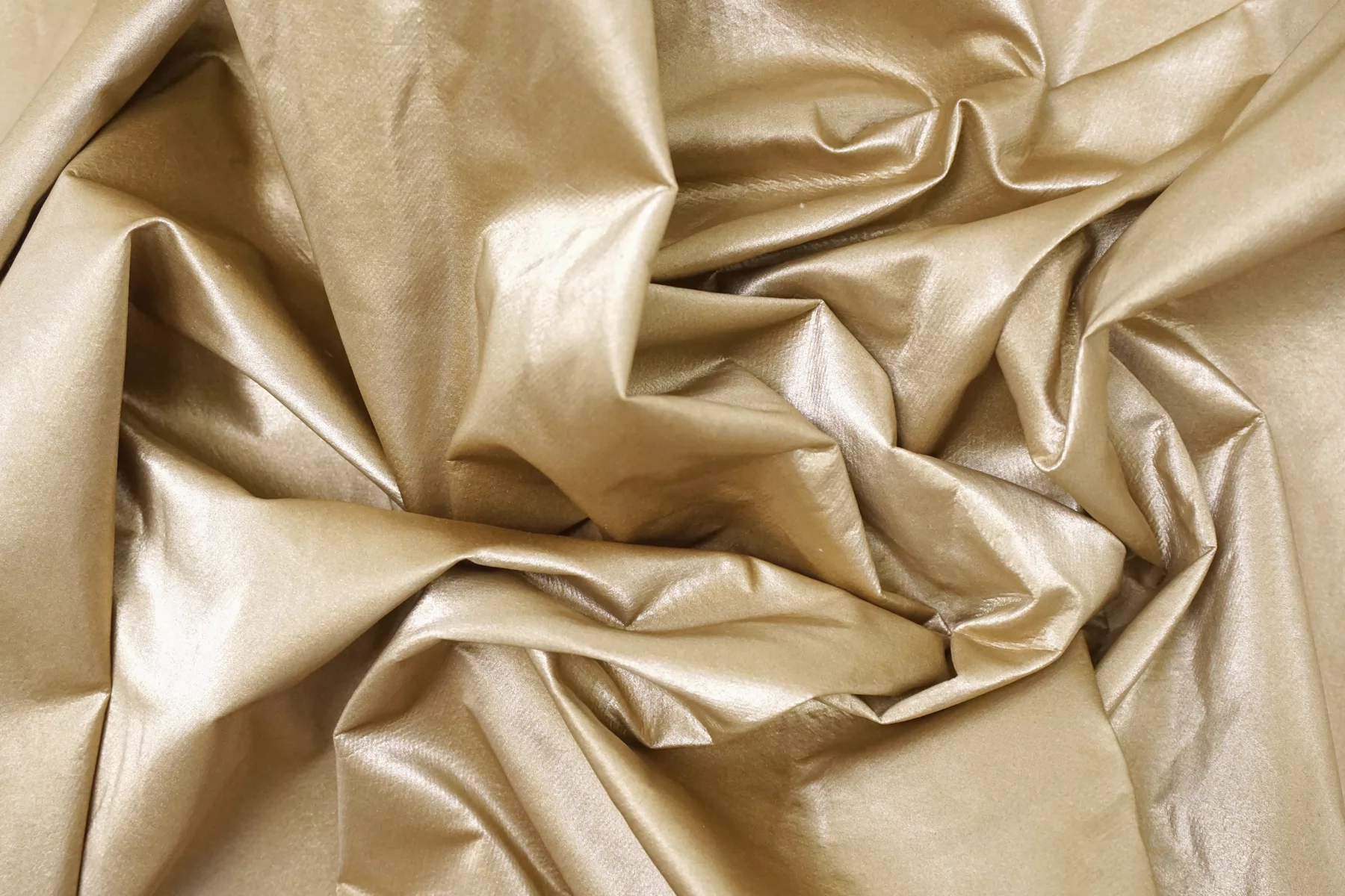 Ткань-лаке на вискозной основе. Цвет золотистый на лице, изнанка бежевая. Не просвечивает. Умеренной плотности, из-за натуральной основы может слегка мяться, но восстанавливается и хорошо отпаривается. Пластичная, с интересным лоском,не тянется. Мягкая, приятная как с лицевой, так и с изнаночной стороны. Пластичная, умеренно держит форму. Подойдет для пошива костюмно-плательной группы, плащей и ветровок. Не промокает.