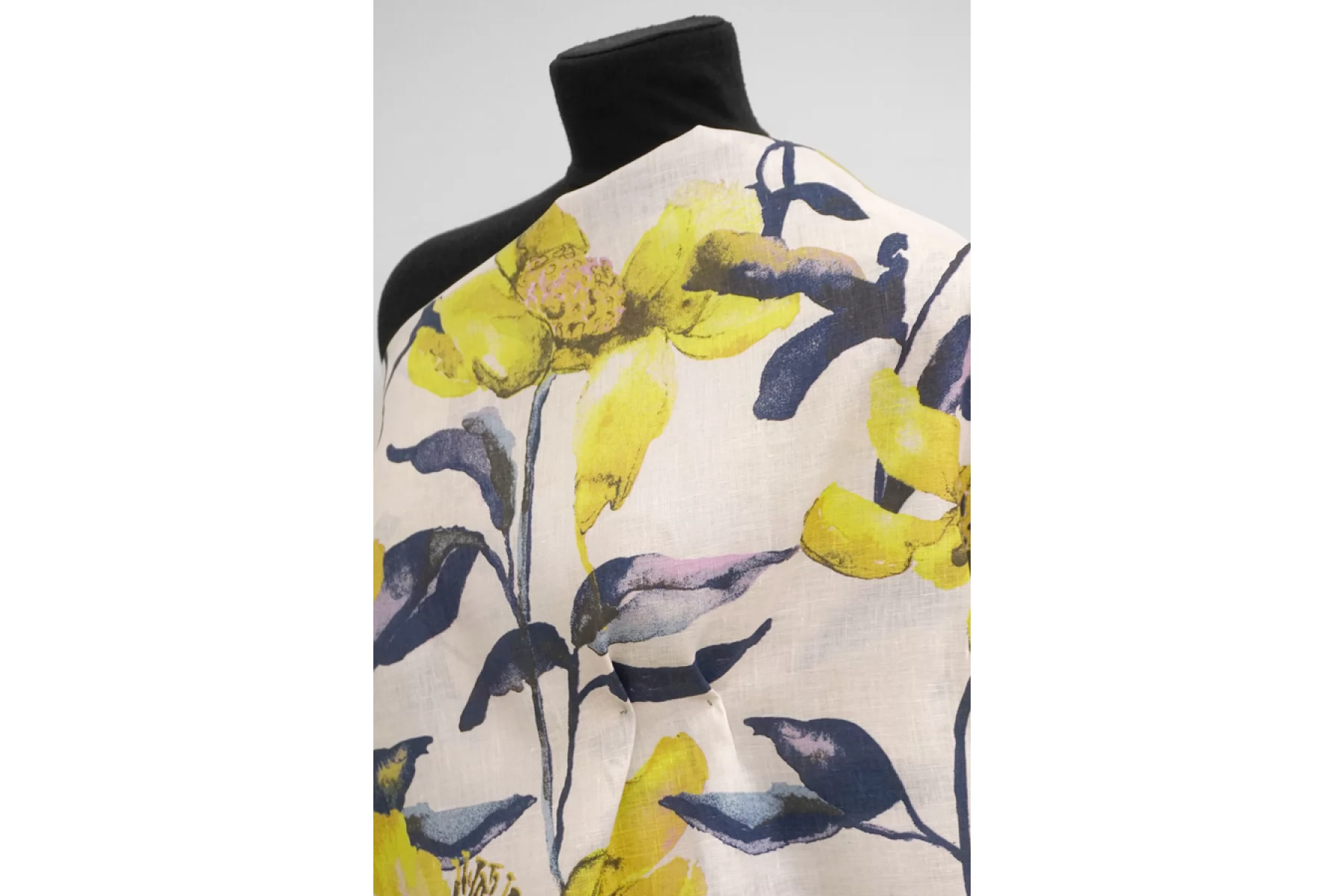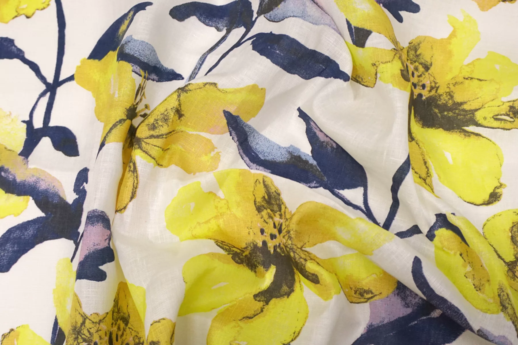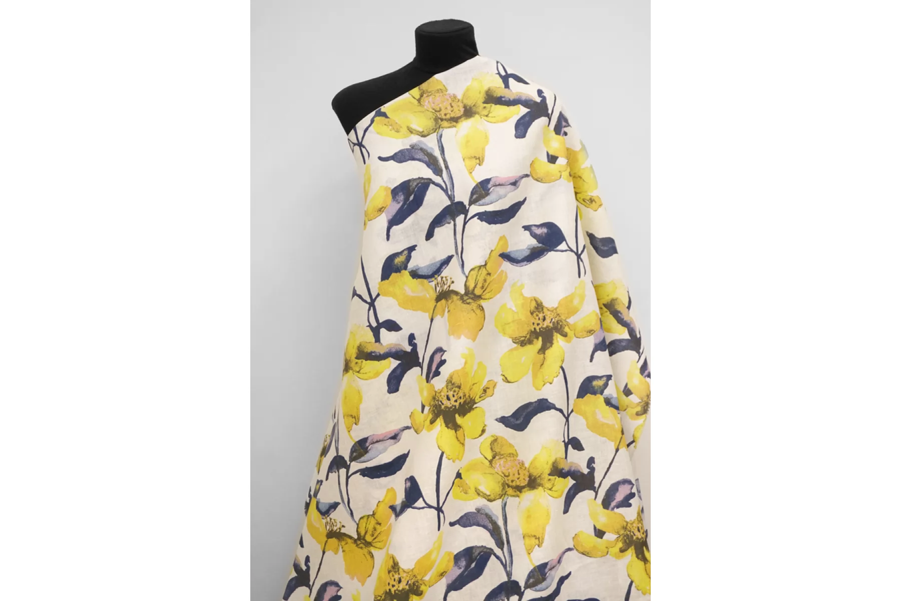 Плательный лён белого цвета с крупным цветочным принтом. Тактильно приятный, с совсем легкой сухостью льна, токний. С красивым лоском. Не тянется. Просвечивает. Хорошо драпируется и неплохо держит форму. Красив в пластике. Шьем костюмные варианты, платья, рубашки, брюки на резинке. При необходимости используйте подкладочный материал.