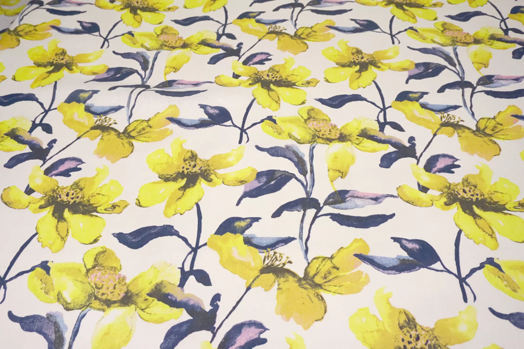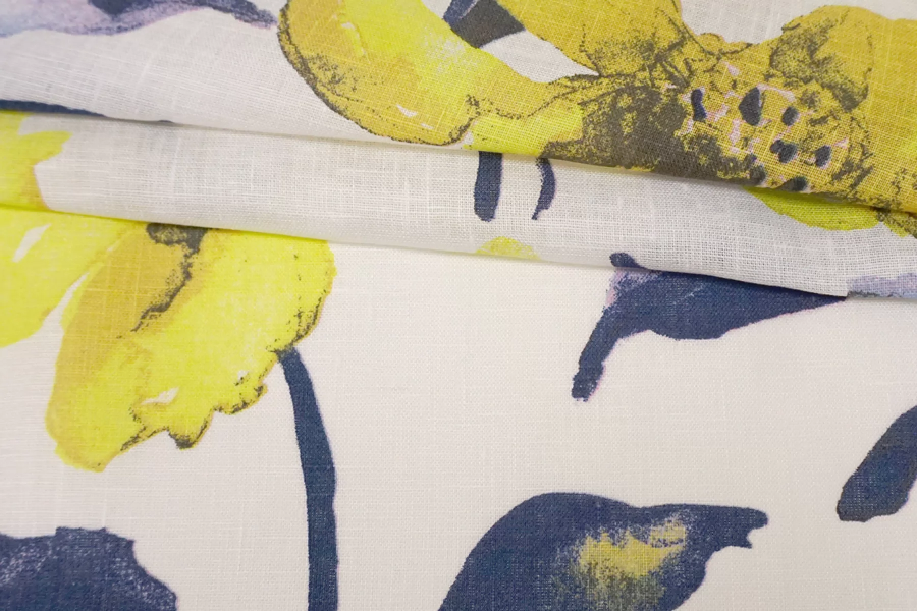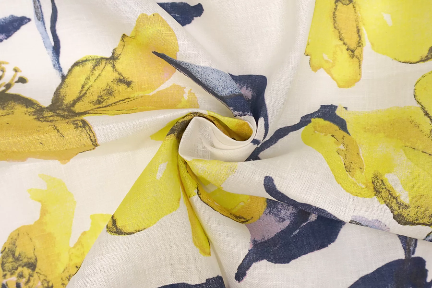 Плательный лён белого цвета с крупным цветочным принтом. Тактильно приятный, с совсем легкой сухостью льна, токний. С красивым лоском. Не тянется. Просвечивает. Хорошо драпируется и неплохо держит форму. Красив в пластике. Шьем костюмные варианты, платья, рубашки, брюки на резинке. При необходимости используйте подкладочный материал.