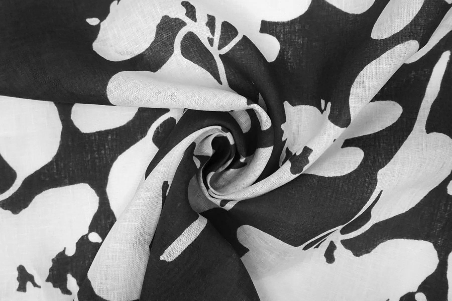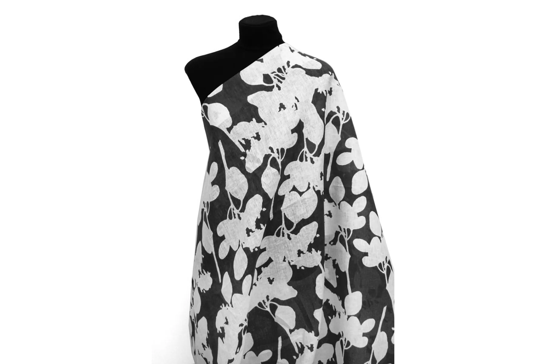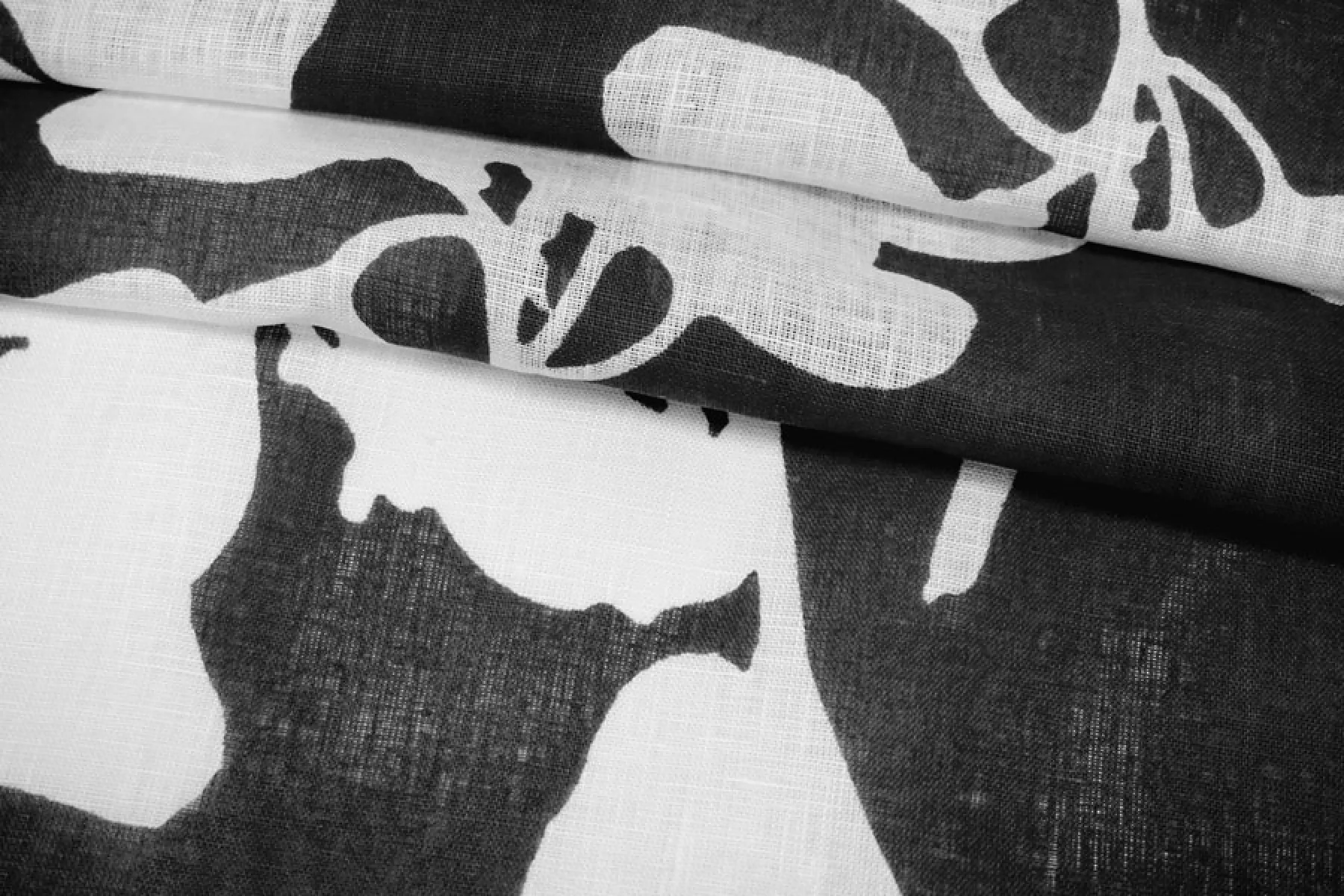 Плательный лён белого цвета с крупным цветочным черным принтом. Тактильно приятный, с совсем легкой сухостью льна, токний. С красивым лоском. Не тянется. Просвечивает. Хорошо драпируется и неплохо держит форму. Красив в пластике. Шьем костюмные варианты, платья, рубашки, брюки на резинке. При необходимости используйте подкладочный материал.