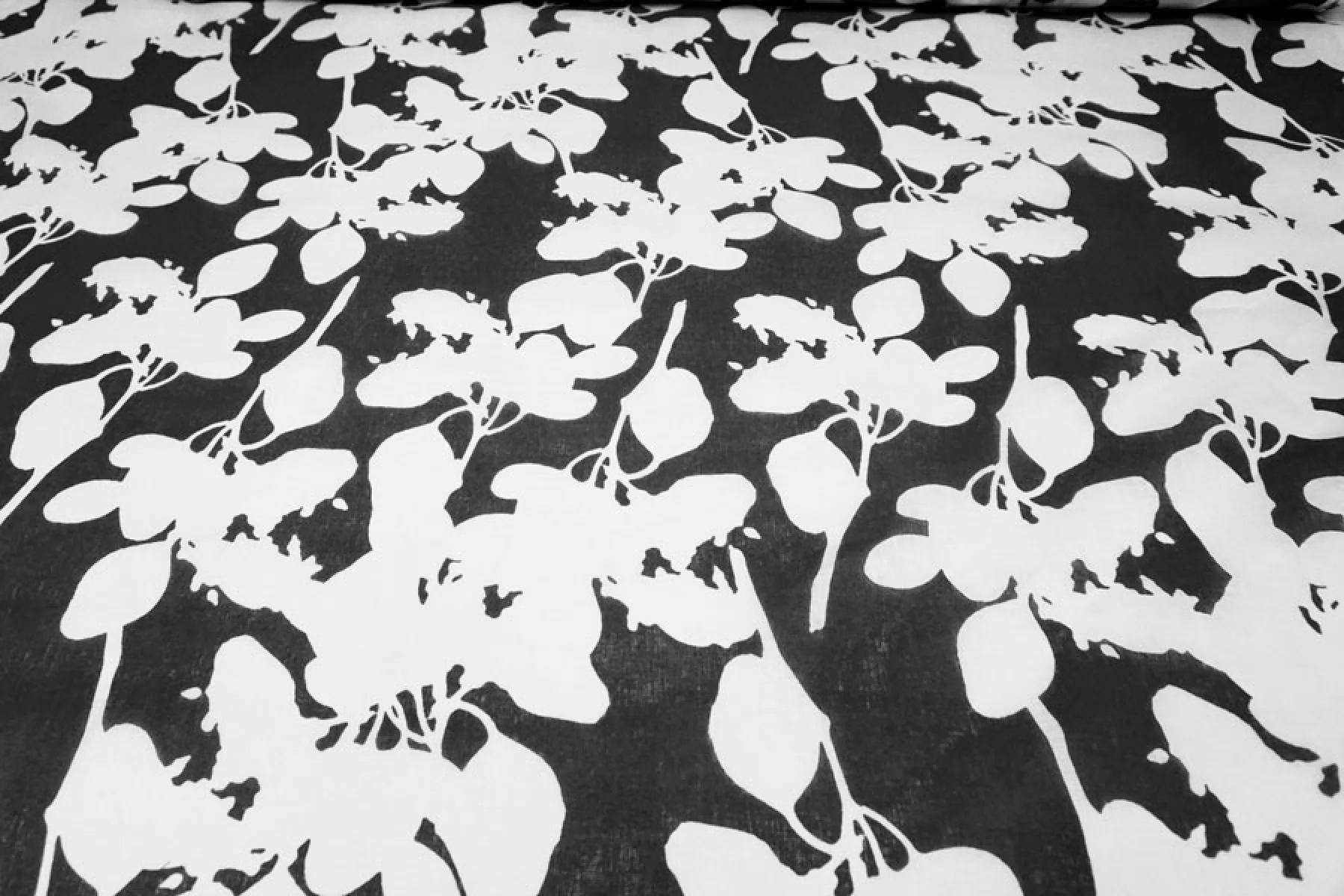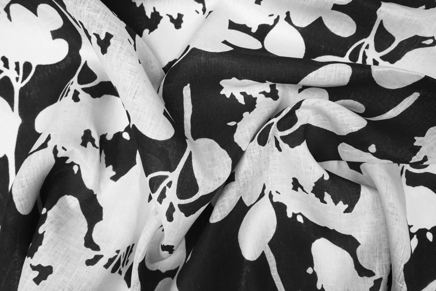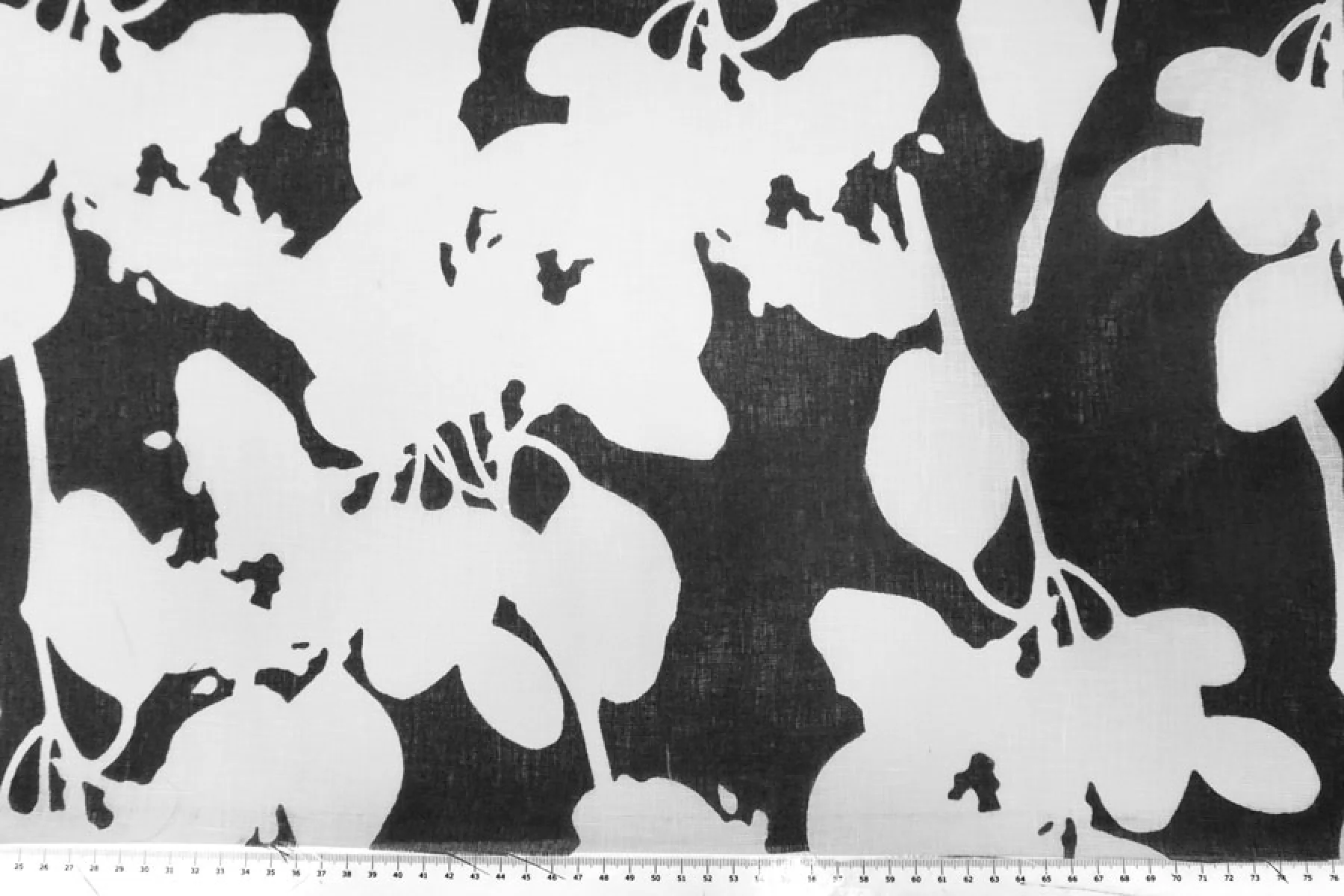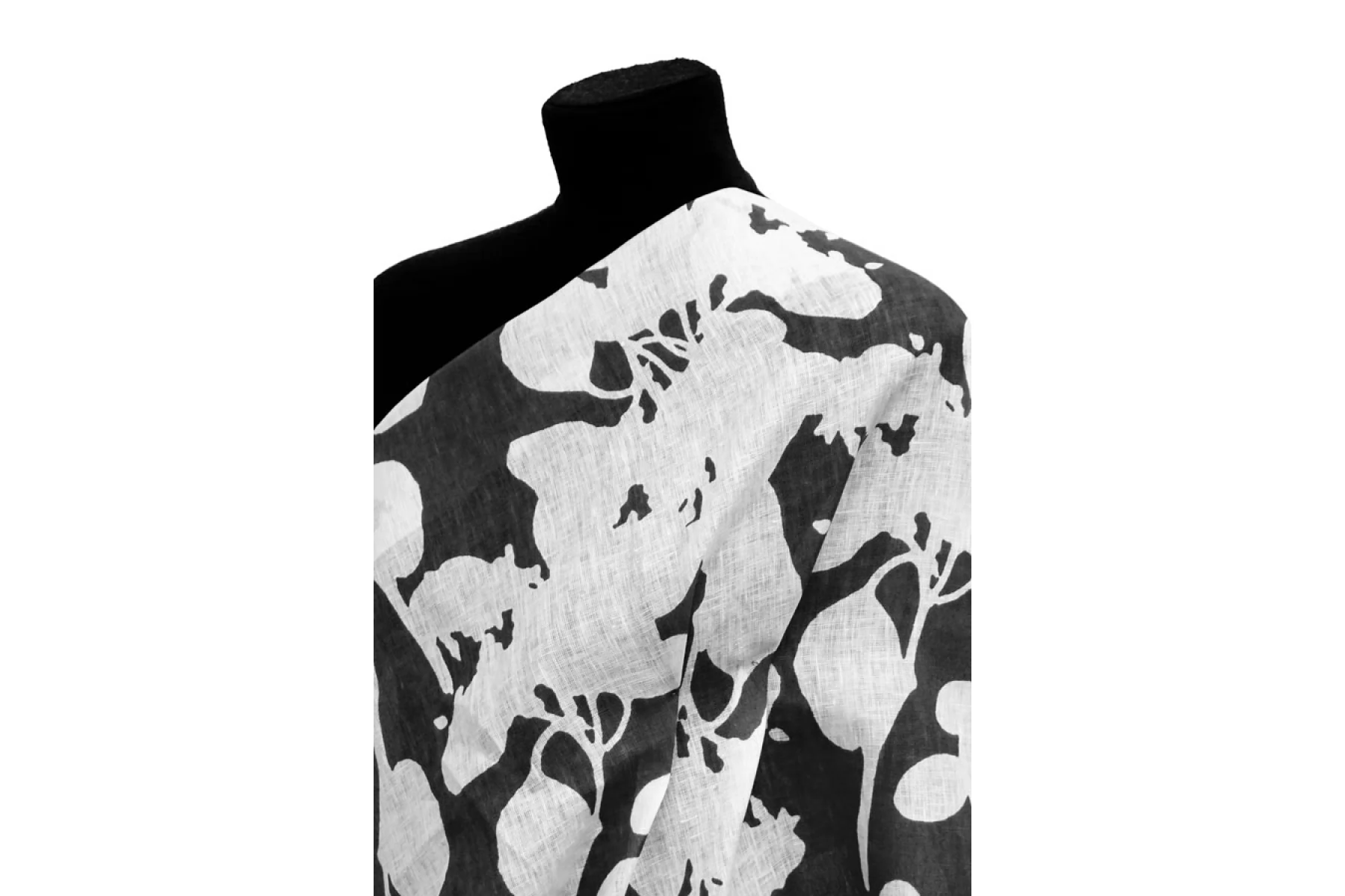 Плательный лён белого цвета с крупным цветочным черным принтом. Тактильно приятный, с совсем легкой сухостью льна, токний. С красивым лоском. Не тянется. Просвечивает. Хорошо драпируется и неплохо держит форму. Красив в пластике. Шьем костюмные варианты, платья, рубашки, брюки на резинке. При необходимости используйте подкладочный материал.