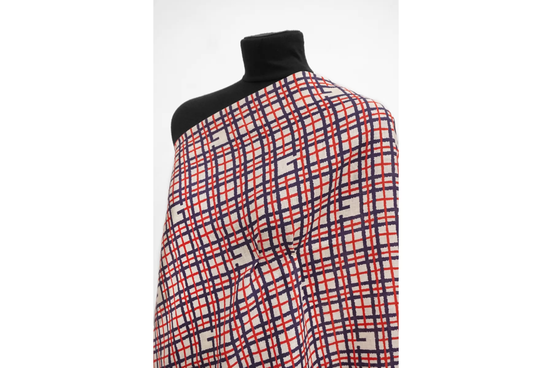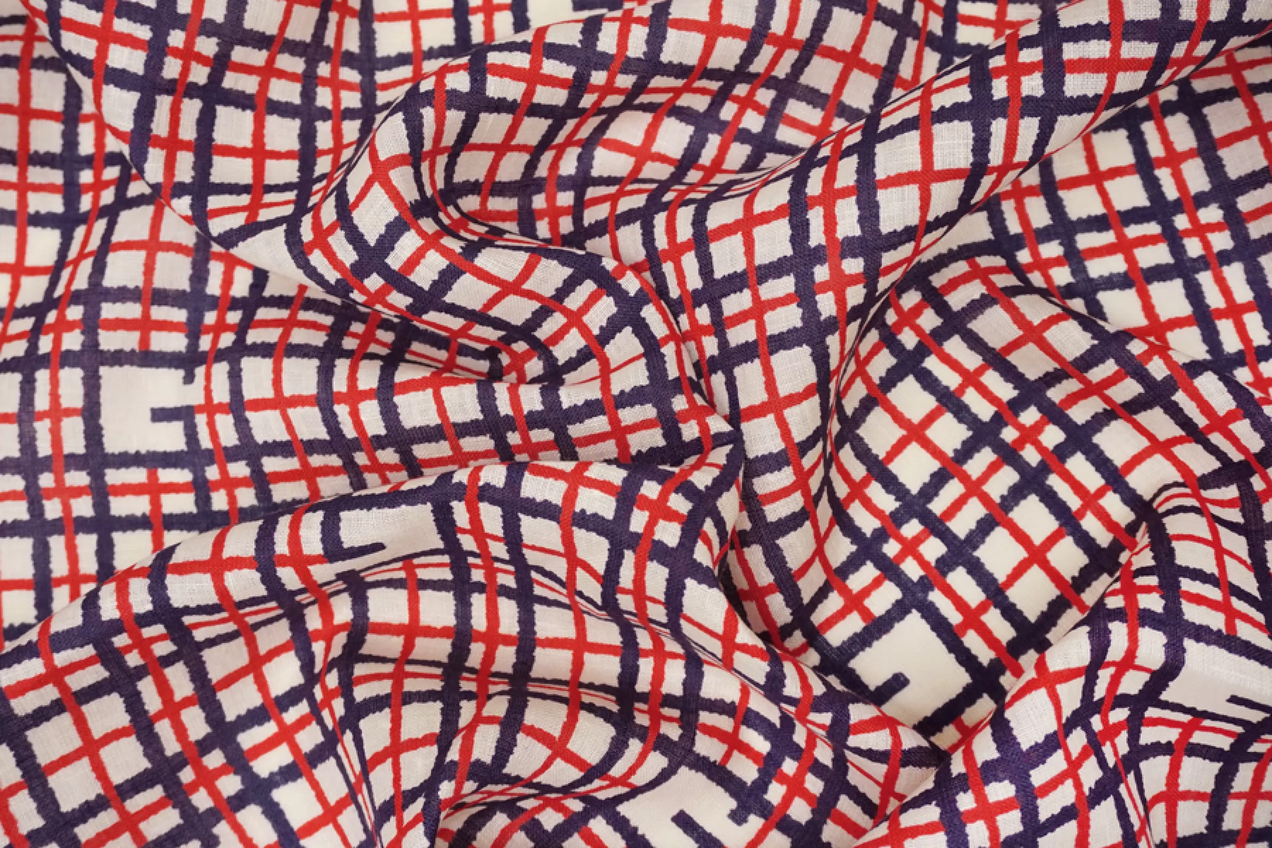 Классный плательно-рубашечный лён от Gucci. В основе светло-бежевый оттенок с узором абстрактной клетки и буквы G в оттенках синего с фиолетовым подтоном и ягодного красного. Тактильно приятный. Обладает легкой сухостью льна. Плетение слегка разрежено (но не рыхлое), в связи с чем немного заметен силуэт. Не тянется. Сминается. Пластичный. Хорошо драпируется и держит форму. Прекрасно подойдет на рубашки, платья, юбки. При необходимости используйте подкладочный материал.