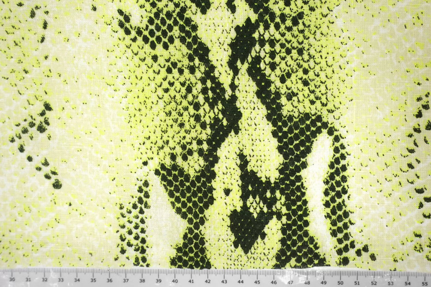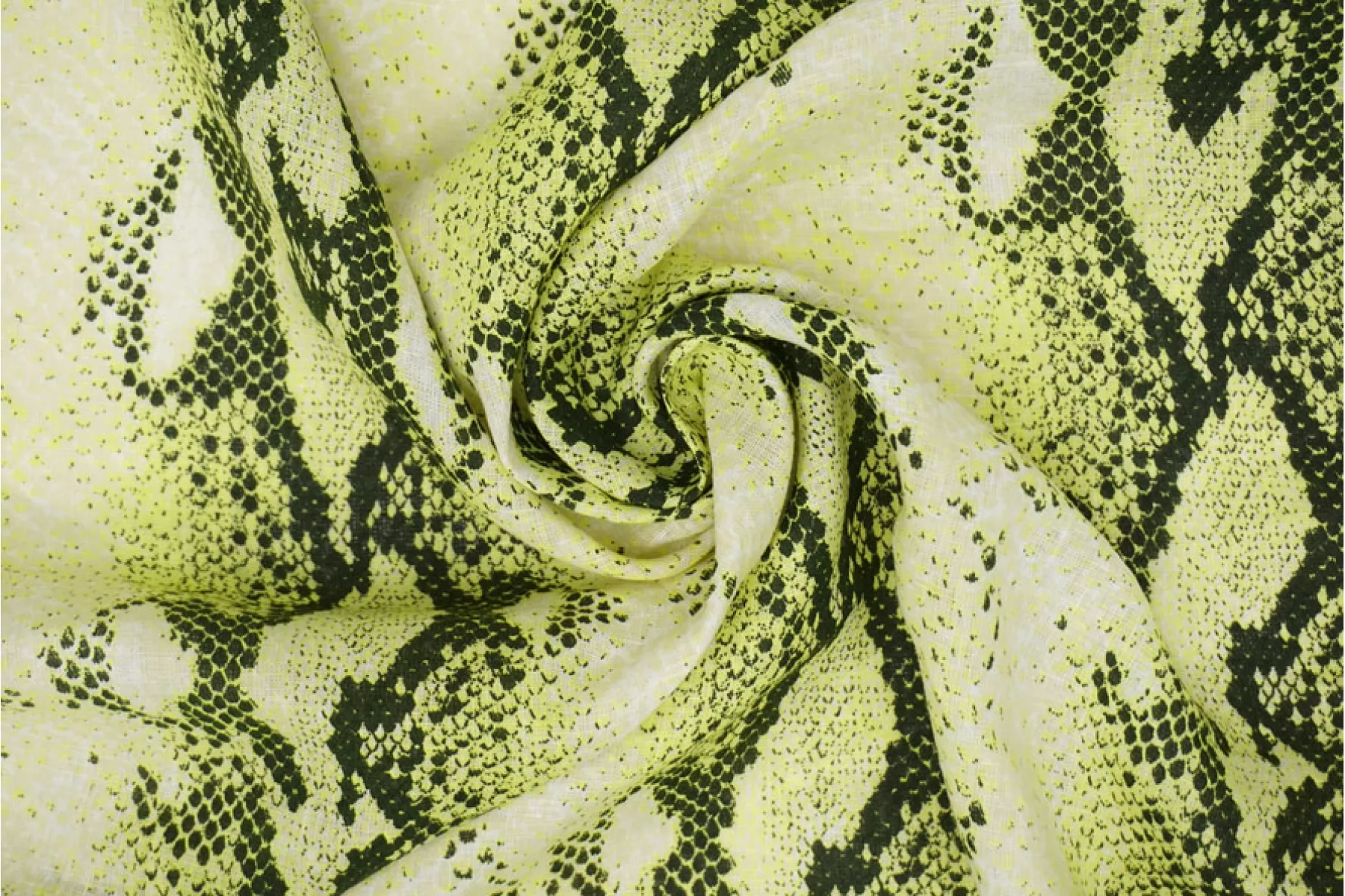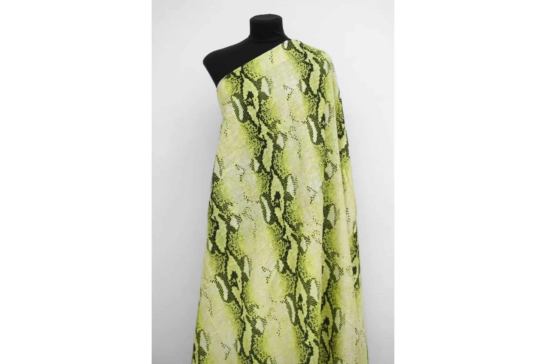 Очень красивый, яркий костюмно-плательный лён в оттенках темно-зеленого, бежевого и желто-салатового с принтом рептилии. Плетение - полотняное. Мягкий, слегка суховатый, пластичный, тонкий. Не тянется. Мнется. Неплохо, объемно держит форму. Немного просвечивает за счет слегка разряженного плетения. На платья, рубашки, костюмные варианты, юбки и не только. При необходимости используйте подкладочный материал. Учитывайте усадку.