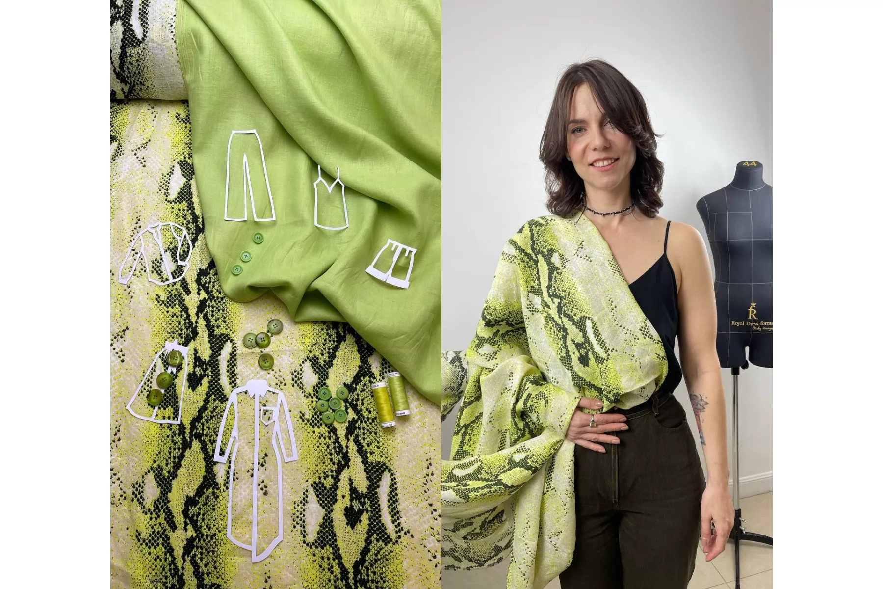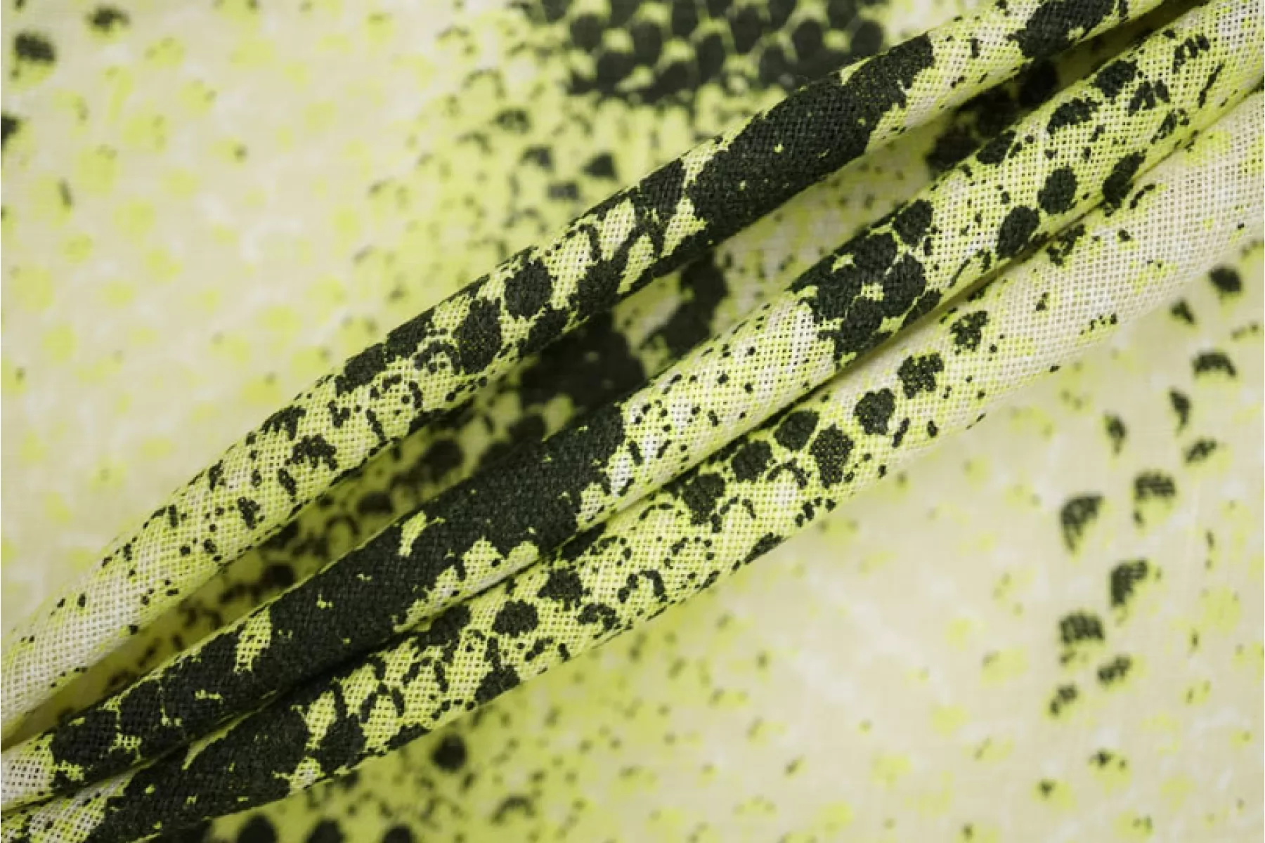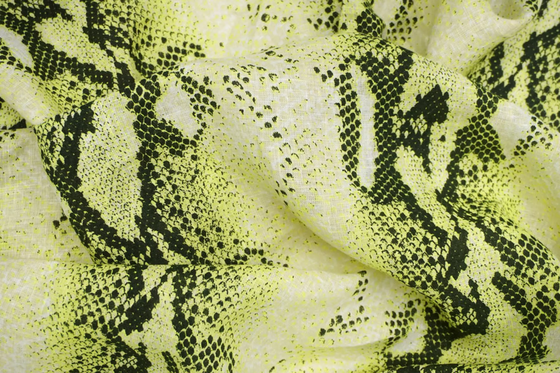 Очень красивый, яркий костюмно-плательный лён в оттенках темно-зеленого, бежевого и желто-салатового с принтом рептилии. Плетение - полотняное. Мягкий, слегка суховатый, пластичный, тонкий. Не тянется. Мнется. Неплохо, объемно держит форму. Немного просвечивает за счет слегка разряженного плетения. На платья, рубашки, костюмные варианты, юбки и не только. При необходимости используйте подкладочный материал. Учитывайте усадку.