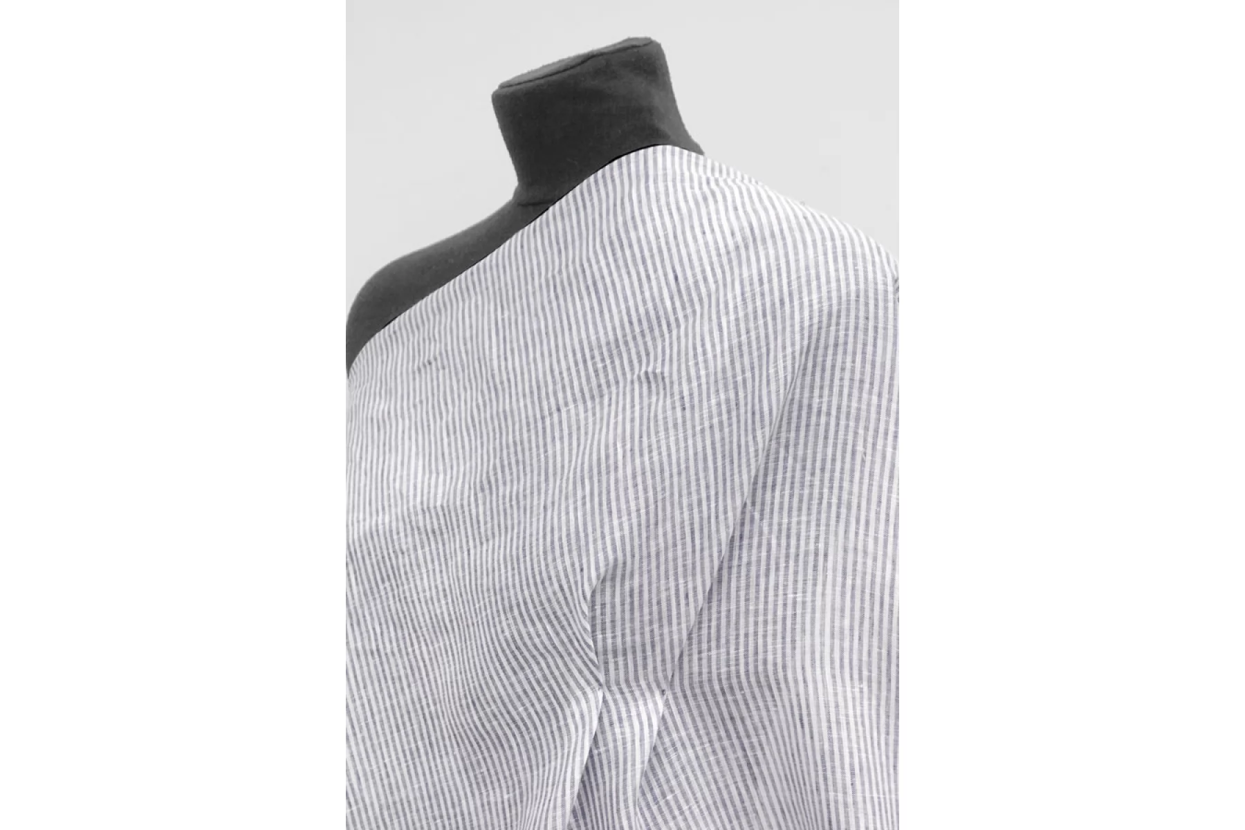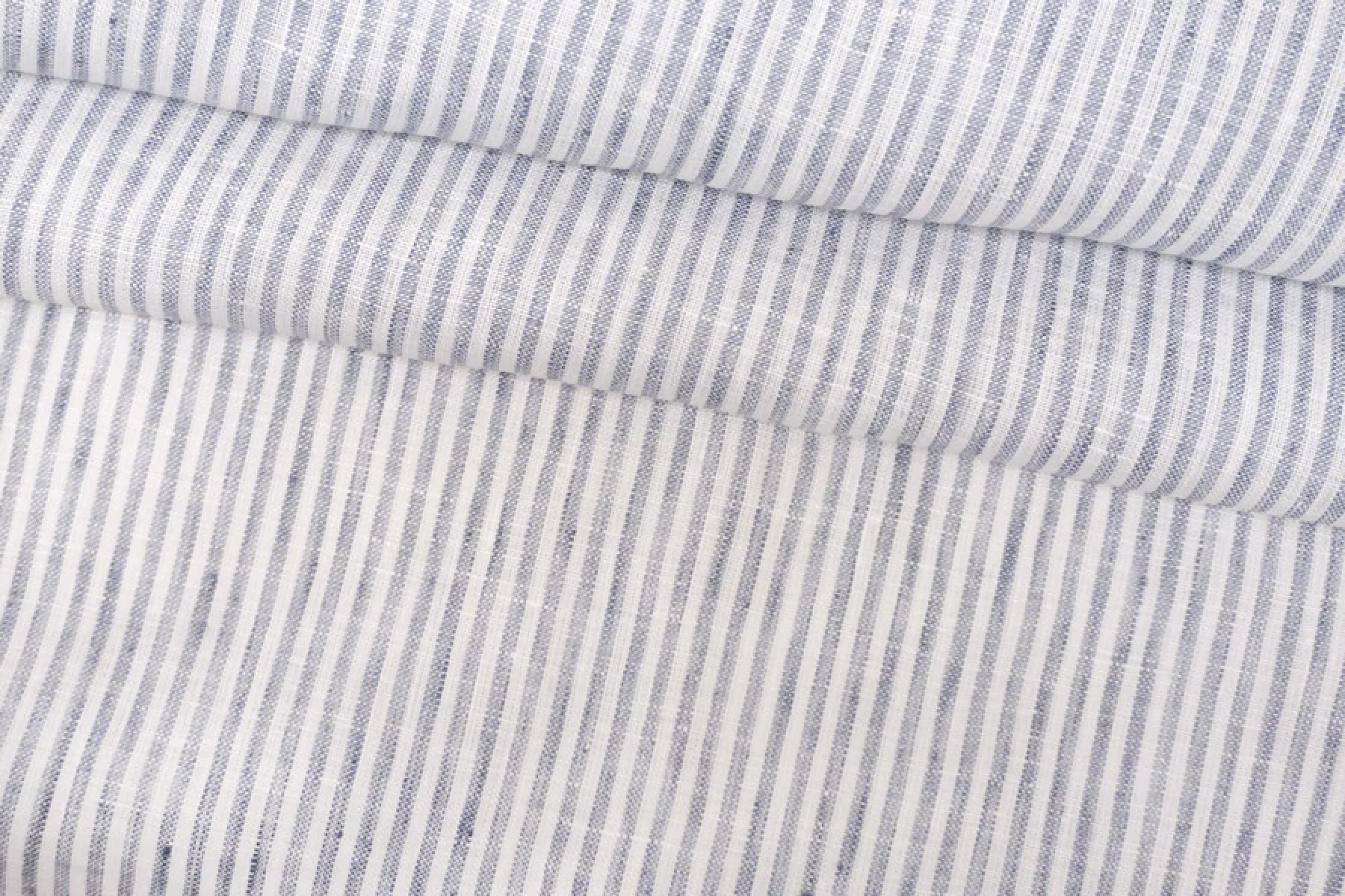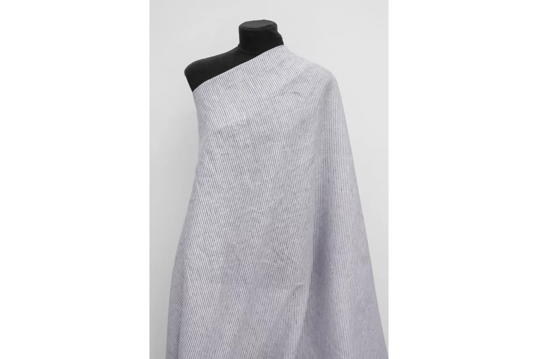 Классный плательно-рубашечный лён в узкую серо-голубую полоску Тактильно суховатый, с уплотнения. Тонкий приятный наоущпь. Мягкий. Просвечивает. Форму немного держит. Не тянется. Тактильно мягкий, приятный. Немного просвечивает. Не тянется. Хорошо драпируется. Отличный вариант на летние платья, рубашки, жакеты, брюки на резинке. При необходимости используйте подкладочный материал. Учитывайте возможную усадку.