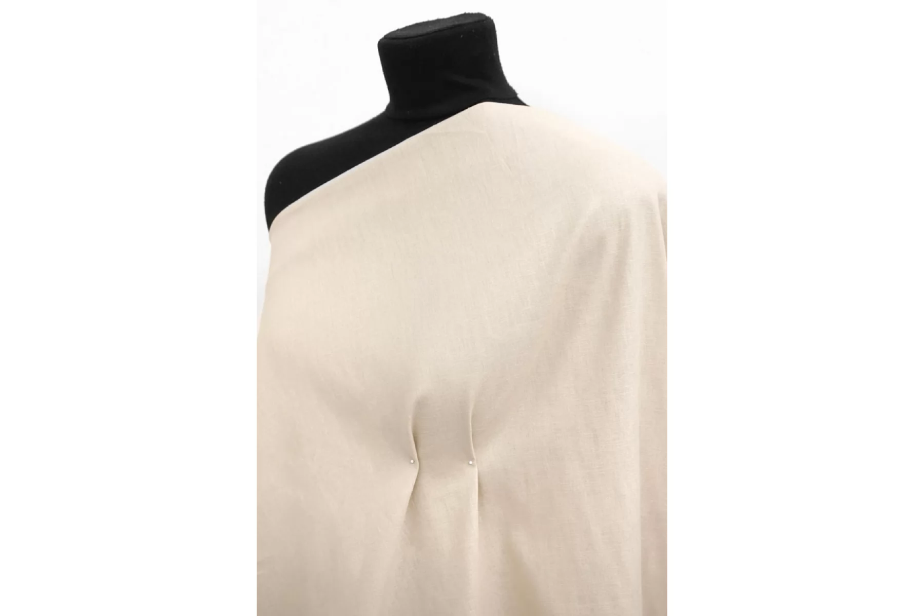 Плательно-рубашечный лён полотняного переплетения в светлом, слегка приглушенном, бежевом оттенке. Тонкий, пластичный, суховатый. Слегка пружинит за счет плетения. Отлично драпируется. Хорошо держит форму. Слегка читается силуэт. Мнется. Отлично подойдет на костюмы, платья, юбки, кимоно, рубашки.