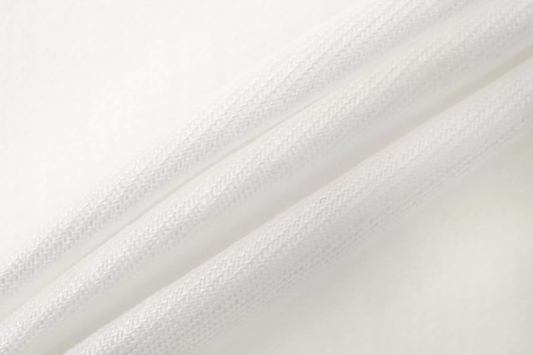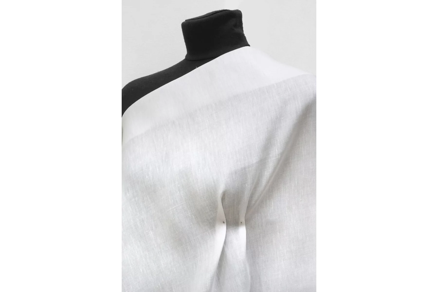 Плательный лён белого цвета, диагонального плетения. С классическими для льна утолщениями нити. Просвечивает силуэт. Немного держит форму, образовывает красивые объемные складки. Тактильно суховат. Не тянется. Мнется. Вариант на летние платья, рубашки, юбки и не только. При необходимости используйте подкладочный материал.