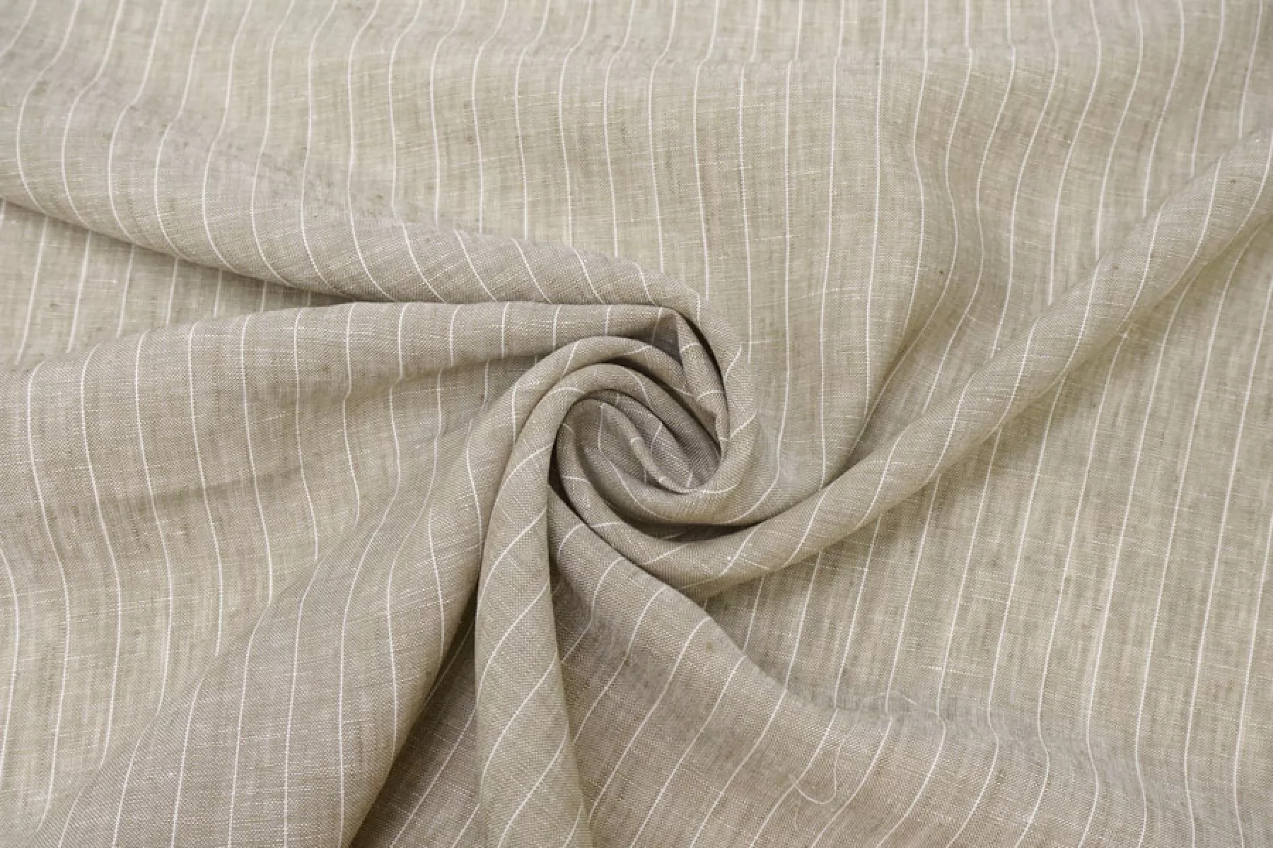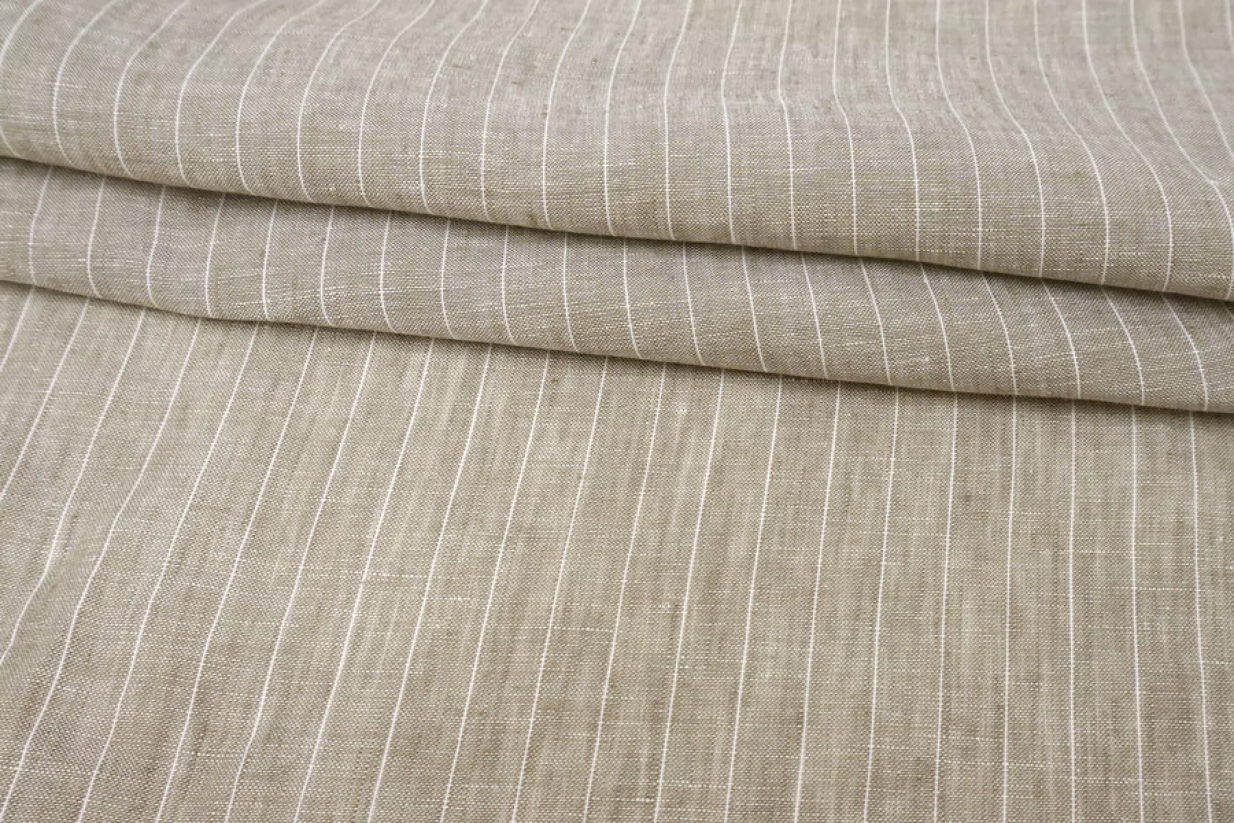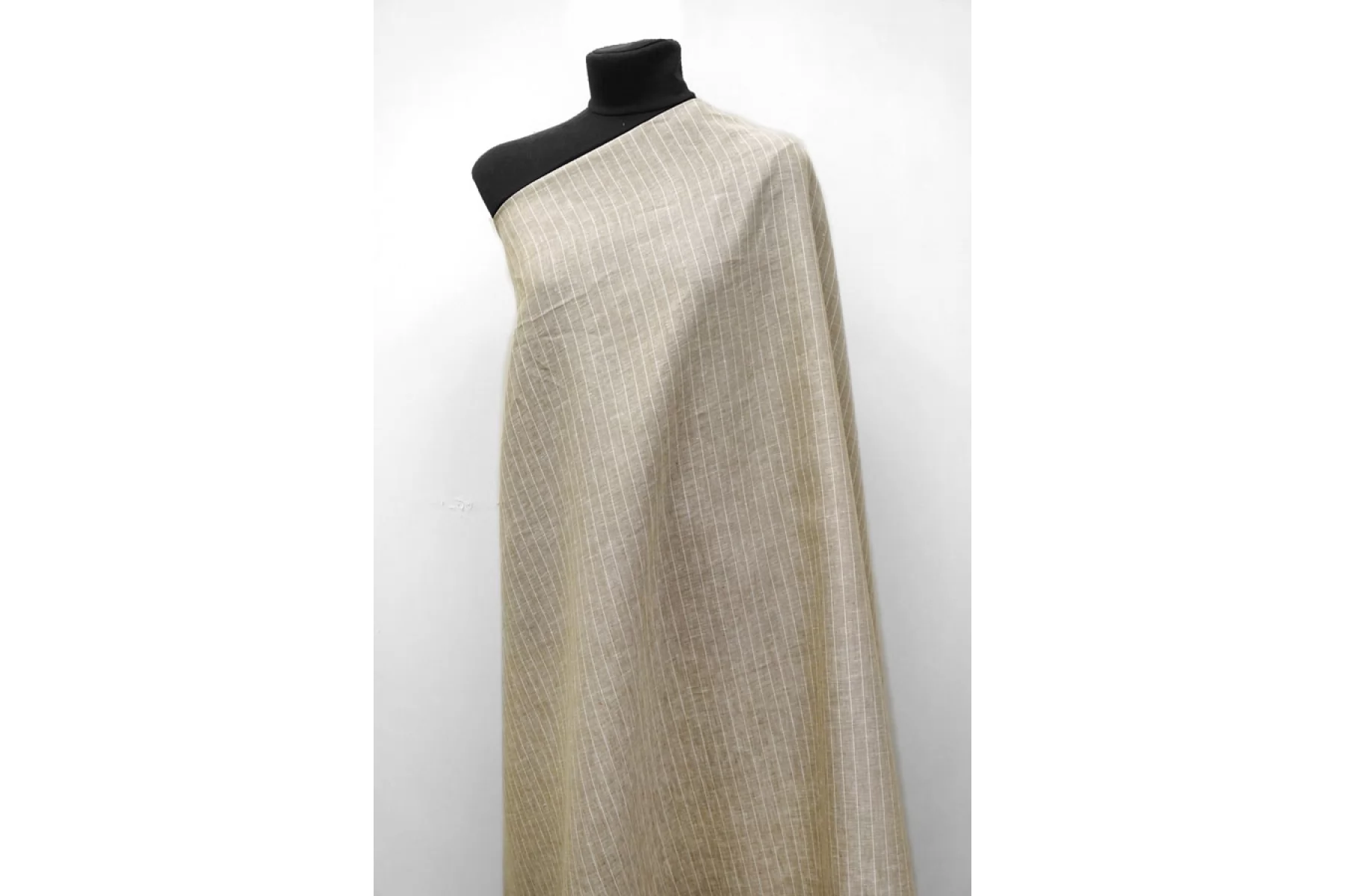 Плательный лён серо-бежевого цвета в тонкую белую полоску. Полосы вдоль кромки. С классическими для льна утолщениями нити. Просвечивает силуэт. Немного держит форму. Тактильно суховат. Не тянется. Мнется. Вариант на летние платья, рубашки, тонкие летние брюки, юбки и не только. При необходимости используйте подкладочный материал.