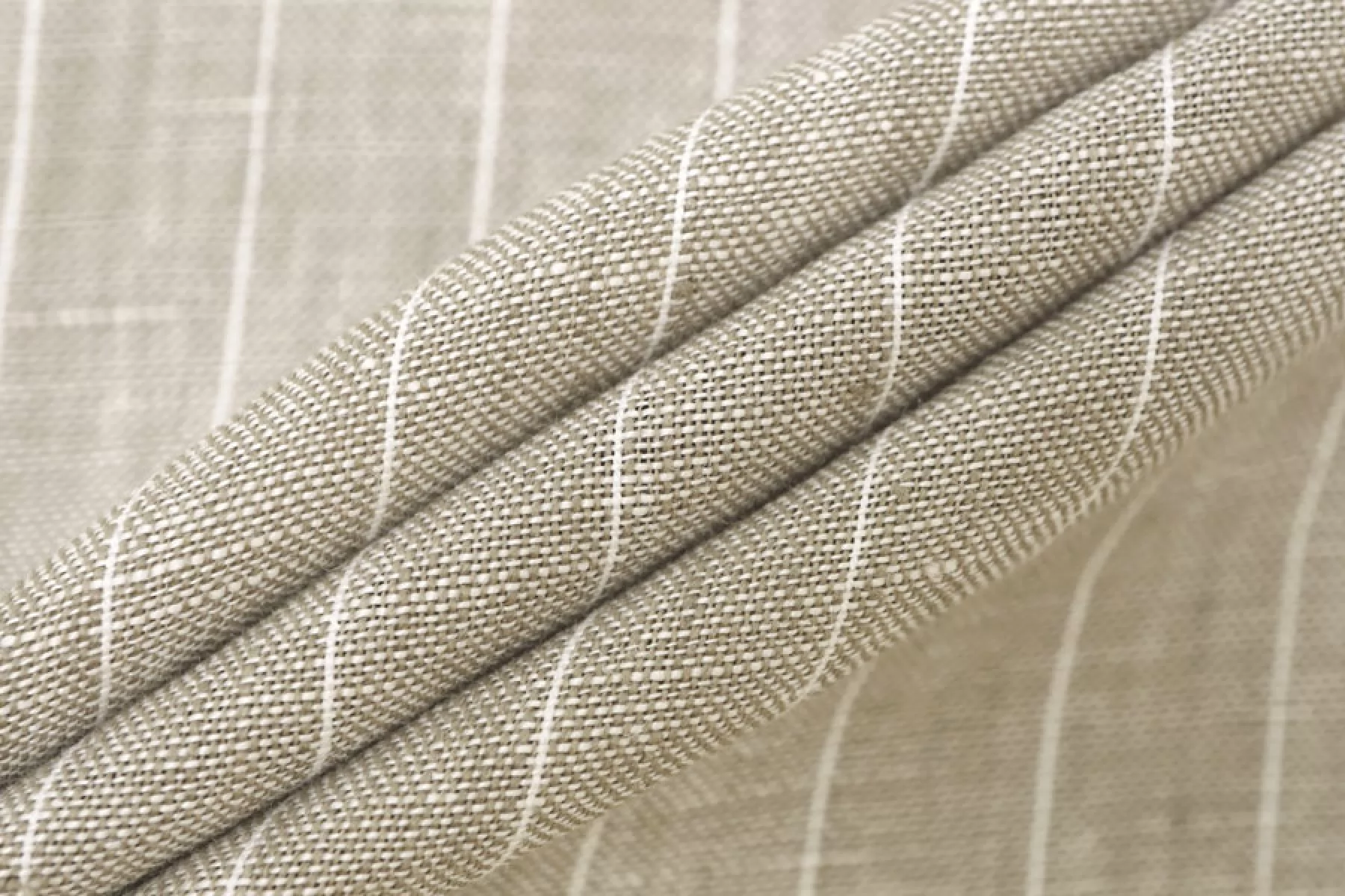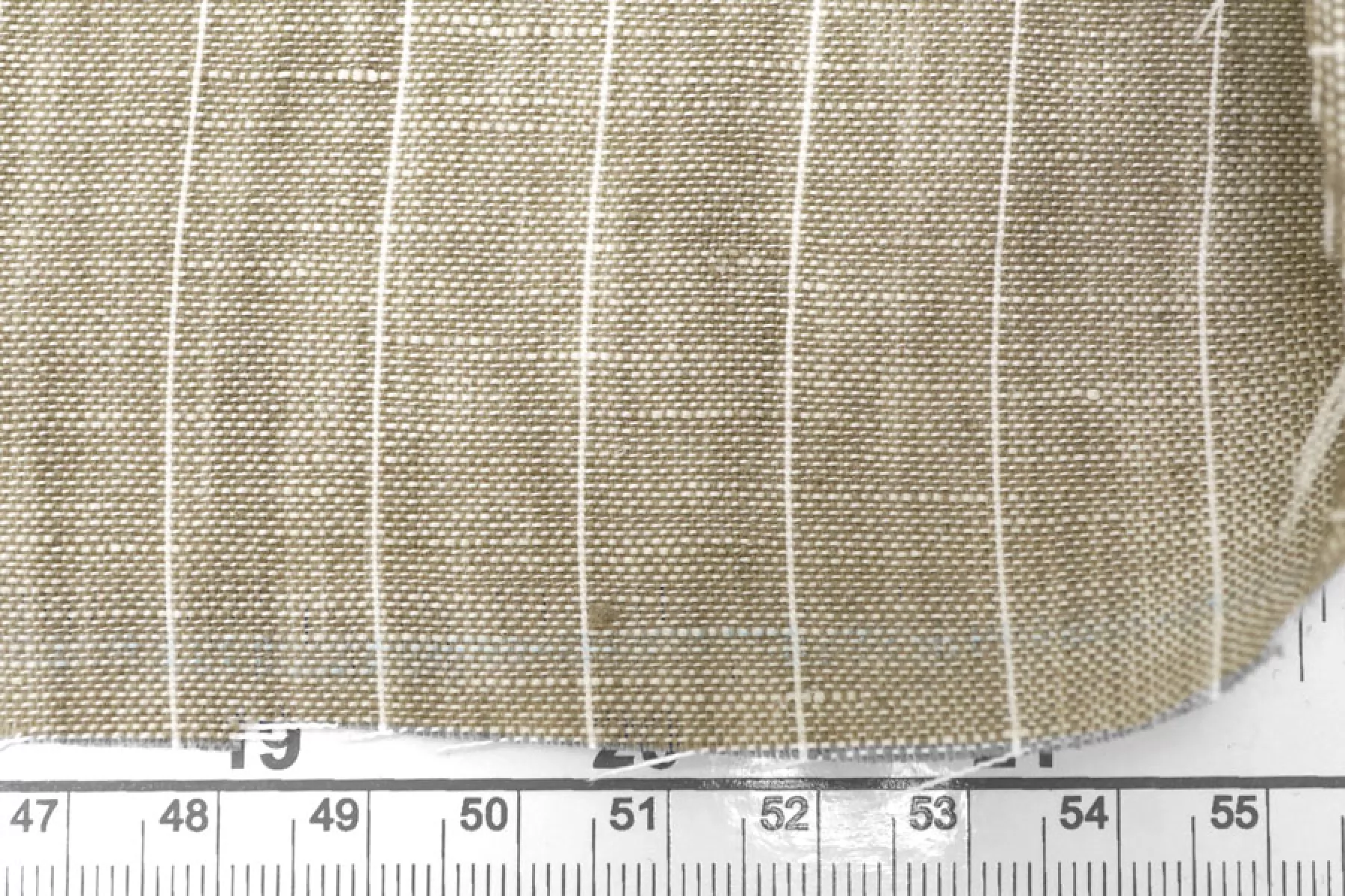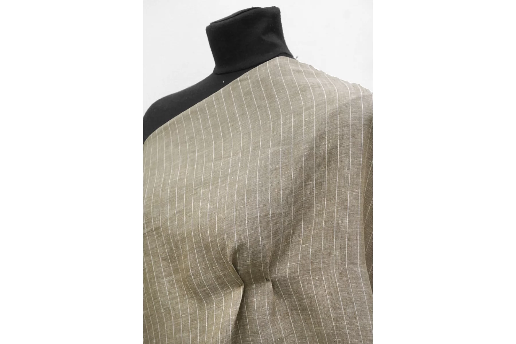 Плательный лён серо-бежевого цвета в тонкую белую полоску. Полосы вдоль кромки. С классическими для льна утолщениями нити. Просвечивает силуэт. Немного держит форму. Тактильно суховат. Не тянется. Мнется. Вариант на летние платья, рубашки, тонкие летние брюки, юбки и не только. При необходимости используйте подкладочный материал.