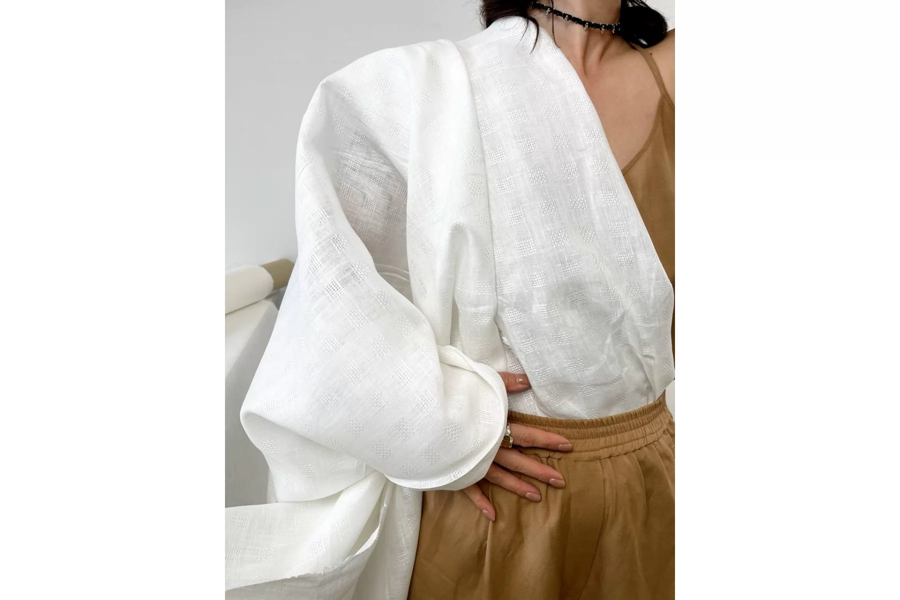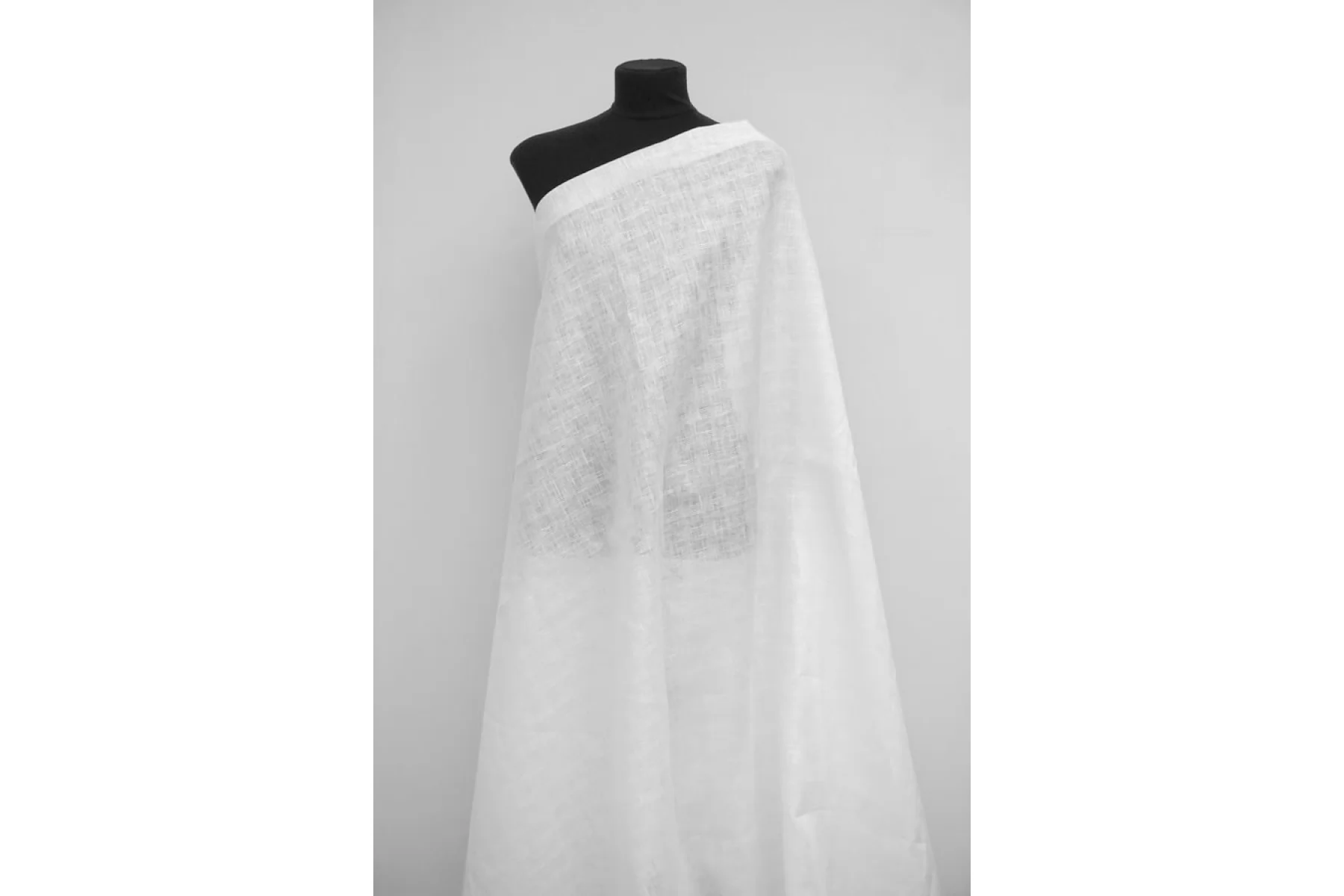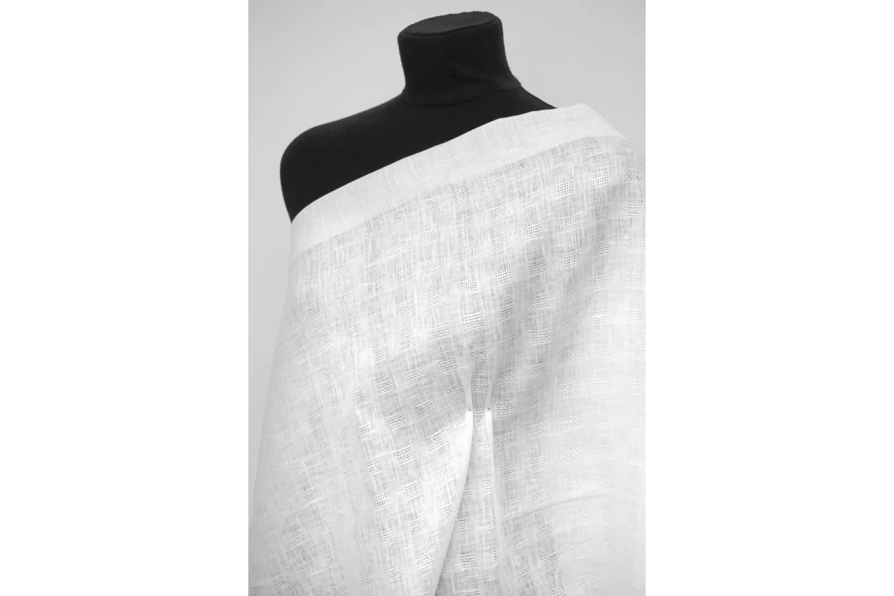 Лен рубашечно-плательный белого цвета, с красивым легким блеском. Плетение разреженное. Тактильно материал приятный, гладкий, нет суховатости, свойственной льну, но есть уплотнения. Не тянется. Мнется. Просвечивает. Отлично держит форму. Красивый вариант на платья, рубашки, юбки, идеально на лето. При необходимости используйте подкладочный материал. Учитывайте усадку материала.