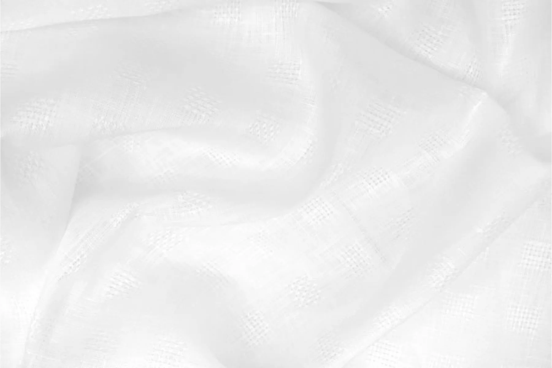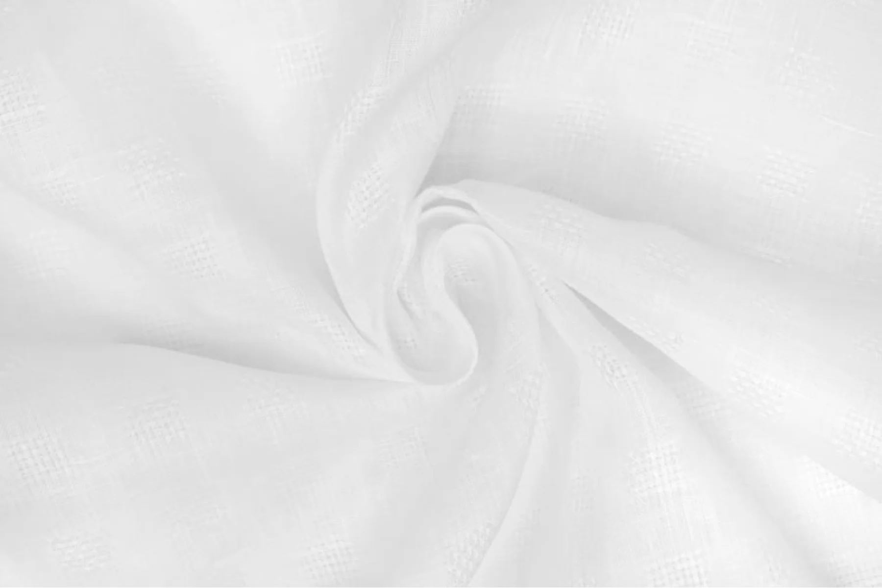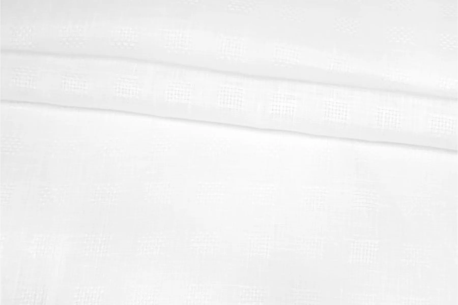 Лен рубашечно-плательный белого цвета, с красивым легким блеском. Плетение разреженное. Тактильно материал приятный, гладкий, нет суховатости, свойственной льну, но есть уплотнения. Не тянется. Мнется. Просвечивает. Отлично держит форму. Красивый вариант на платья, рубашки, юбки, идеально на лето. При необходимости используйте подкладочный материал. Учитывайте усадку материала.