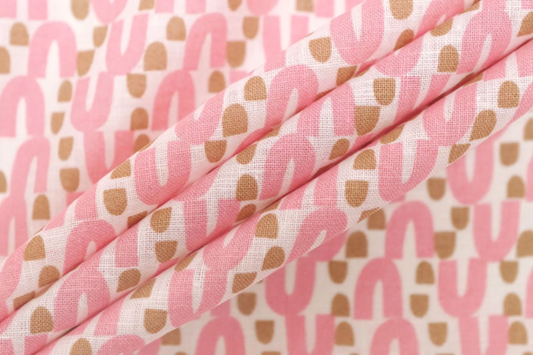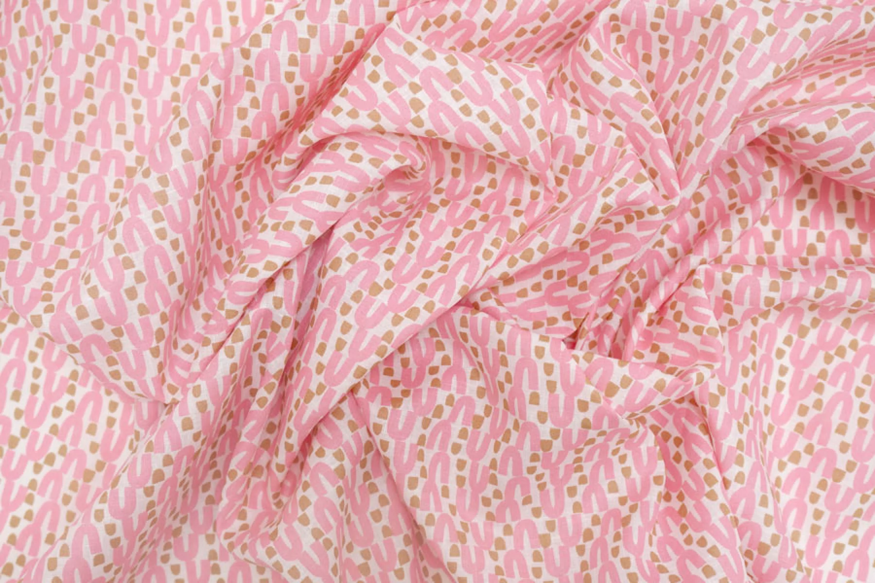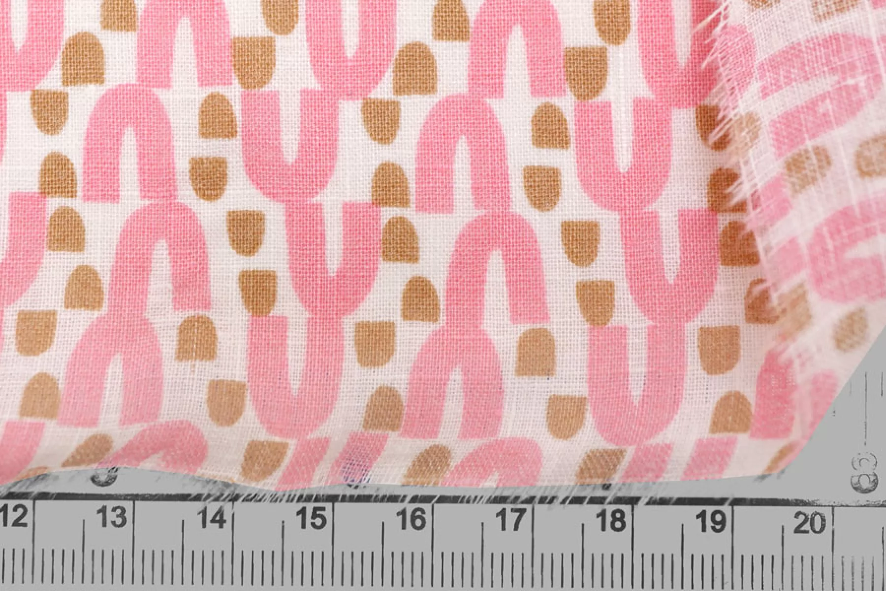 Прекрасный рубашечный лен с хлопком от бренда Max Mara с мелким принтом в виде абстракции розового цвета и цвета охры. Приятная и мягкая наощупь, гладкая. Чуть-чуть тянется плетение. Слегка просвечивает. Сминается. Форму немного держит. Отличный летний вариант на платья или рубашки. Учитывайте возможную усадку.