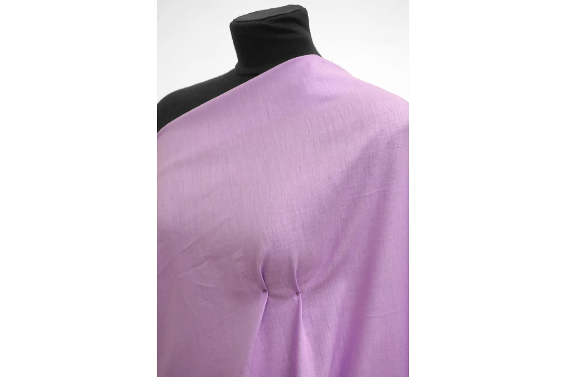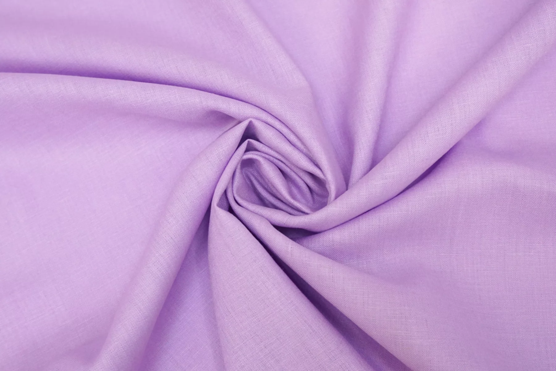 Плательный лён с вискозой полотняного плетения лилового цвета. Материал мягкий, гладкий, с красивыми пластикой и блеском. Есть уплотнения свойственные льну. Мнется. Просвечивает, если смотреть прямо на просвет. Плетение не плотное. Не тянется. Прекрасно подойдет на платья, рубашки, юбки и кимоно.
