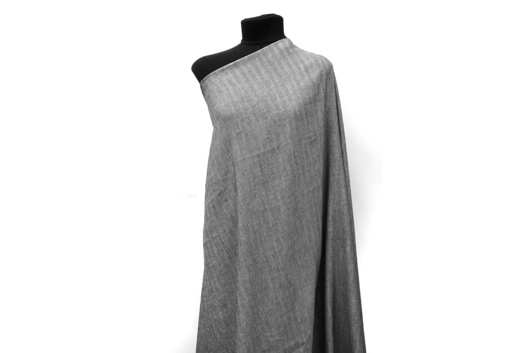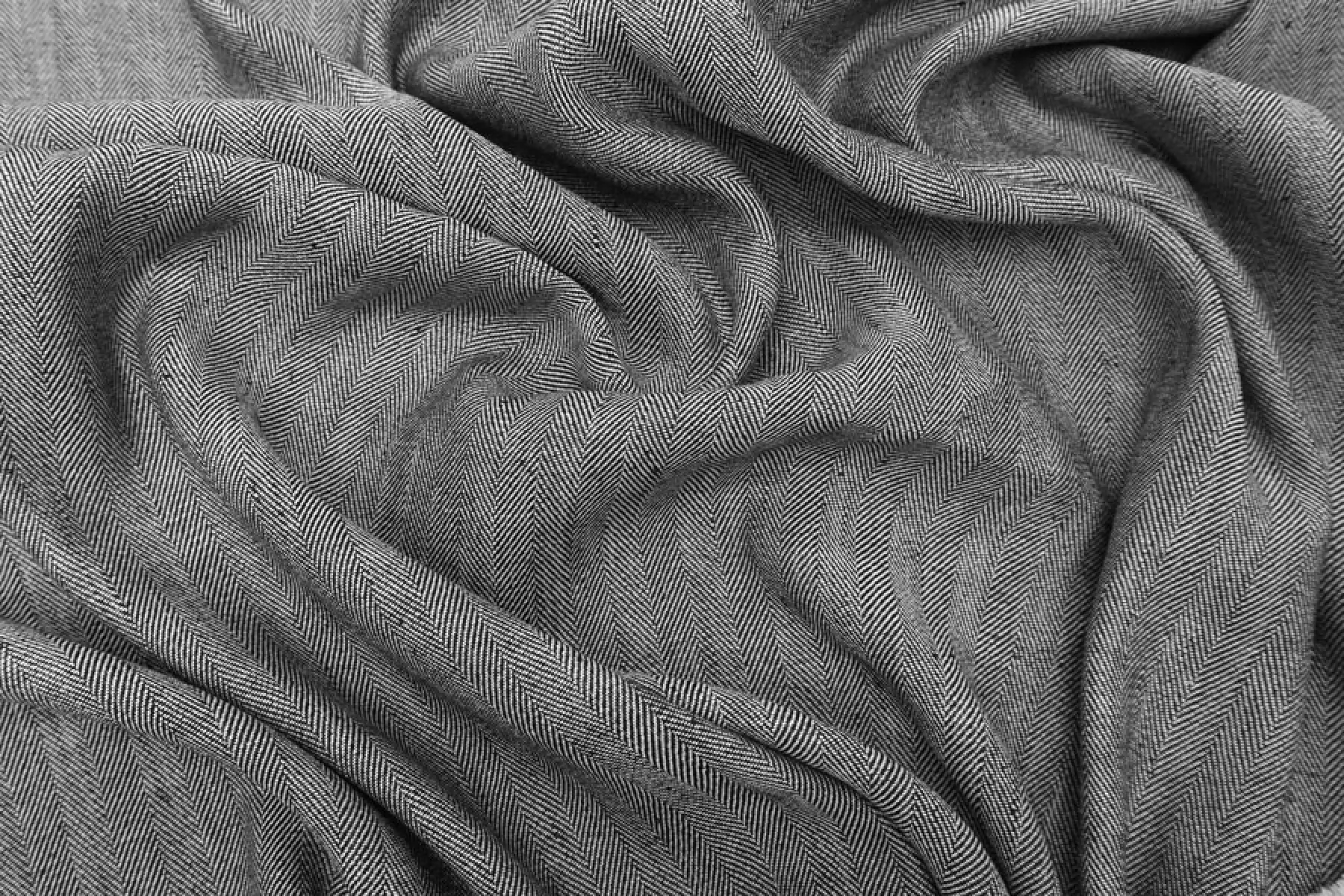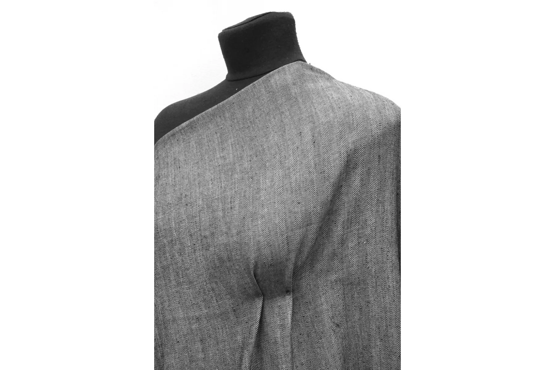 Плательно-костюмный лён с добавлением вискозы и хлопка, нити черного и белого цвета, узор - елочка. Напоминает твид. С классическими для льна утолщениями нити. Не тянется, не просвечивает. Мягкий, тактильно слегка суховат, сминаемость средняя. Пластичный, форму практически не держит. Вариант на летние костюмы, платья, рубашки, юбки и не только. Если кожа чувствительная, может понадобиться подкладка.