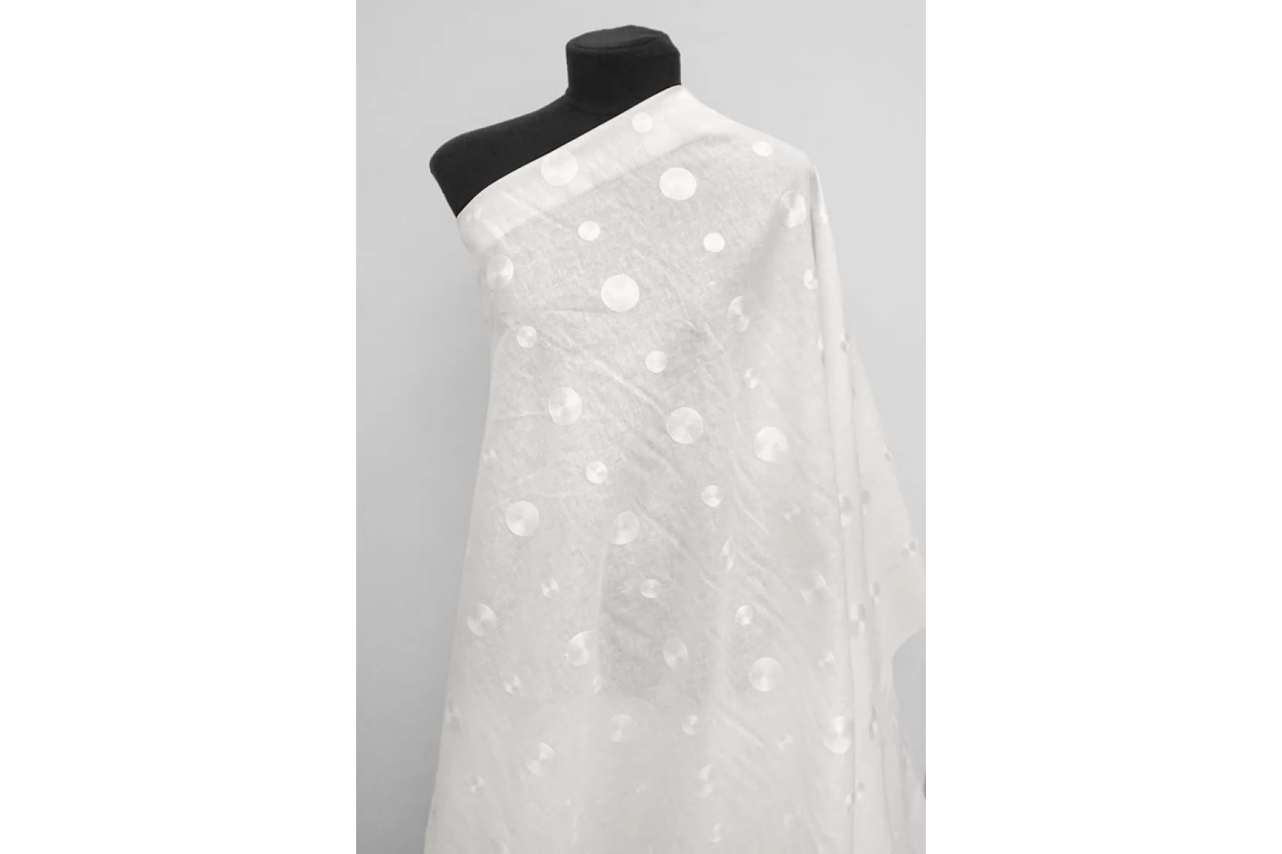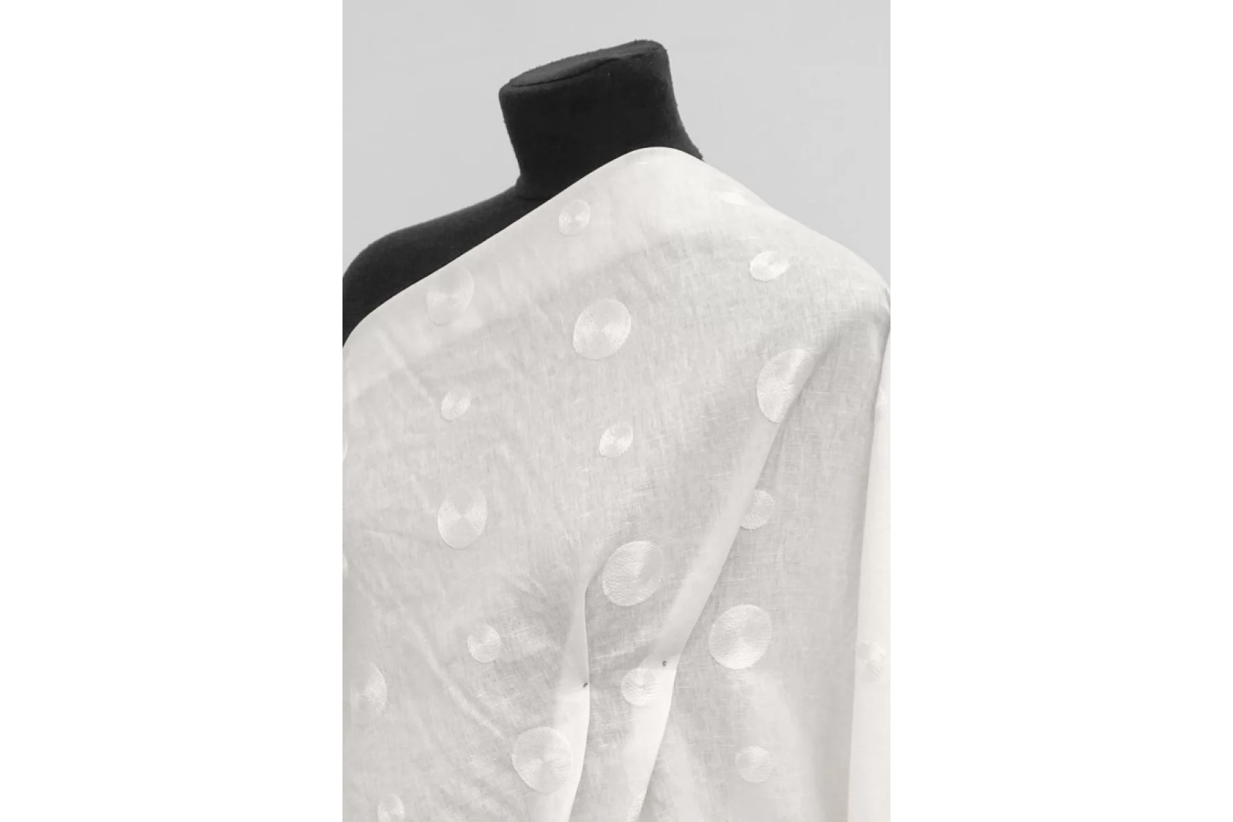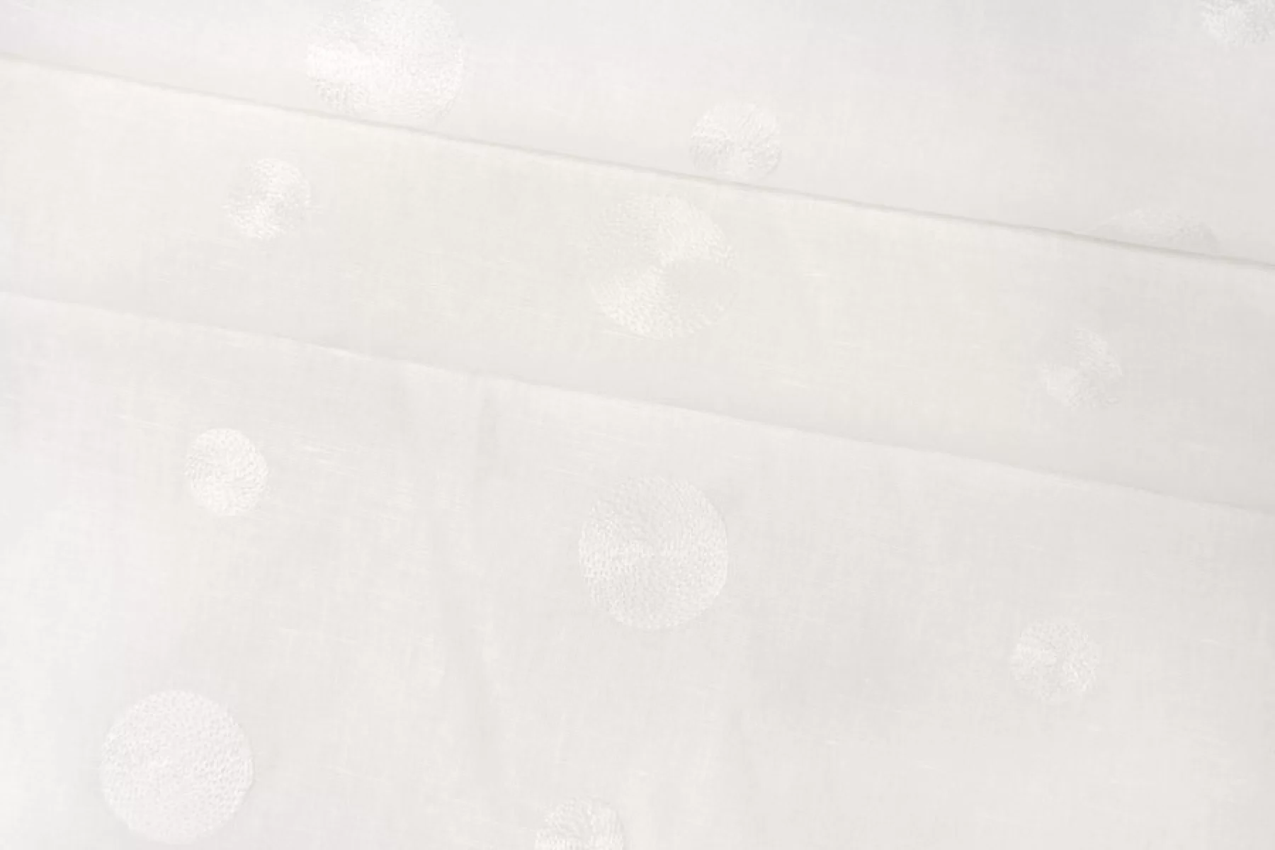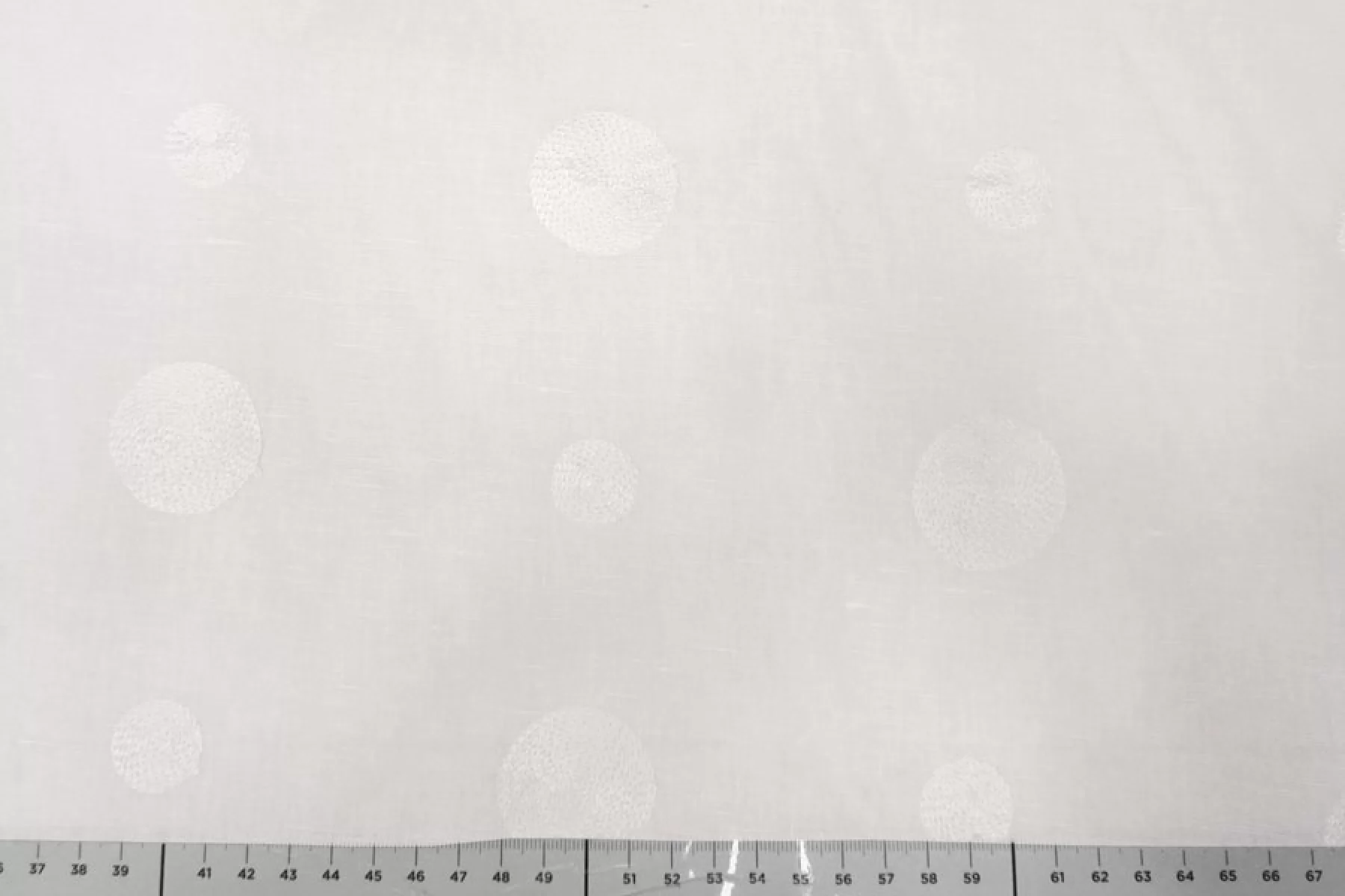 Шикарный итальянский лён с вышивкой в виде кругов больших и маленьких. Приятный, немного суховатый наощупь. С легким лоском. Не тянется. Просвечивает. Форму держит, при этом пластичен и красиво драпируется. Сминается. Отличный летний варииант на брюки, платья, рубашки, юбки. Учитывайте возможную усадку.