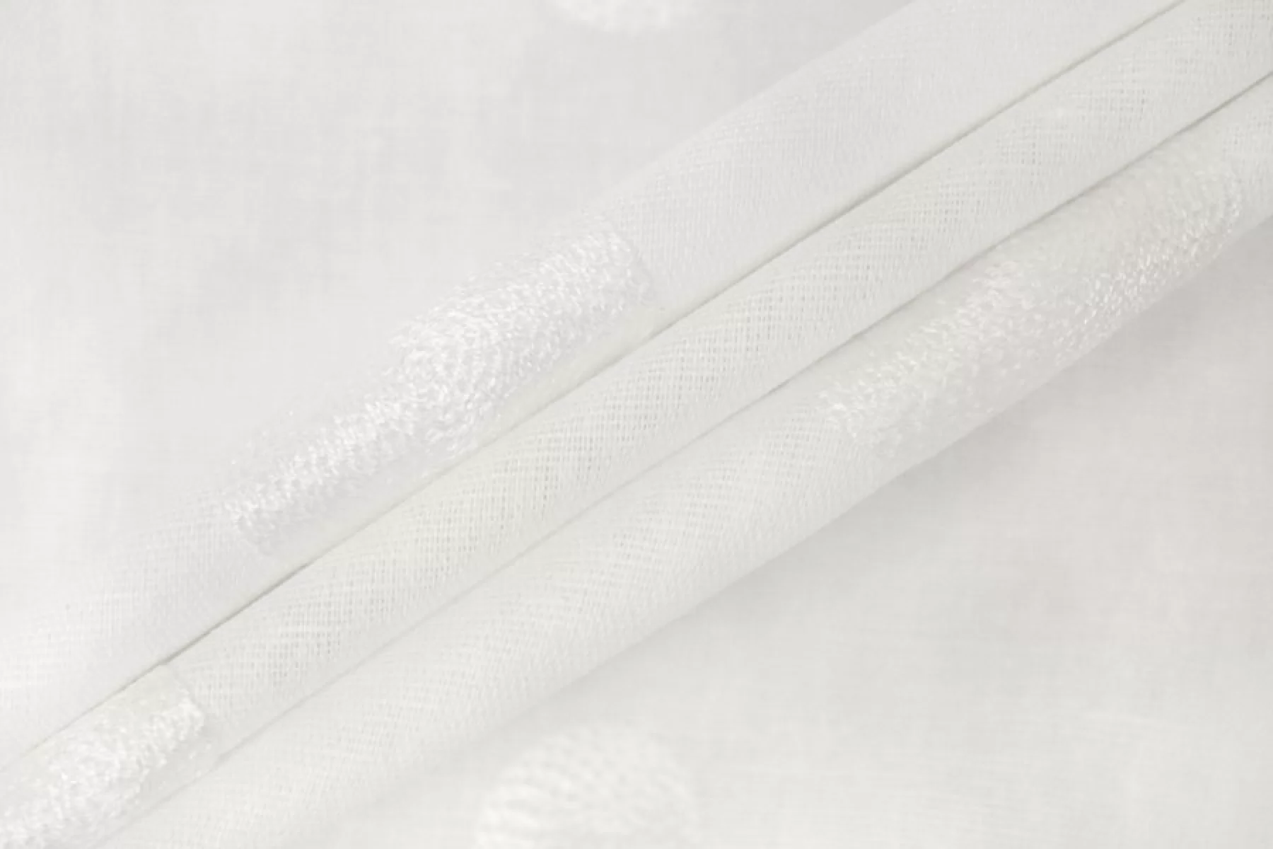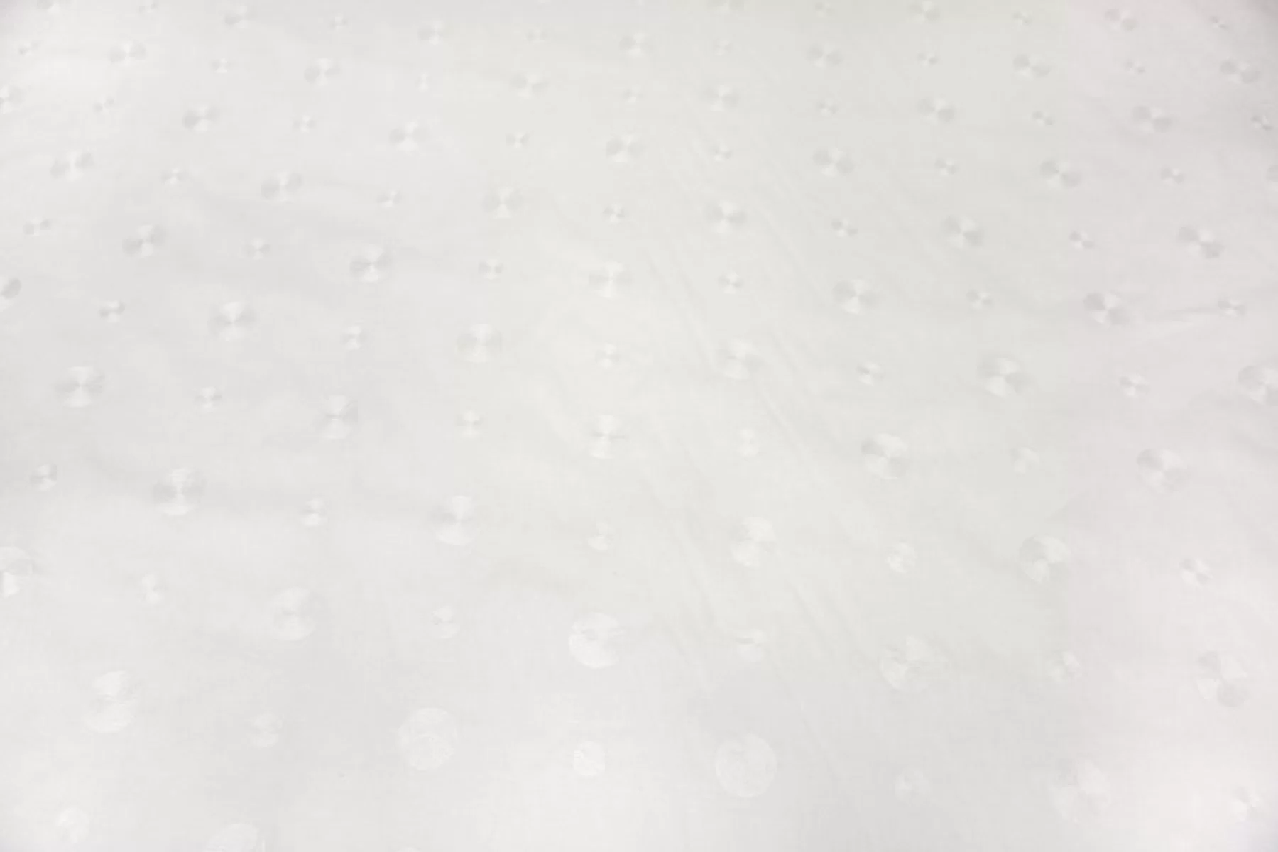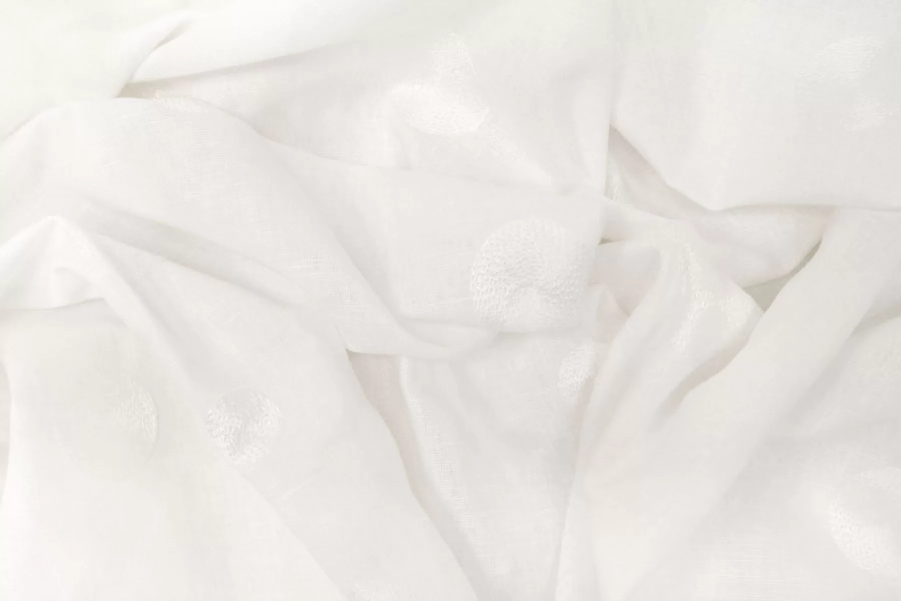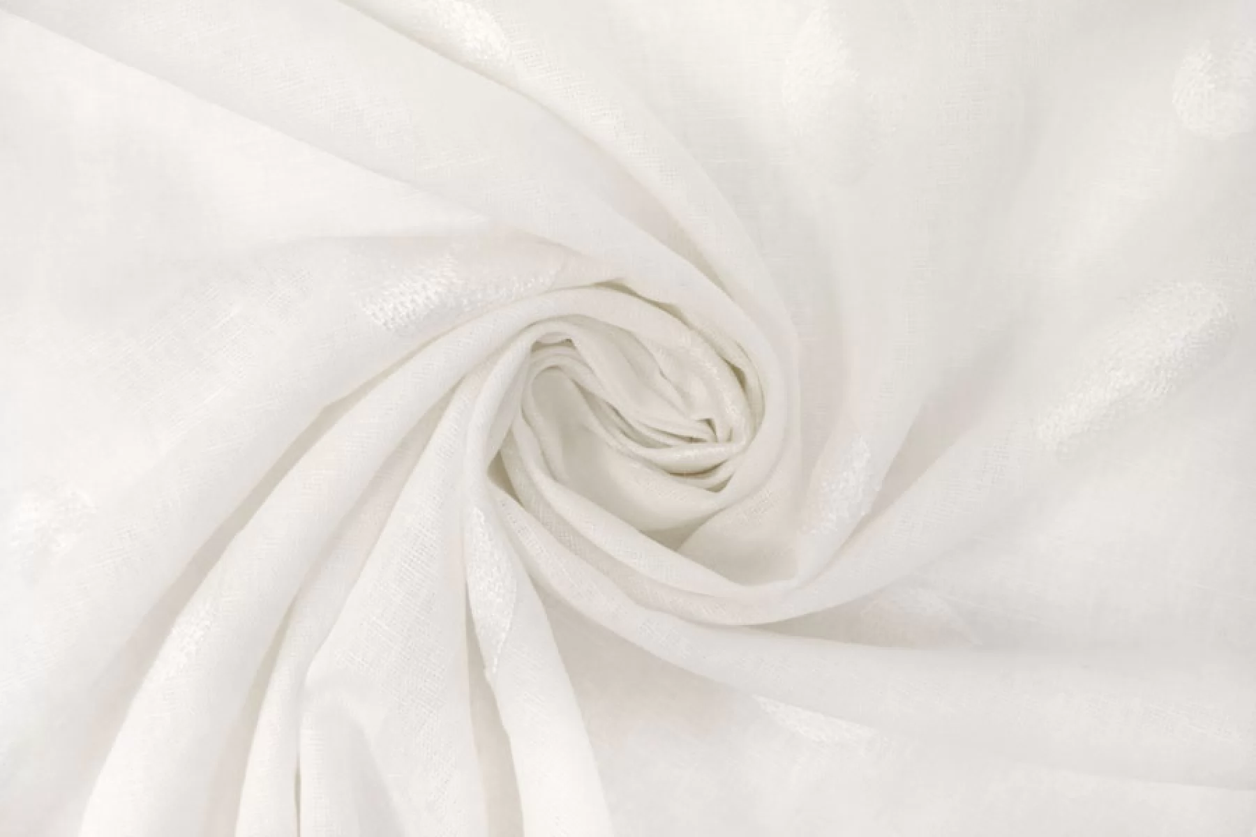 Шикарный итальянский лён с вышивкой в виде кругов больших и маленьких. Приятный, немного суховатый наощупь. С легким лоском. Не тянется. Просвечивает. Форму держит, при этом пластичен и красиво драпируется. Сминается. Отличный летний варииант на брюки, платья, рубашки, юбки. Учитывайте возможную усадку.