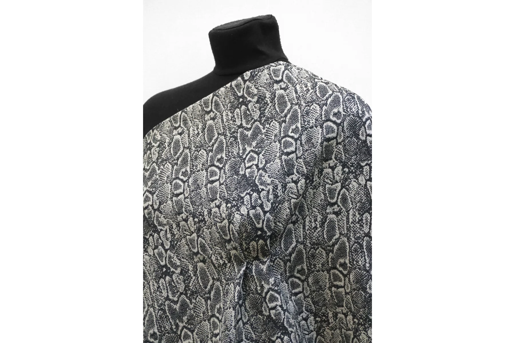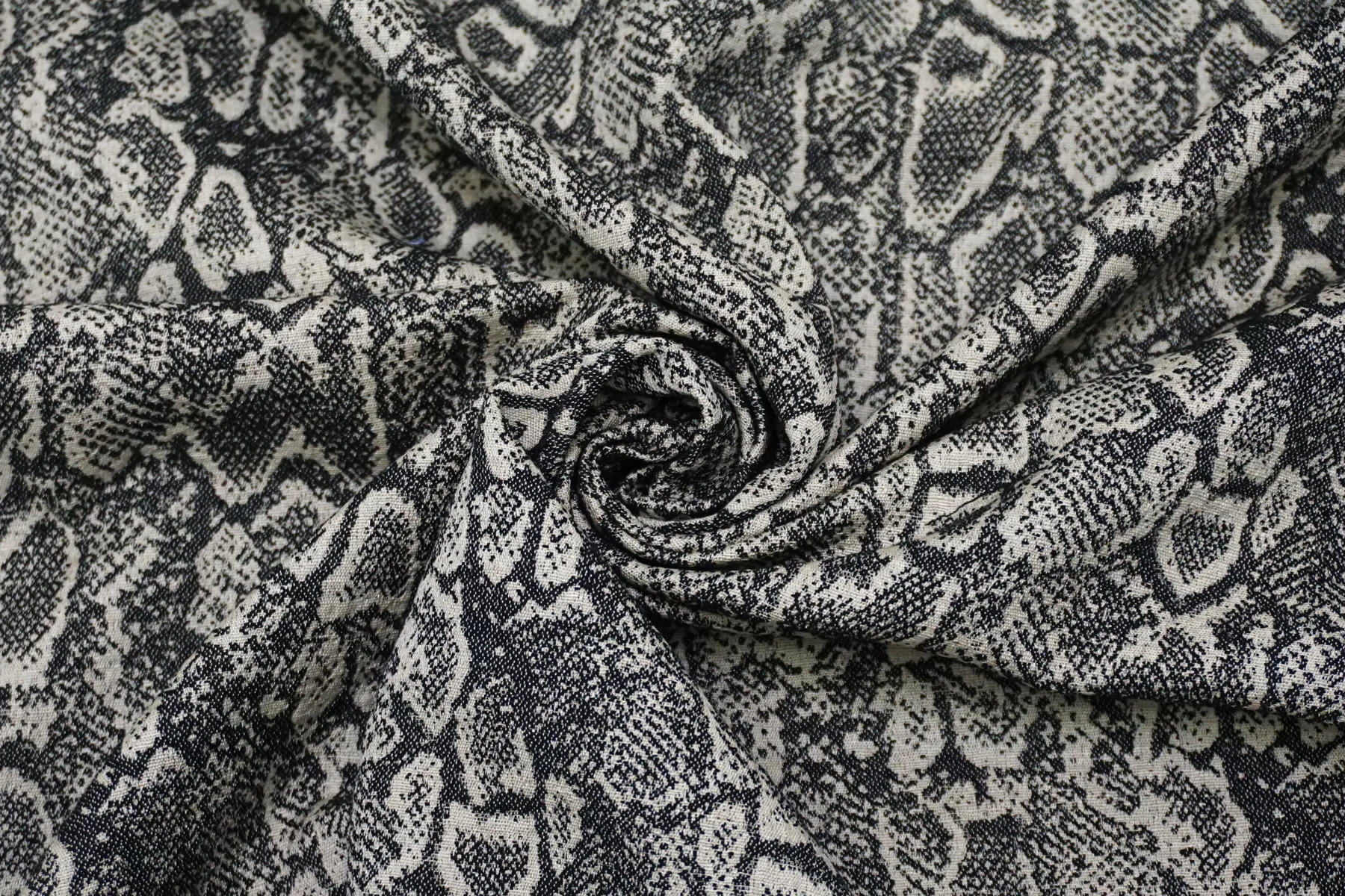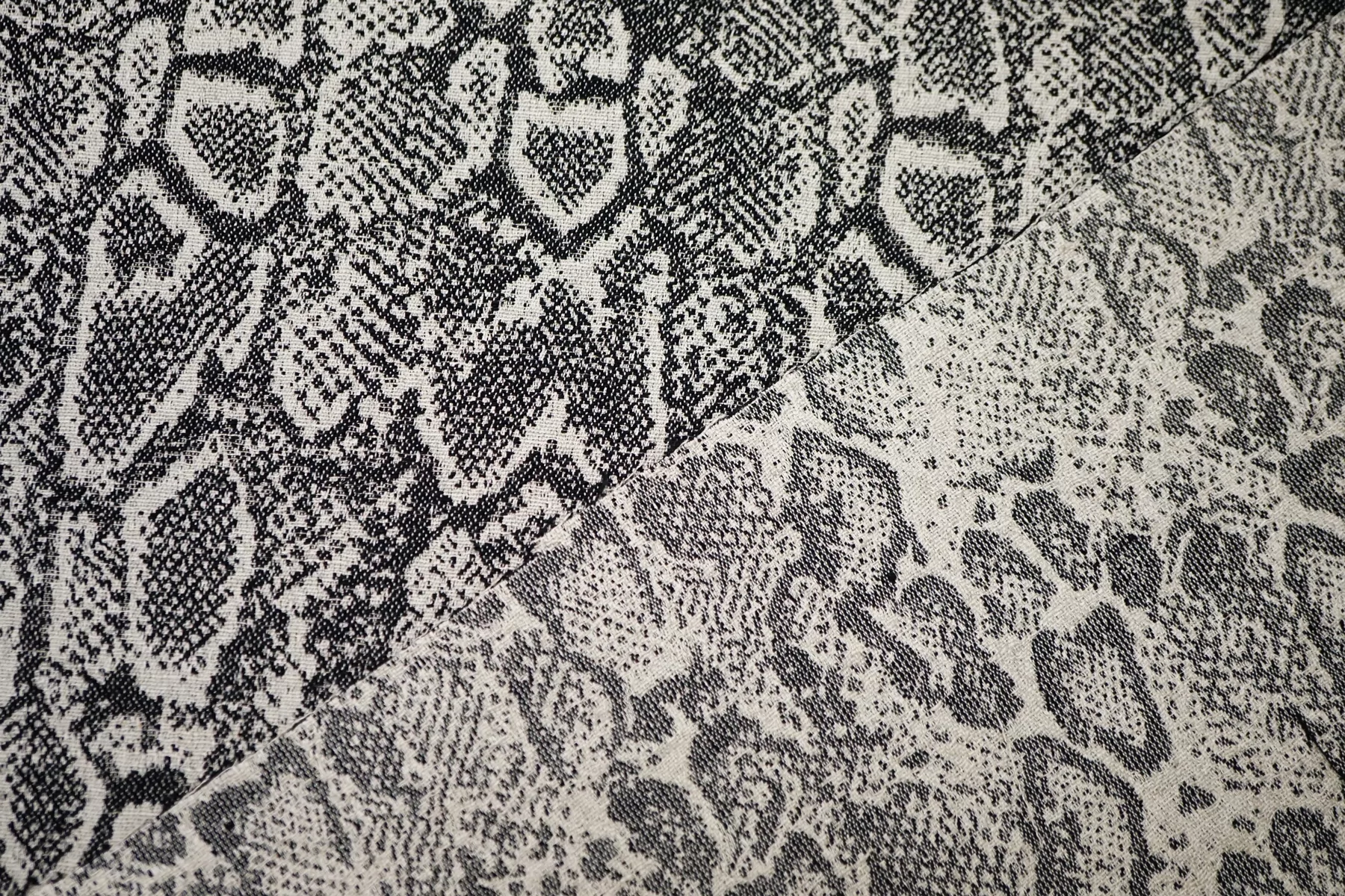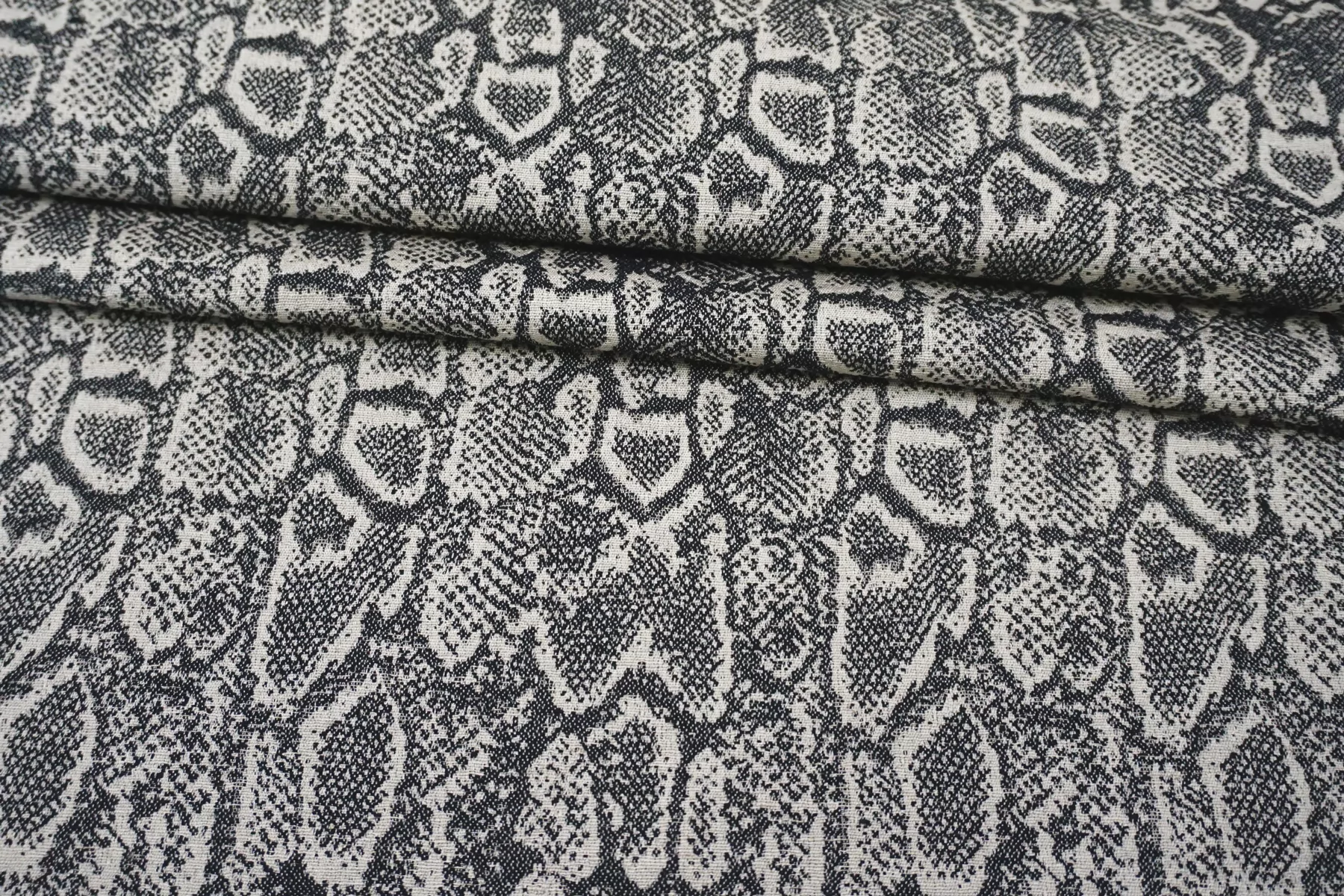 Очень интересный лен костюмно-плательной плотности с жаккардовой анималистичной выработкой из переплетения нитей молочно-бежевого и черного цвета. С красивым лоском. Тактильно материал тонкий, суховатый, слегка чувствуется фактурность плетения, приятный. Плетение достаточно плотное, не рыхлое. Хорошо держит форму. Не просвечивает. Не тянется, практически не мнется. Красив в пластике. Шьем костюм, платье, юбку, жакет и не только. При необходимости используйте подкладочный вариант.