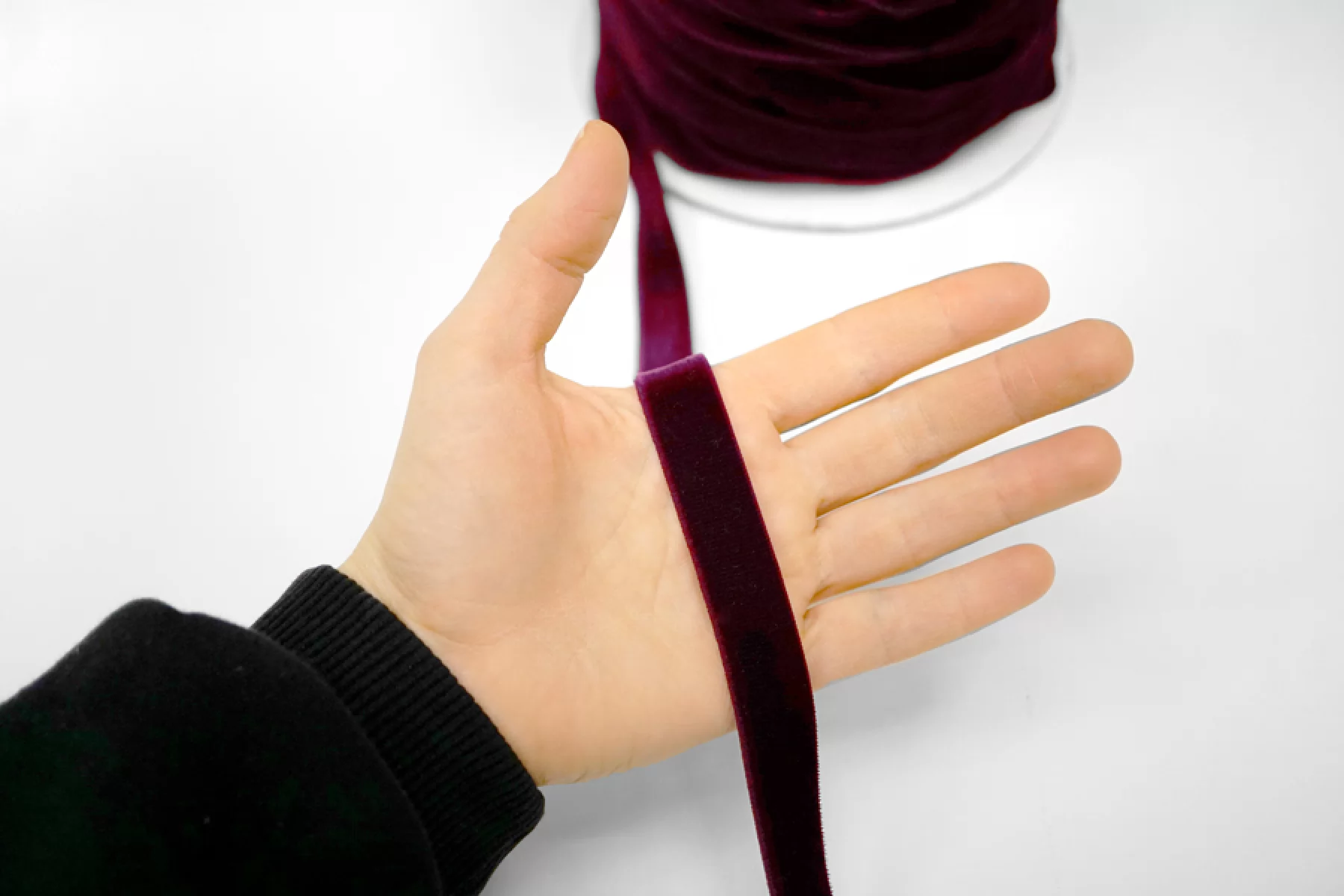 Бархатная лента шириной 16 мм фиолетового цвета, тянется, плотная.