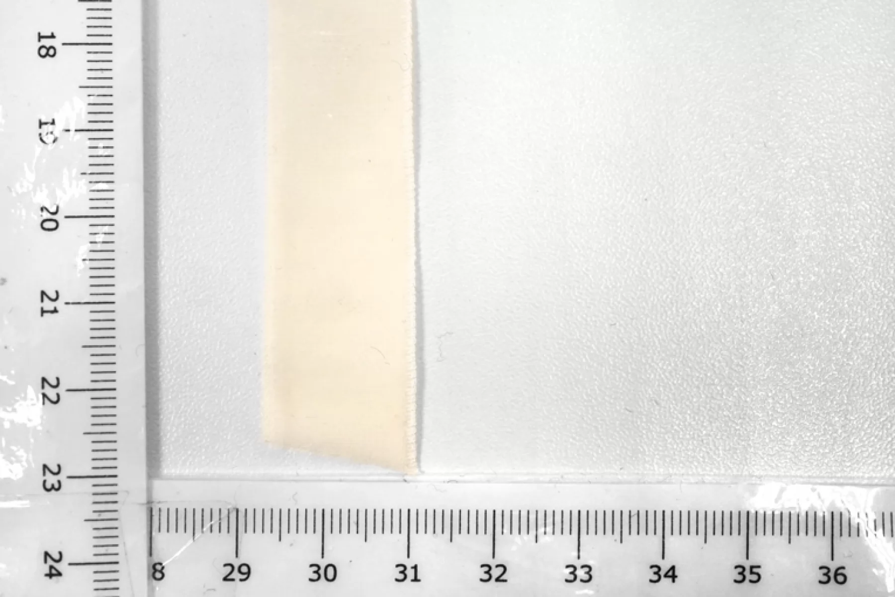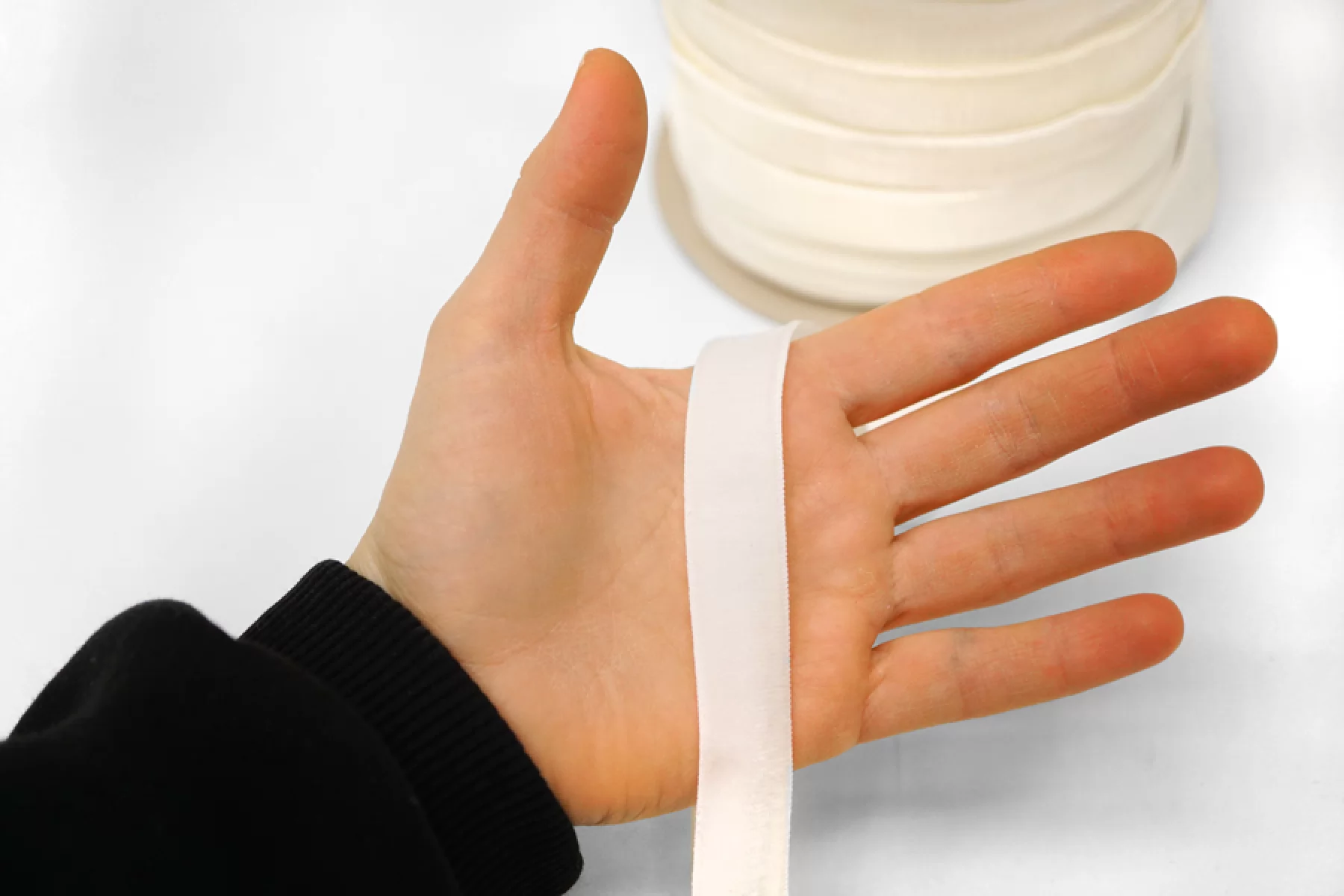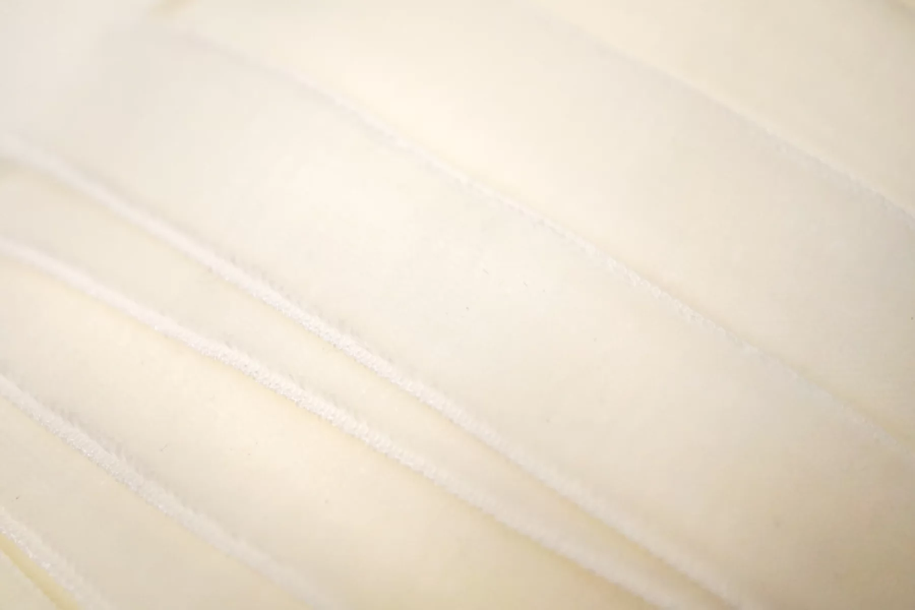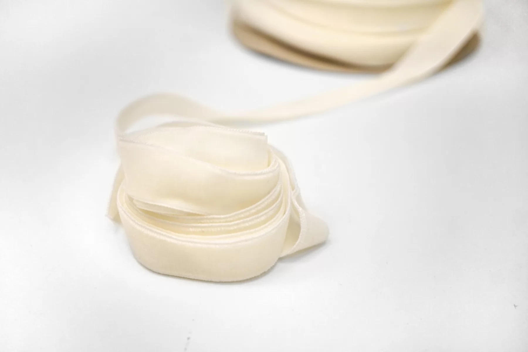 Бархатная лента шириной 16 мм молочного цвета, тянется, плотная.