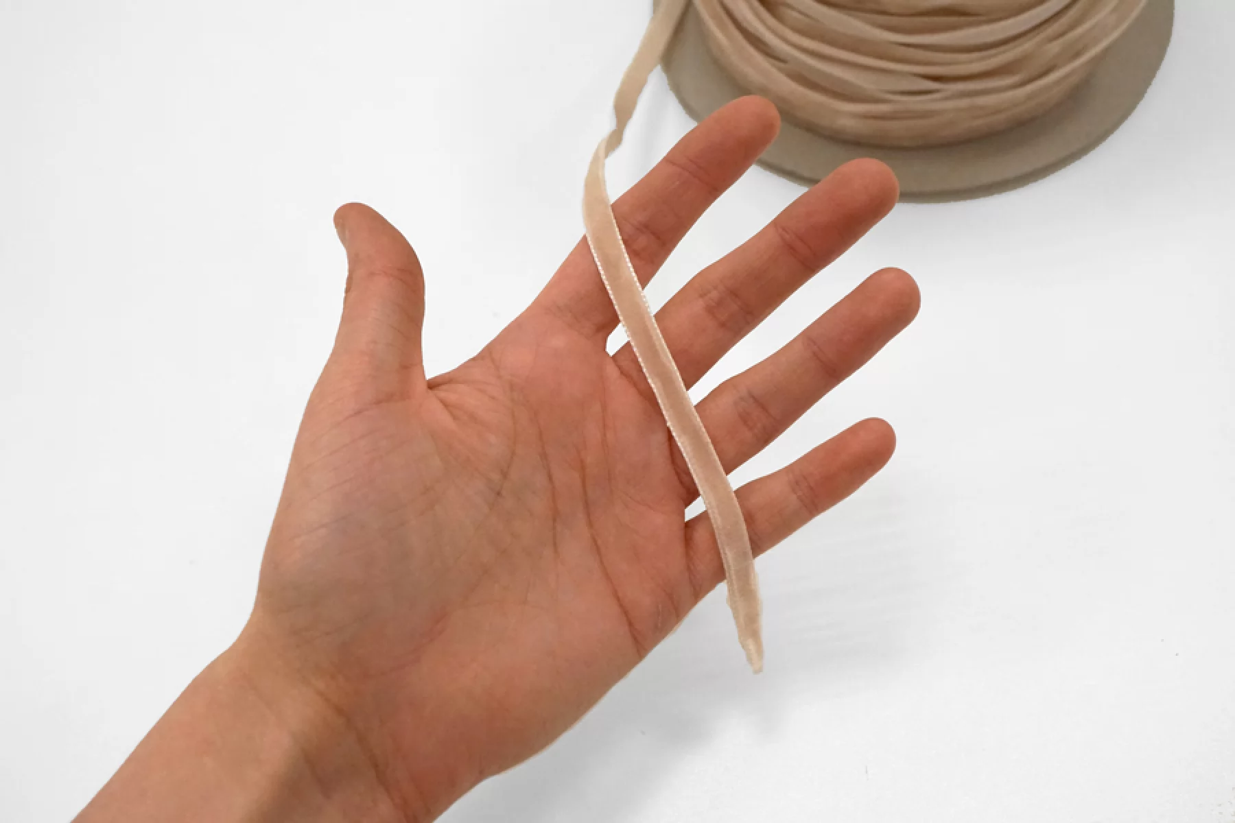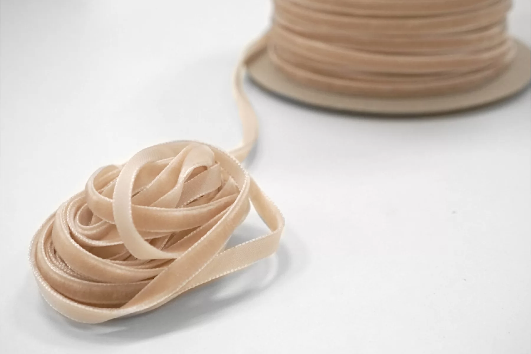 Бархатная лента, бежевого цвета, ширина 5 мм. Подойдет для декорирования одежды, аксессуаров и бижутерии.