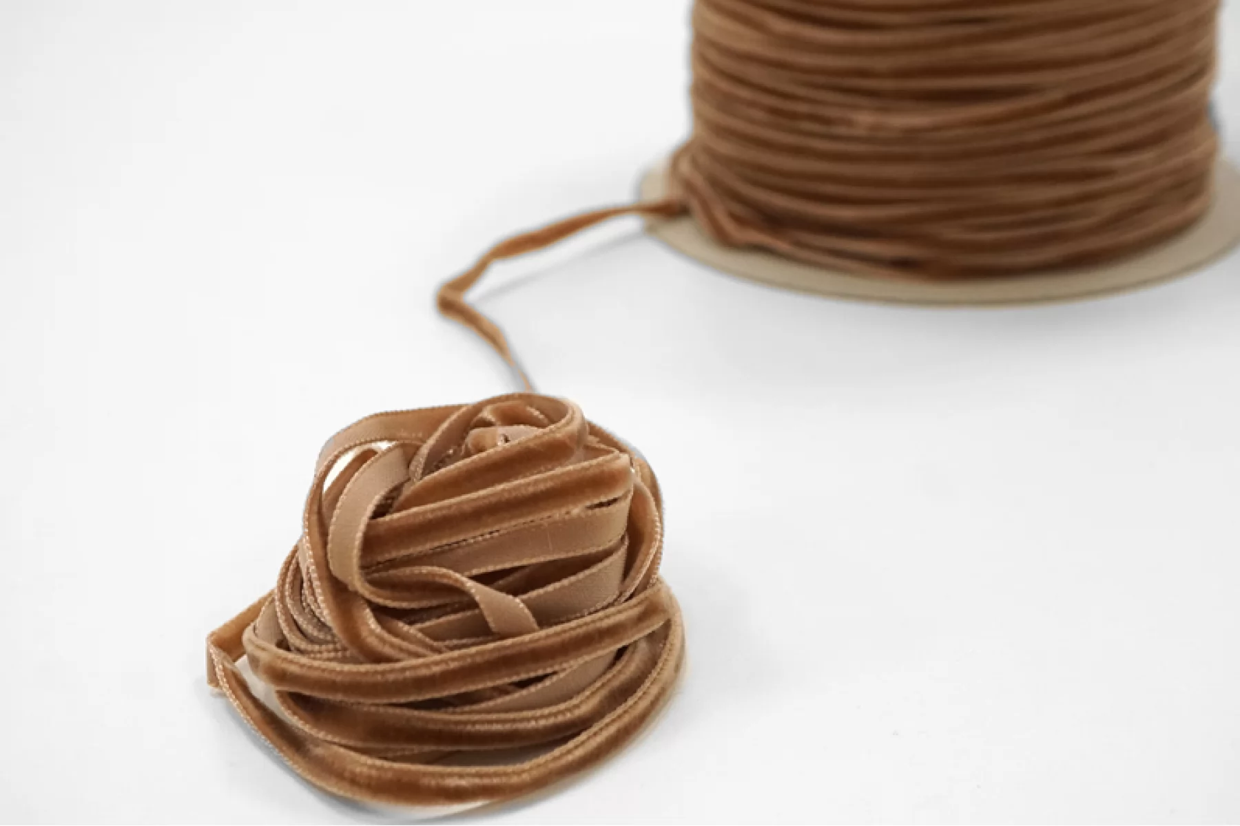 Бархатная лента, светло-коричневого цвета, ширина 5 мм. Подойдет для декорирования одежды, аксессуаров и бижутерии.