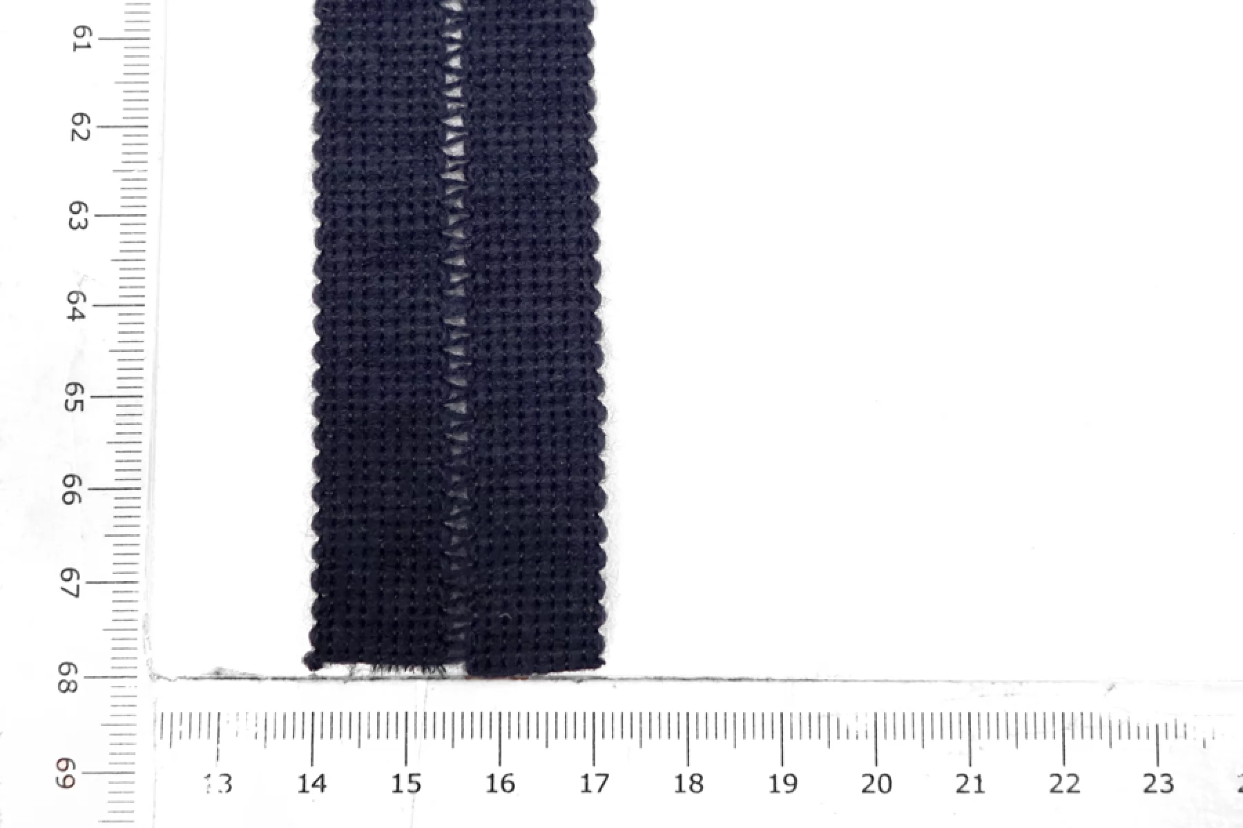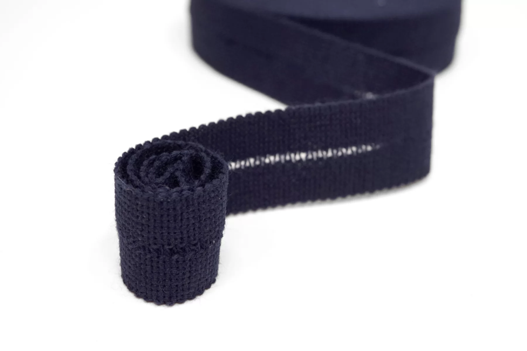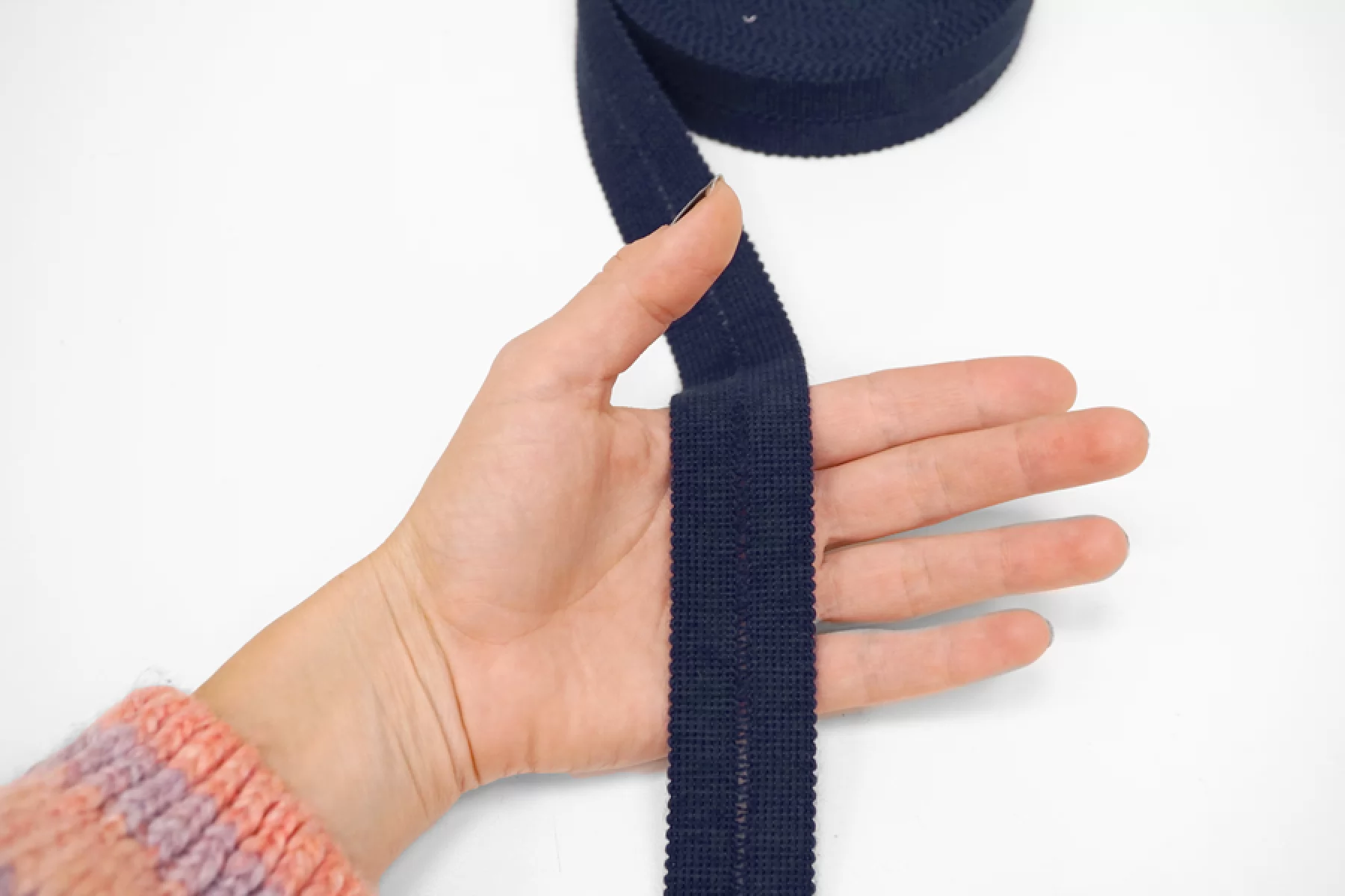 Трикотажная лента для швов тёмно-синего цвета. Ширина 3 см. Прочная трикотажная лента необходима для укрепления швов, на линии которых приходится большая нагрузка при носке. Этот окантовочный материал предотвращает расхождение швов и защищает от предварительной деформации.