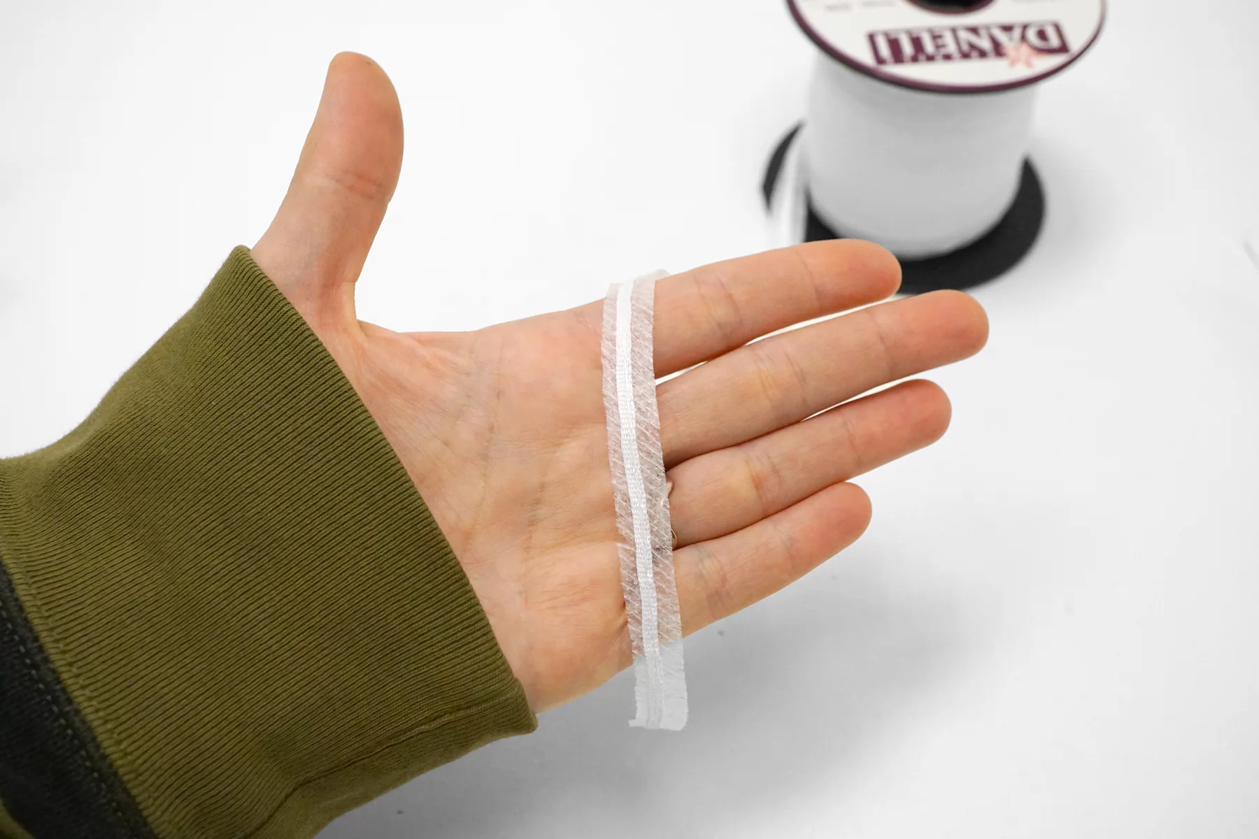 Клеевая (клей с одной стороны) нитепрошивная лента по косой, усиленная тесьмой, предназначена для фиксации проймы рукава, горловины. Цвет основы и сутажа - белый, ширина 10 мм.