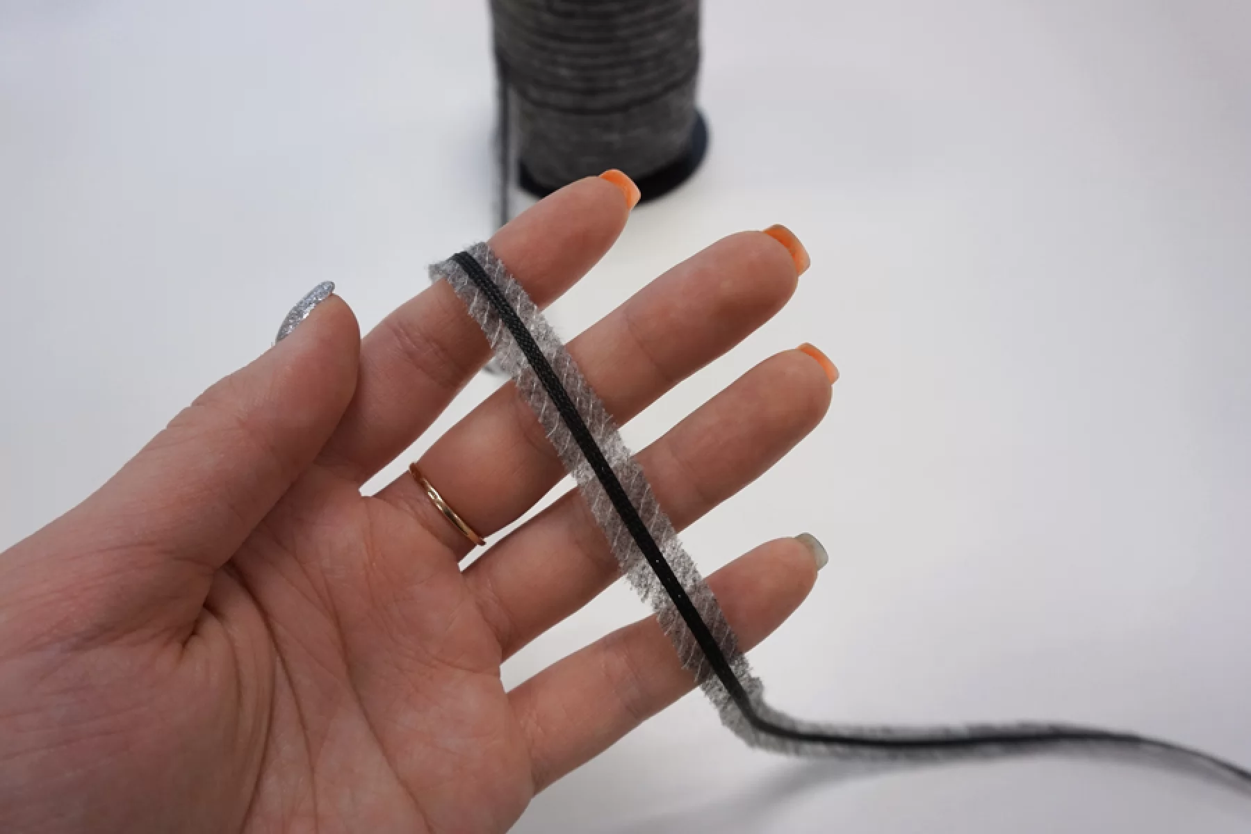 Клеевая (клей с одной стороны) нитепрошивная лента по косой, усиленная тесьмой, предназначена для фиксации проймы рукава, горловины. Цвет основы серый, сутаж черный, ширина 10 мм.