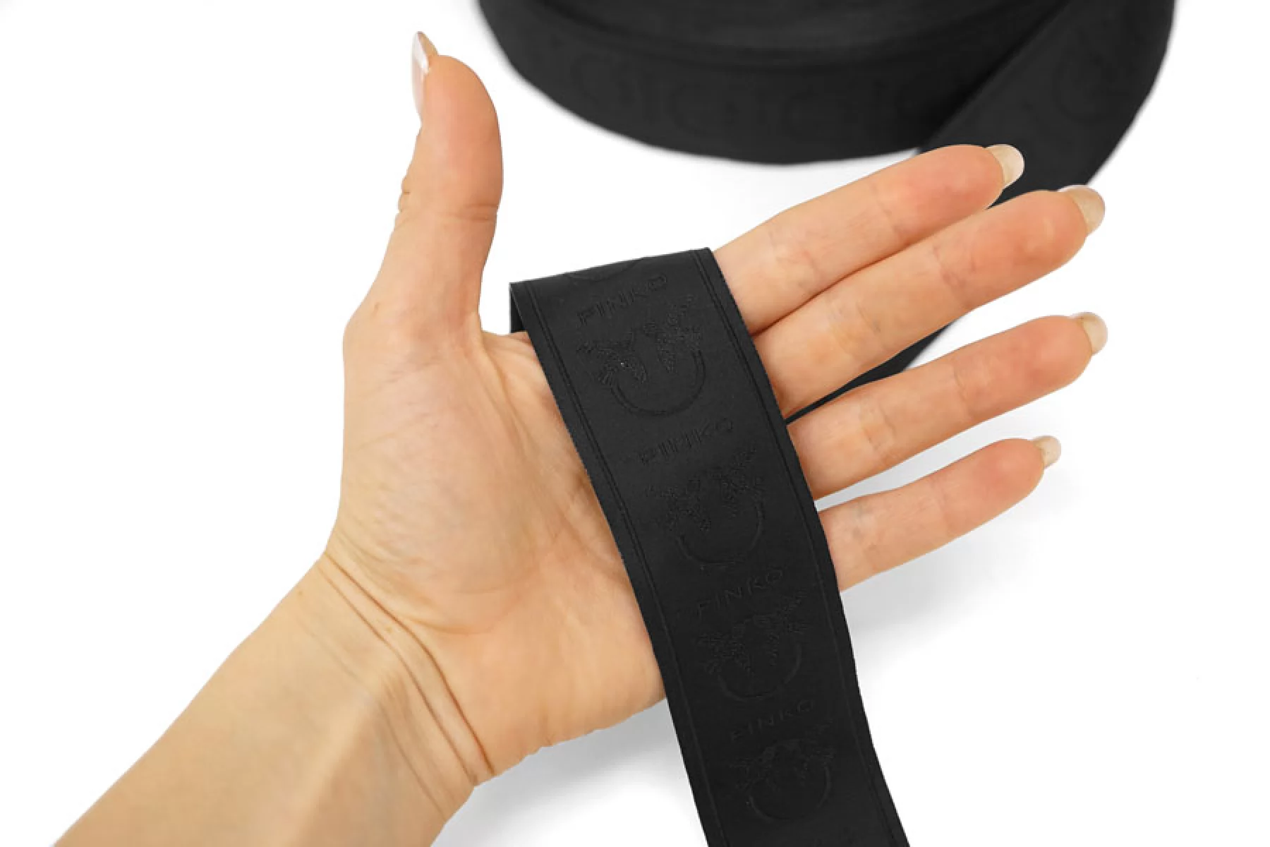 Черная лента с жаккардовой выработкой бренда PINKO, ширина 4 см. Гладкая, плотненькая. Имеет приятный легкий лоск. Отлично подойдет для декорирования одежды, аксессуаров и бижутерии.