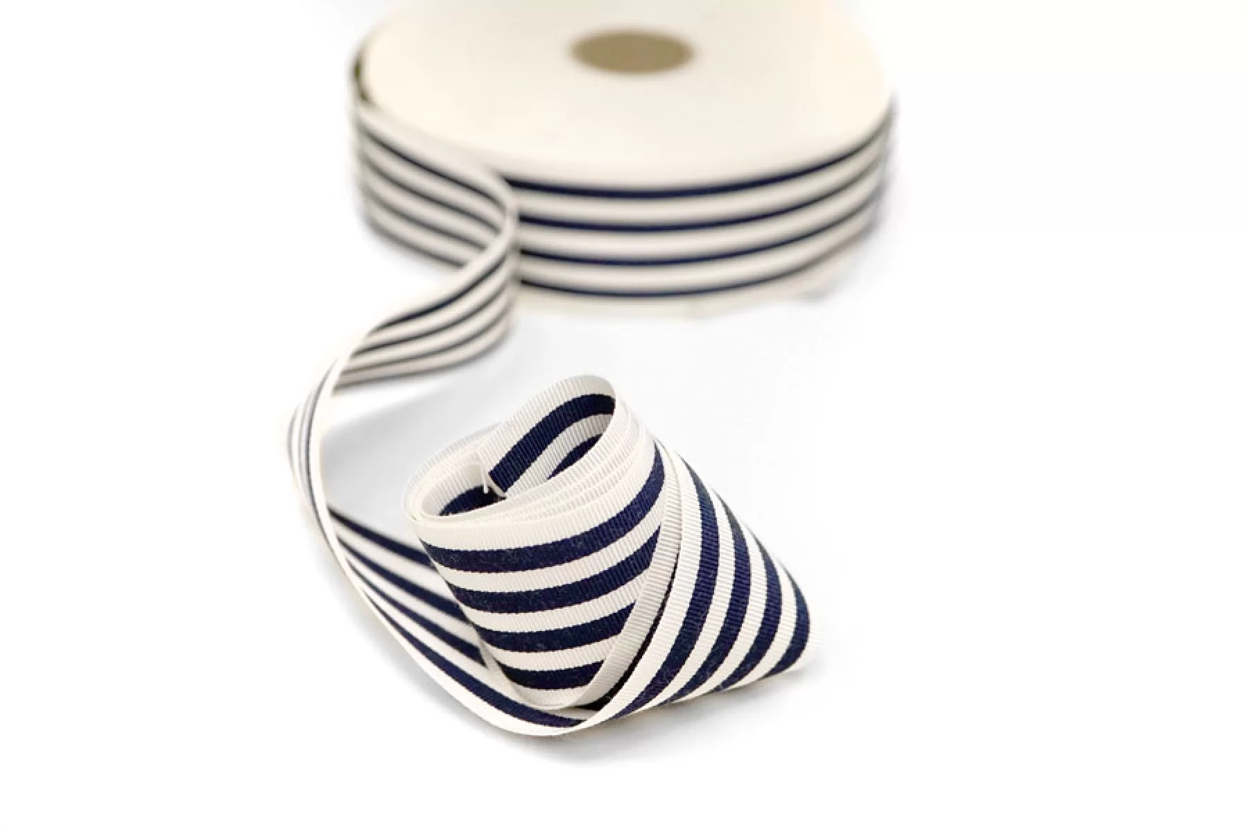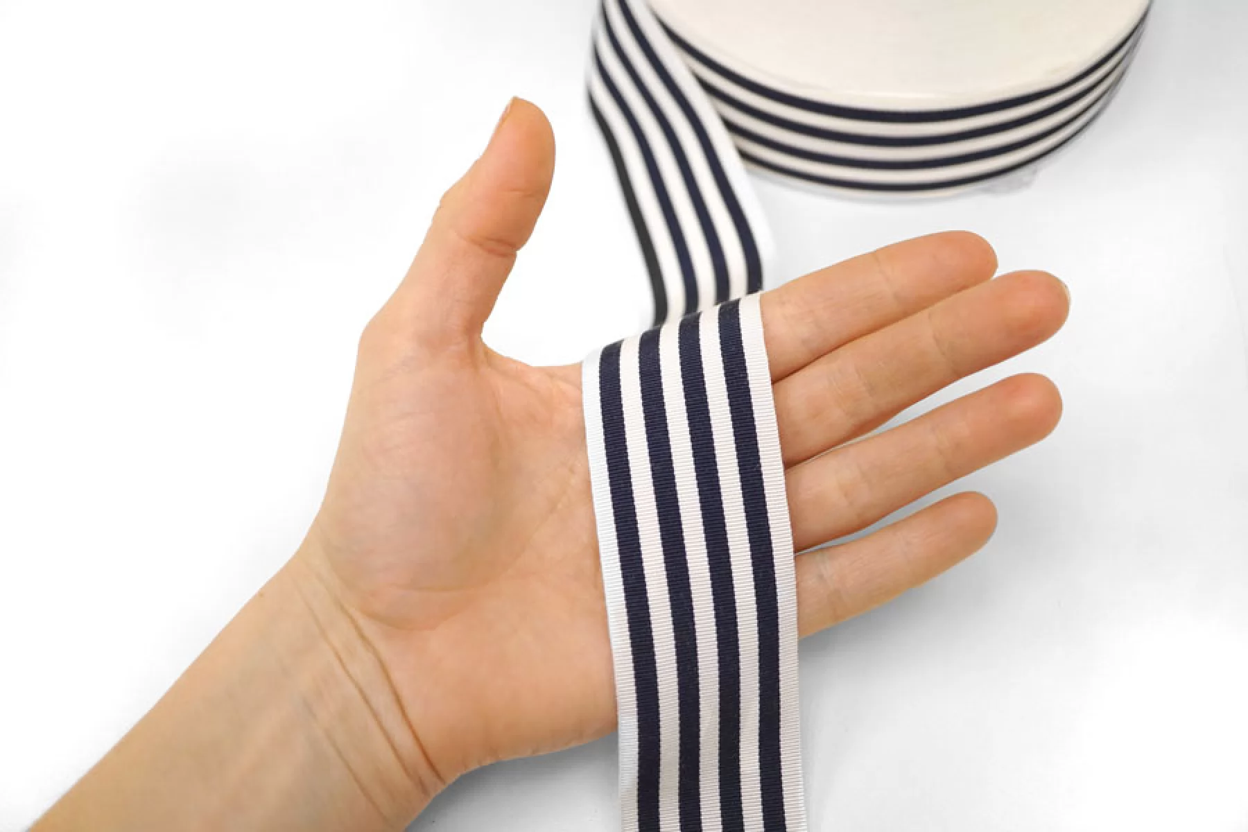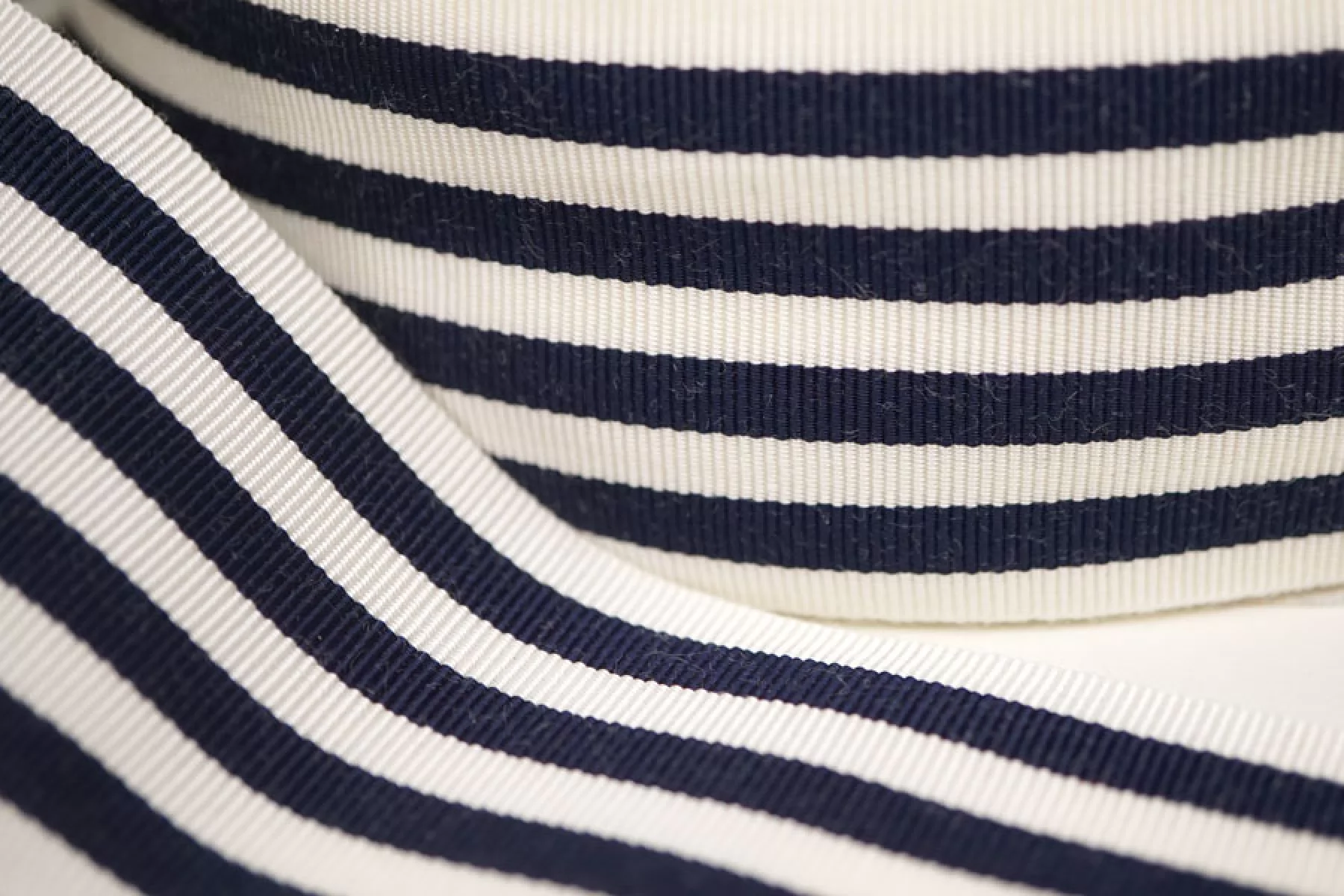 Репсовая лента из хлопка с вискозой в молочно-синюю полоску, ширина 4 см. Плотная гладкая и довольно мягкая, держит форму.