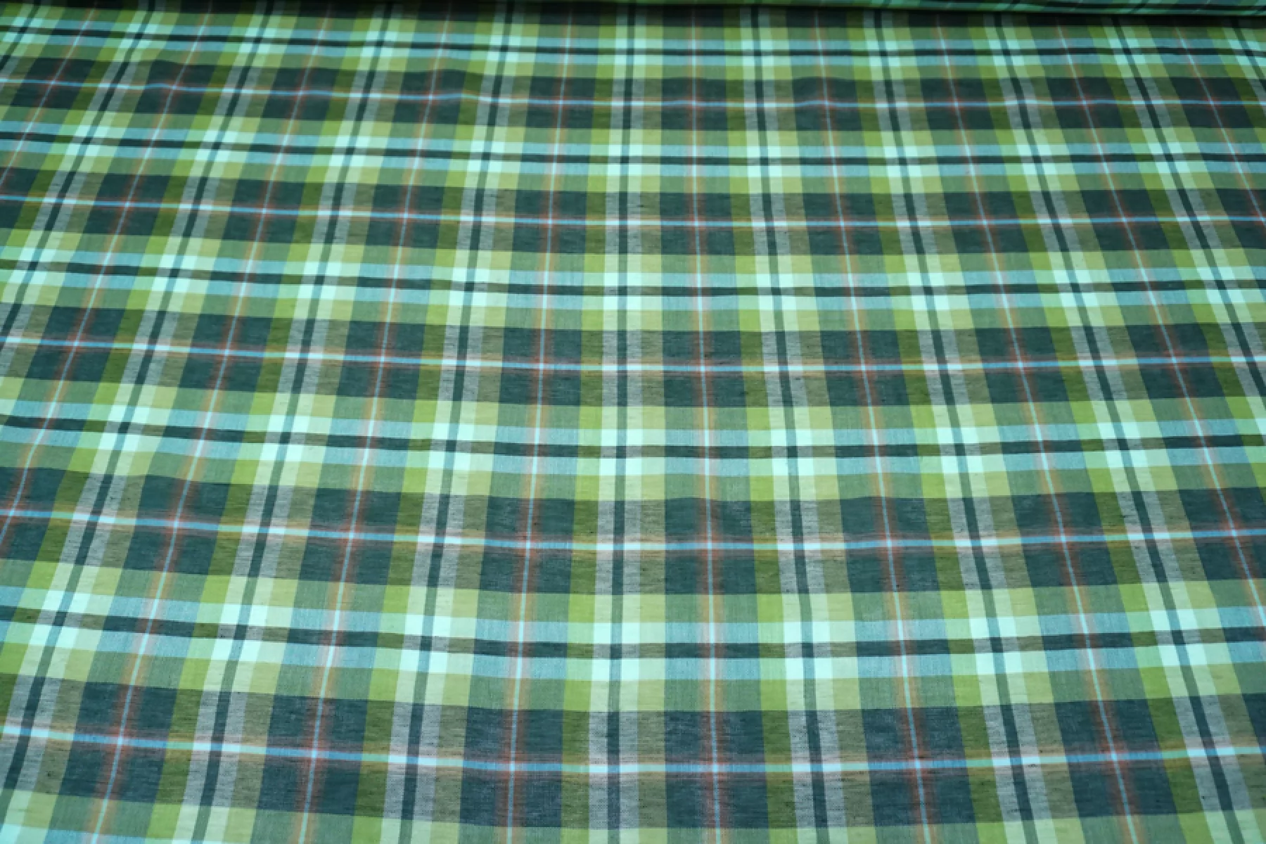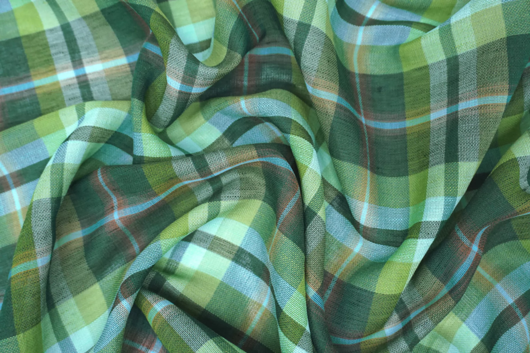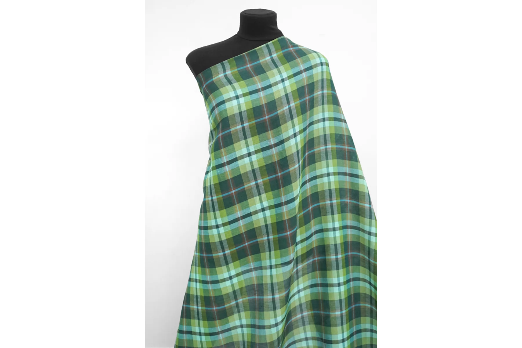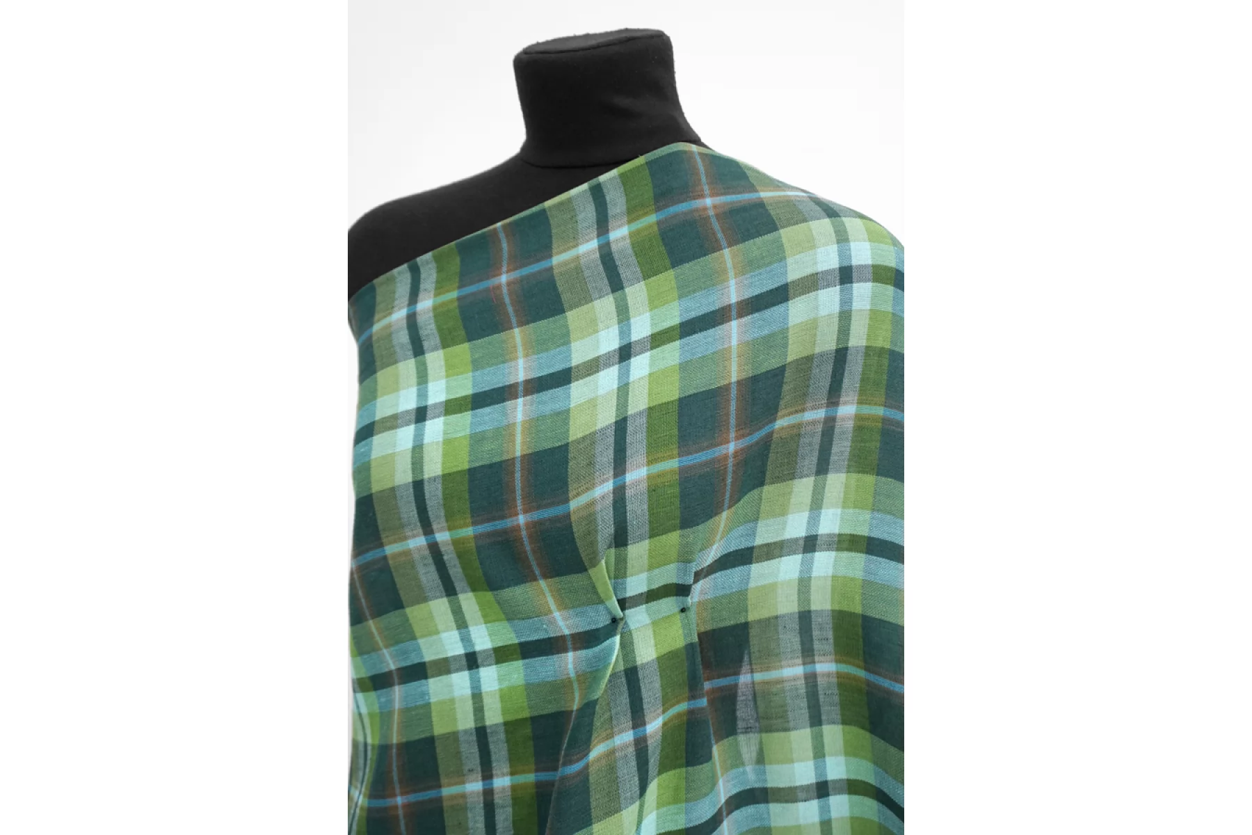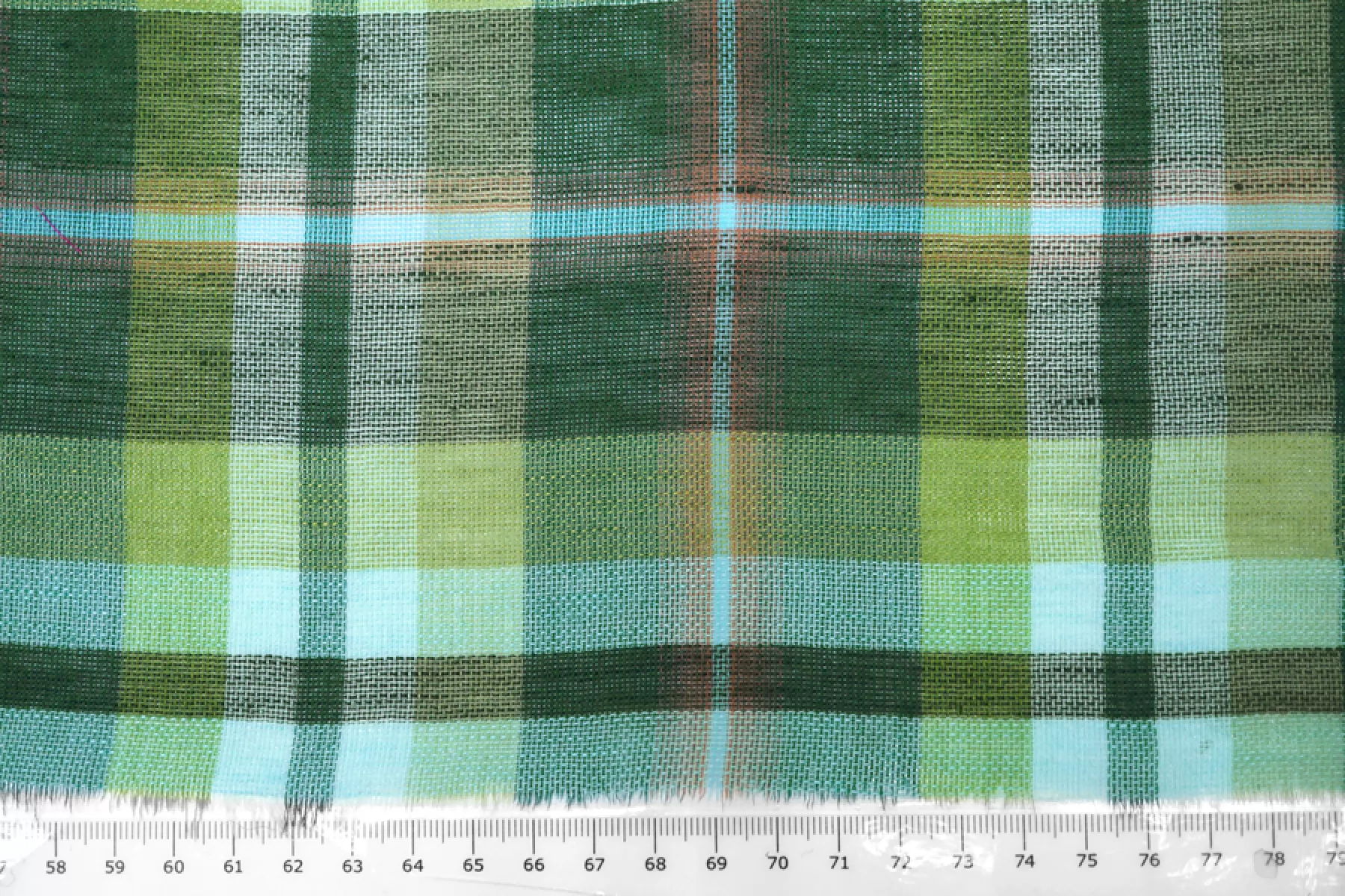 Необычная позиция - льняная марлевка от BRUNELLO CUCINELLI в клетку, переплетения нитей оттенков хаки, оливкового, голубого, светло-коричневого и молочно-голубого. Плетение разряженное, само полотно тонкое. Материал тактильно шероховатый и сухой, что свойственно льну. Не тянется. За счет плетения просвечивает. Сминается, но частично восстанавливается. Немного держит округлые складки. Шьем рубашки, платья, юбки или другие варианты. При необходимости используйте подкладочный материал.