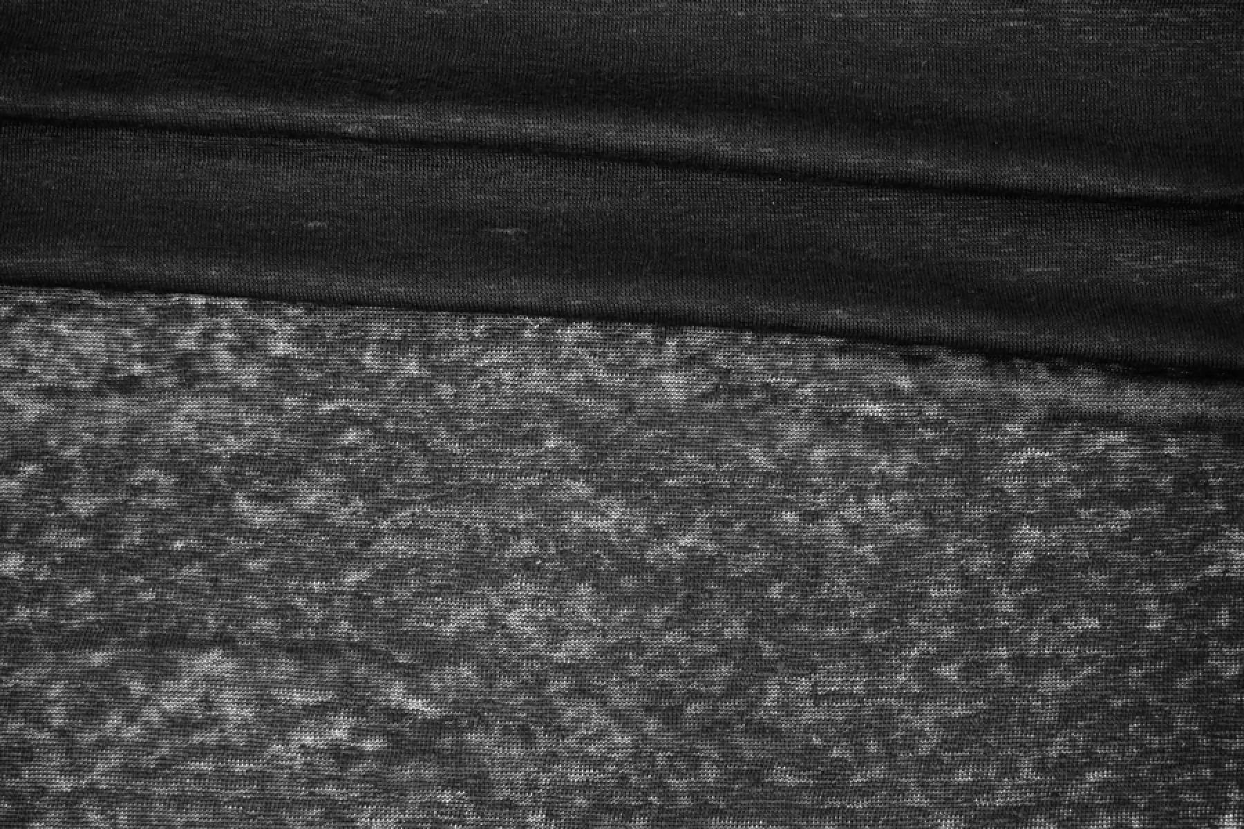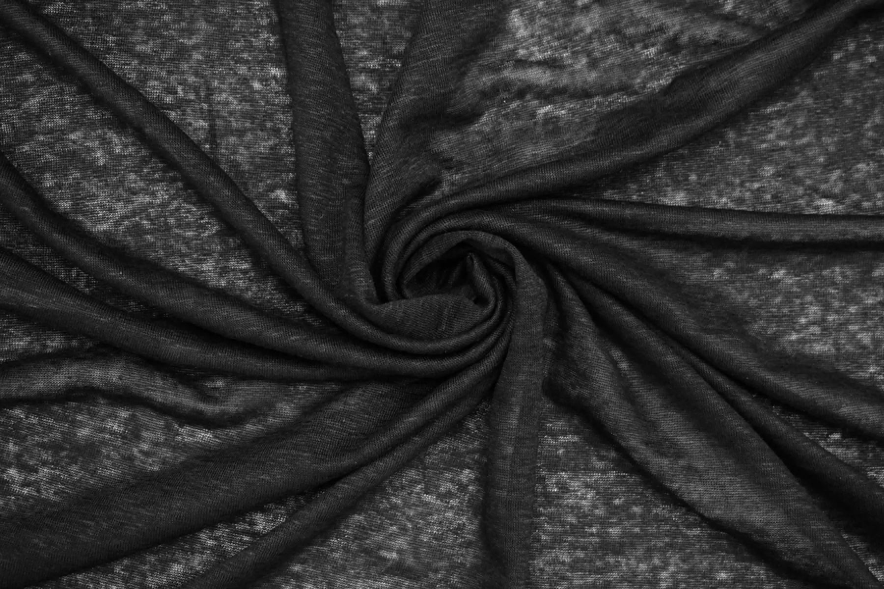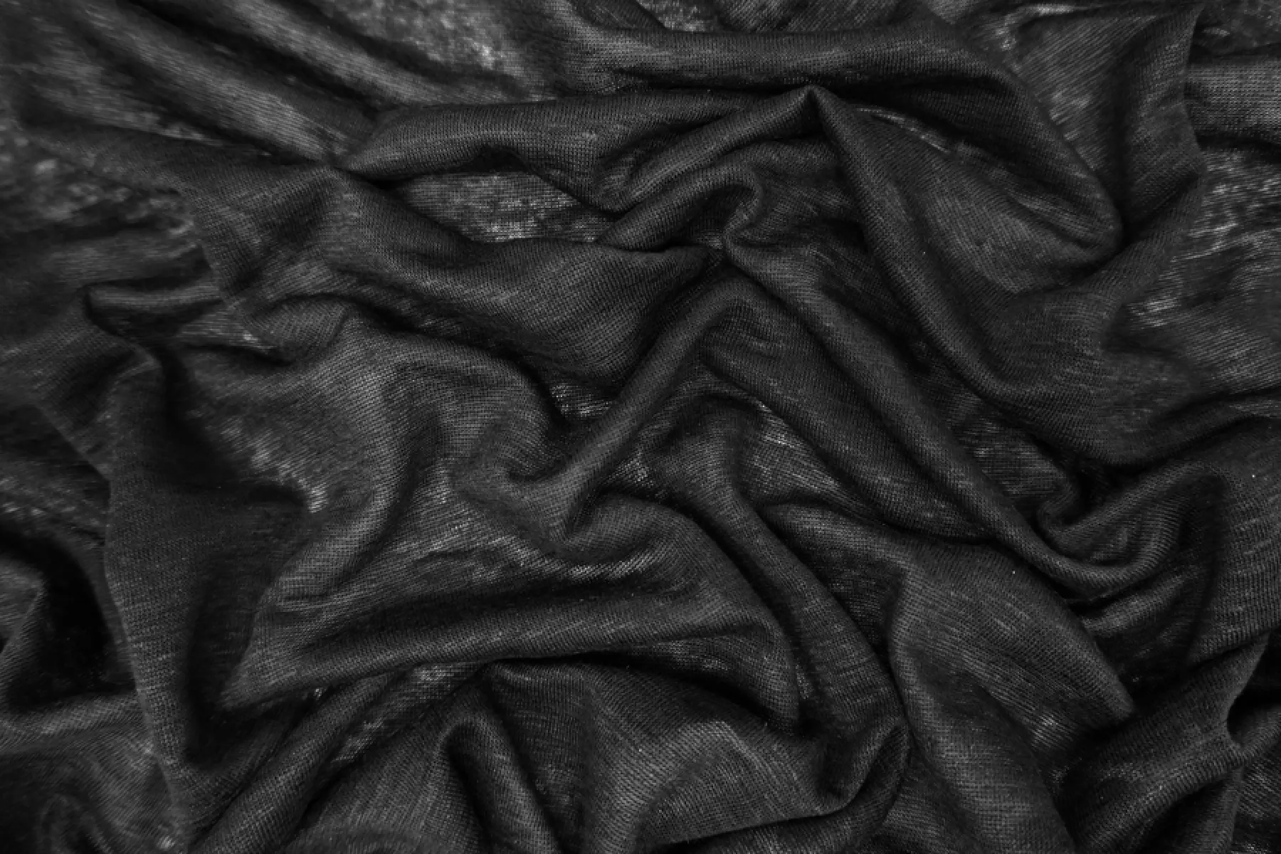 Льняной трикотаж - кулирная гладь классического черного оттенка. Материал тактильно приятный, достаточно мягкий, слегка суховат как лен. Обладает легким приятным лоском, с красивой пластикой. Немного и упруго тянется за счет плетения. Тонкий, просвечивает. Отличный вариант для пошива майки, футболки, топа, платья, юбки, брюк на резинке, особенно в летний период. При необходимости используйте подкладочный материал.