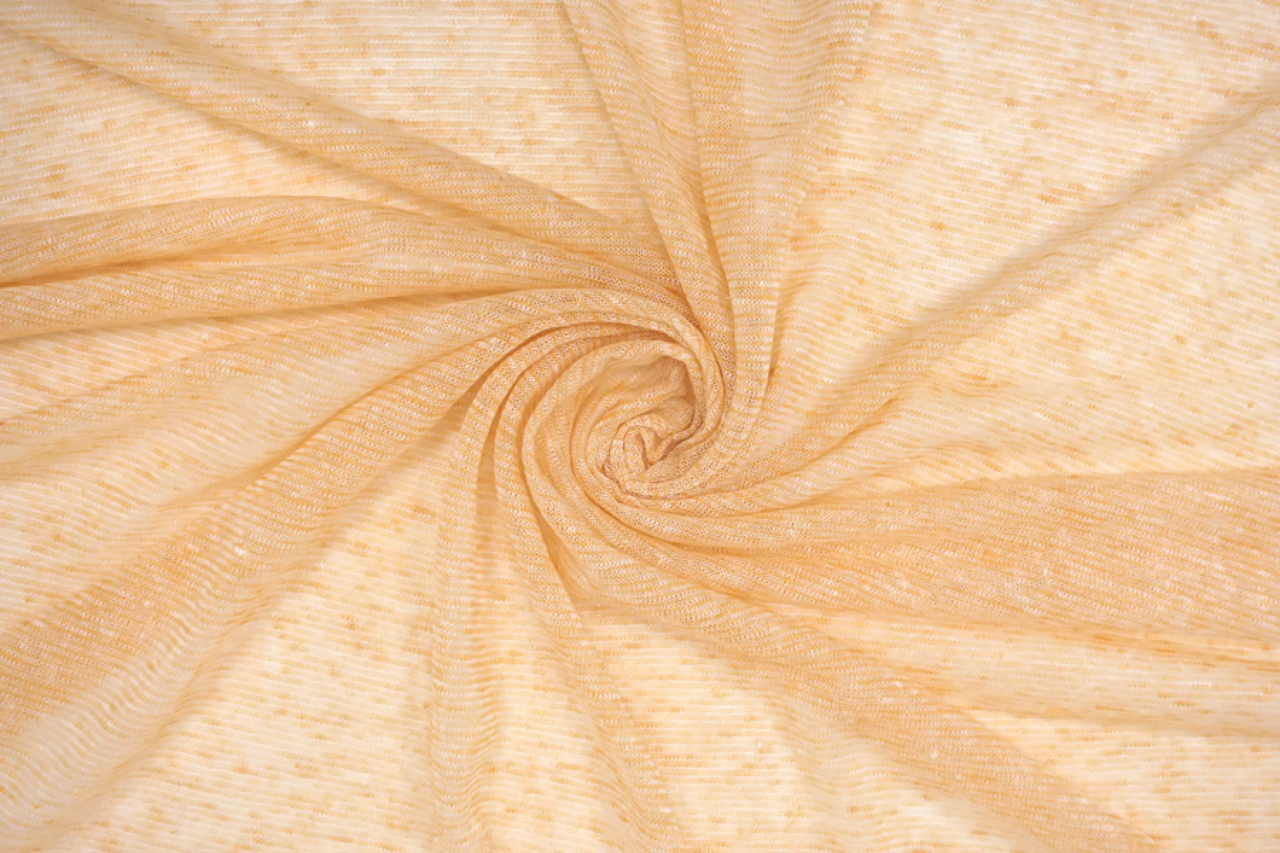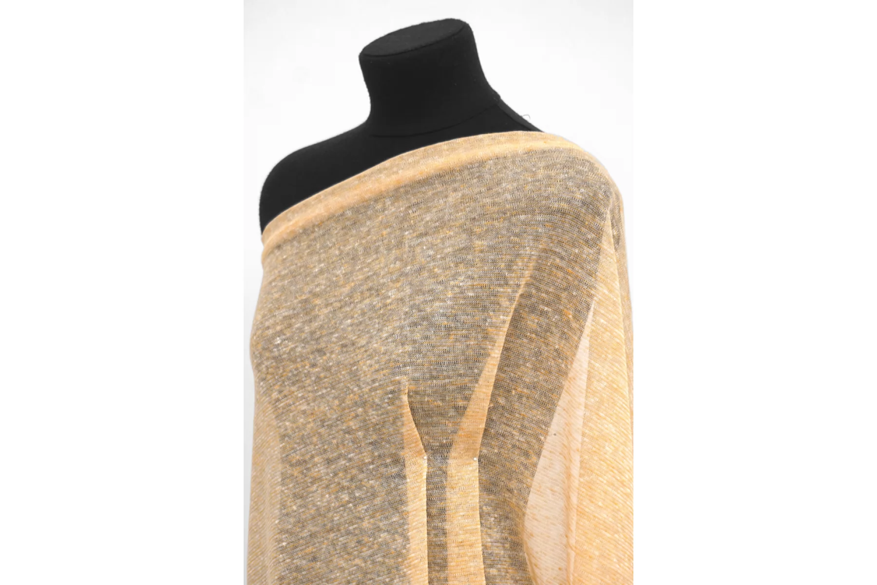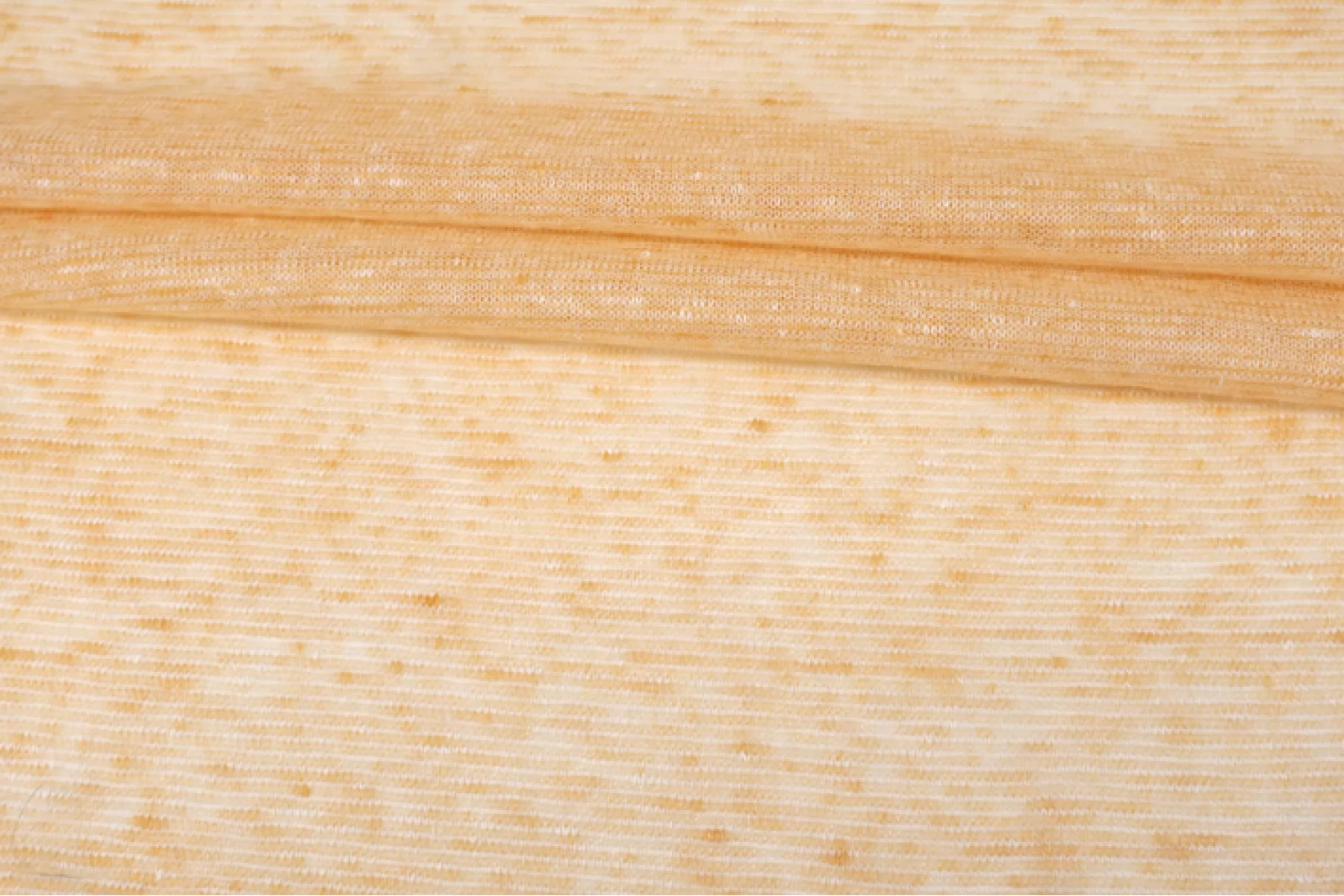Льняной трикотаж - кулирная гладь сложного бежево-желтого меланжевого оттенка. Плетение достаточно рыхлое. Тянется немного за счет плетения. Полупрозрачный, с красивой пластикой. Тактильно сухой - как лен. Форму не держит. Отличный вариант для пошива майки, футболки, топа, платья, юбки, легких костюмов, брюк на резинке, особенно в летний период. При необходимости используйте подкладочный материал.