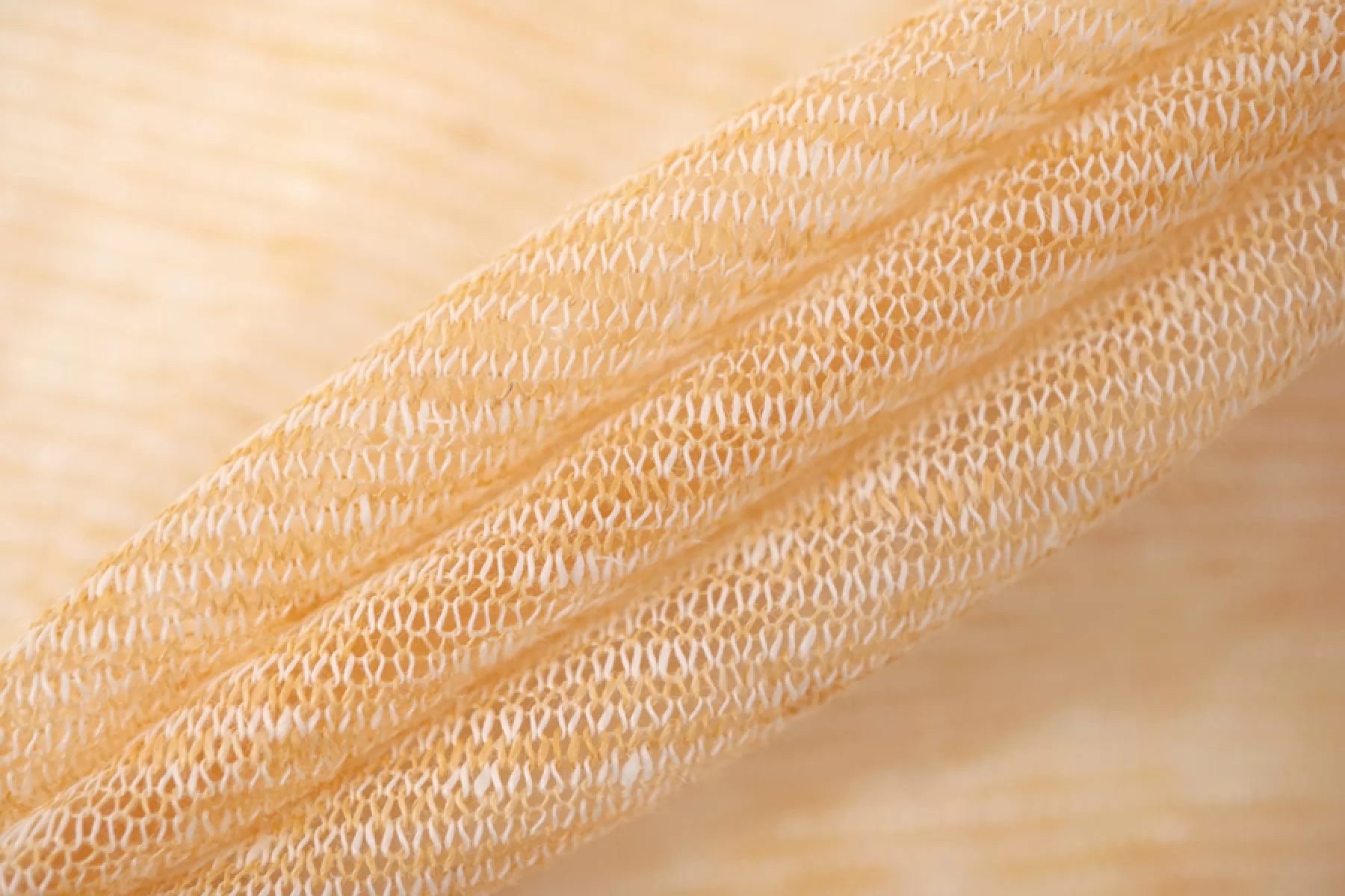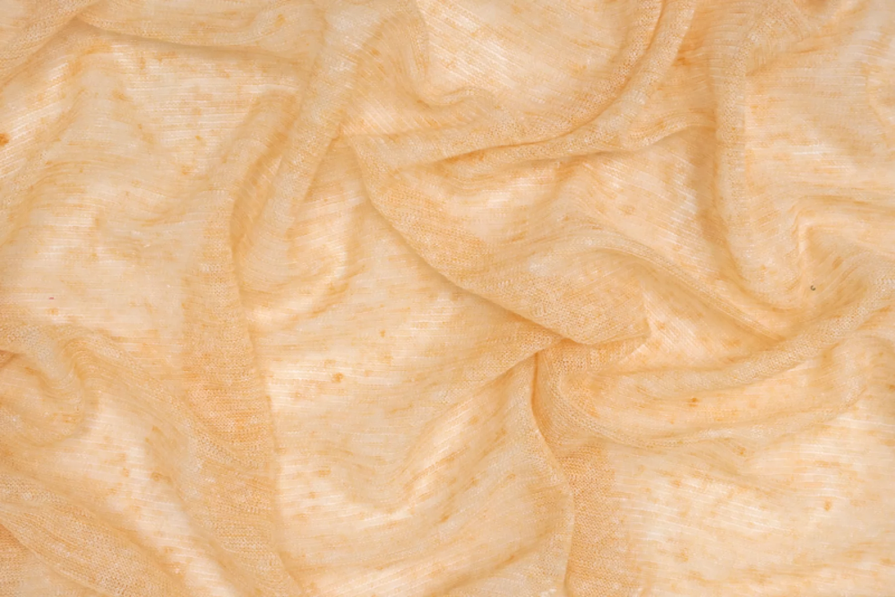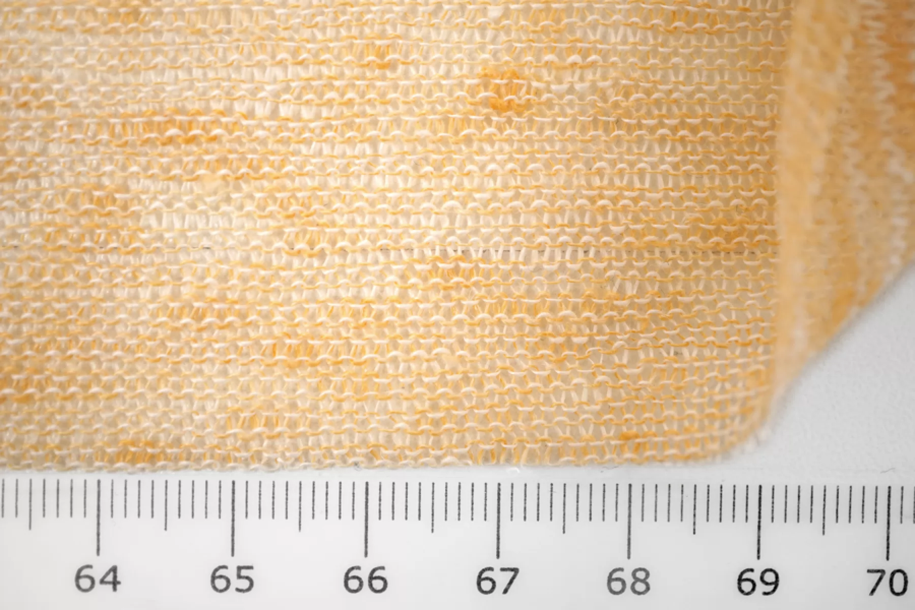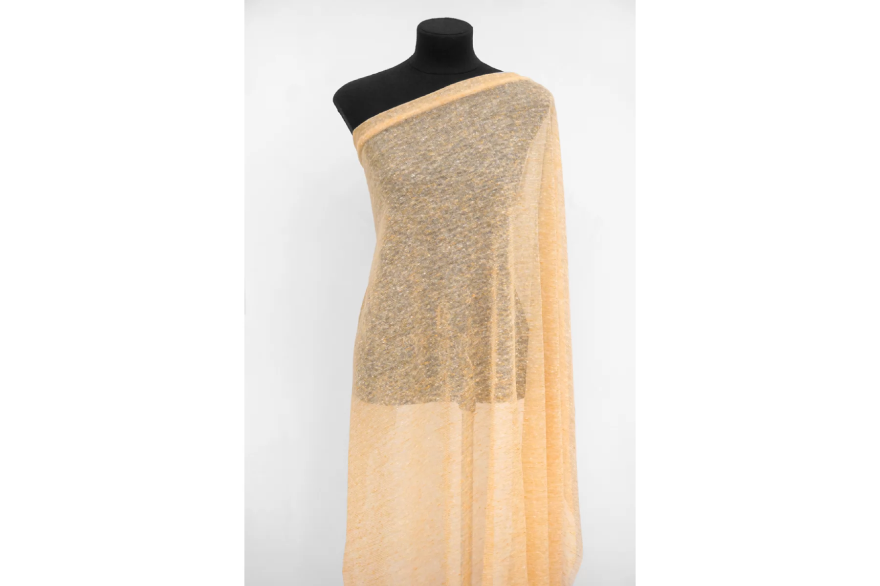 Льняной трикотаж - кулирная гладь сложного бежево-желтого меланжевого оттенка. Плетение достаточно рыхлое. Тянется немного за счет плетения. Полупрозрачный, с красивой пластикой. Тактильно сухой - как лен. Форму не держит. Отличный вариант для пошива майки, футболки, топа, платья, юбки, легких костюмов, брюк на резинке, особенно в летний период. При необходимости используйте подкладочный материал.