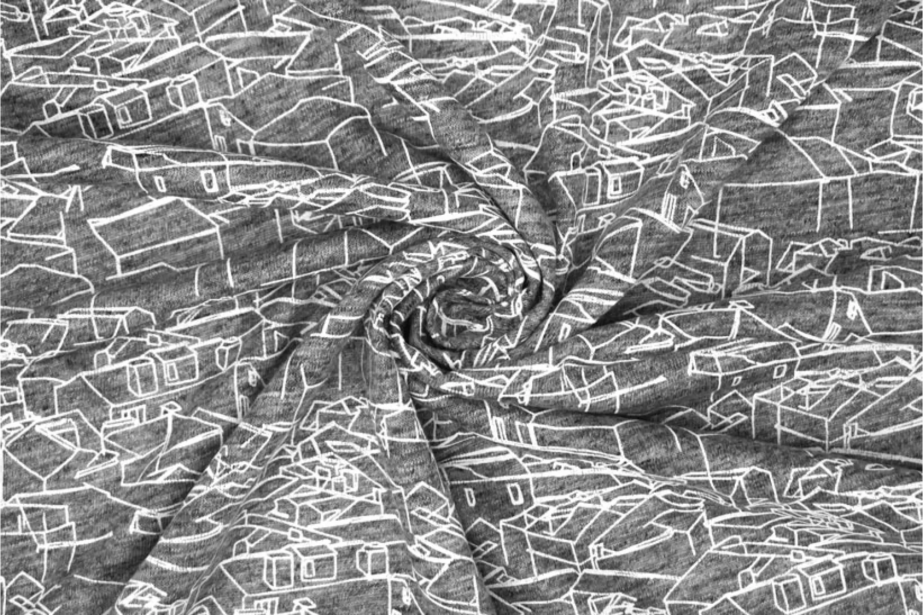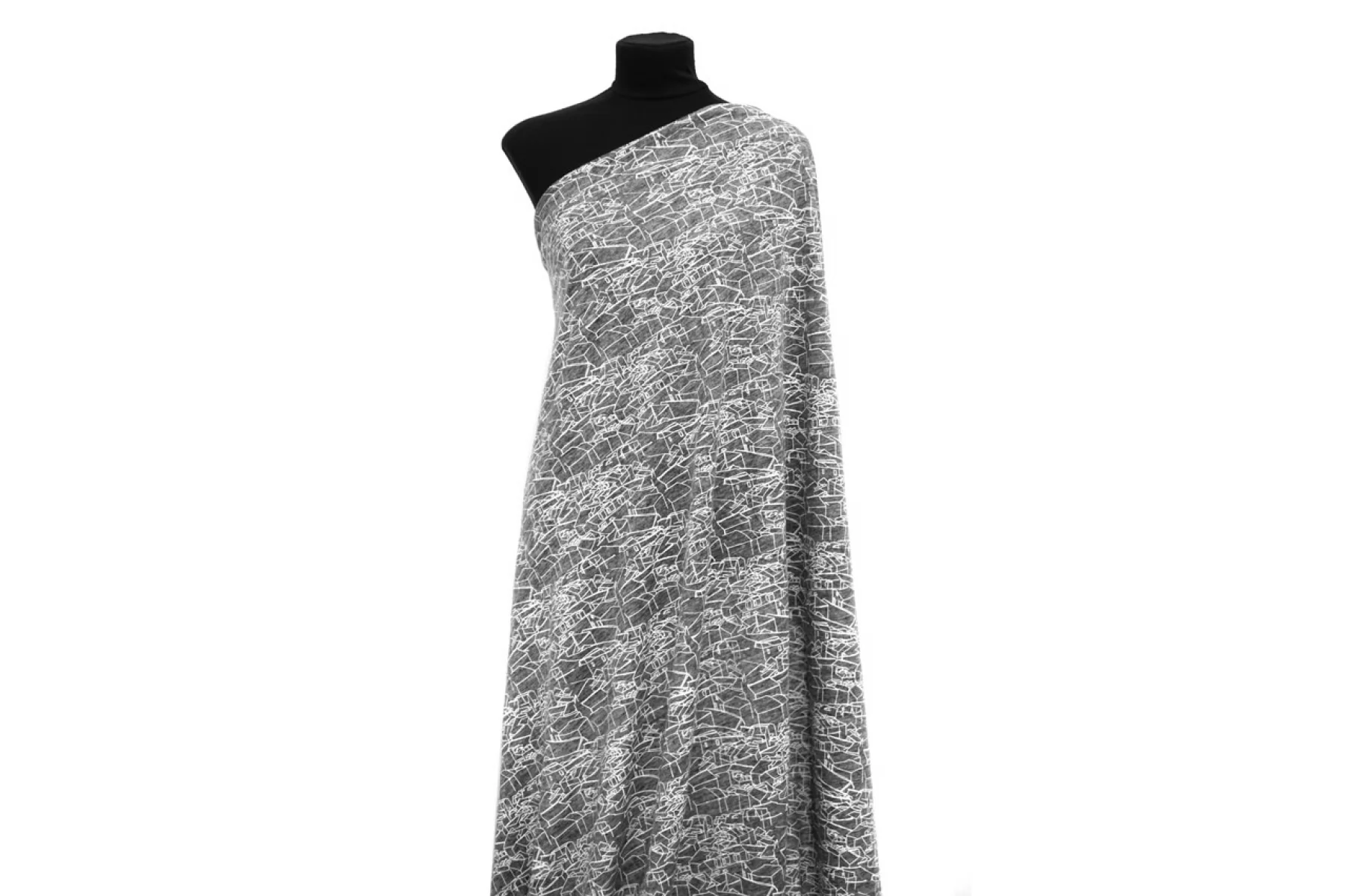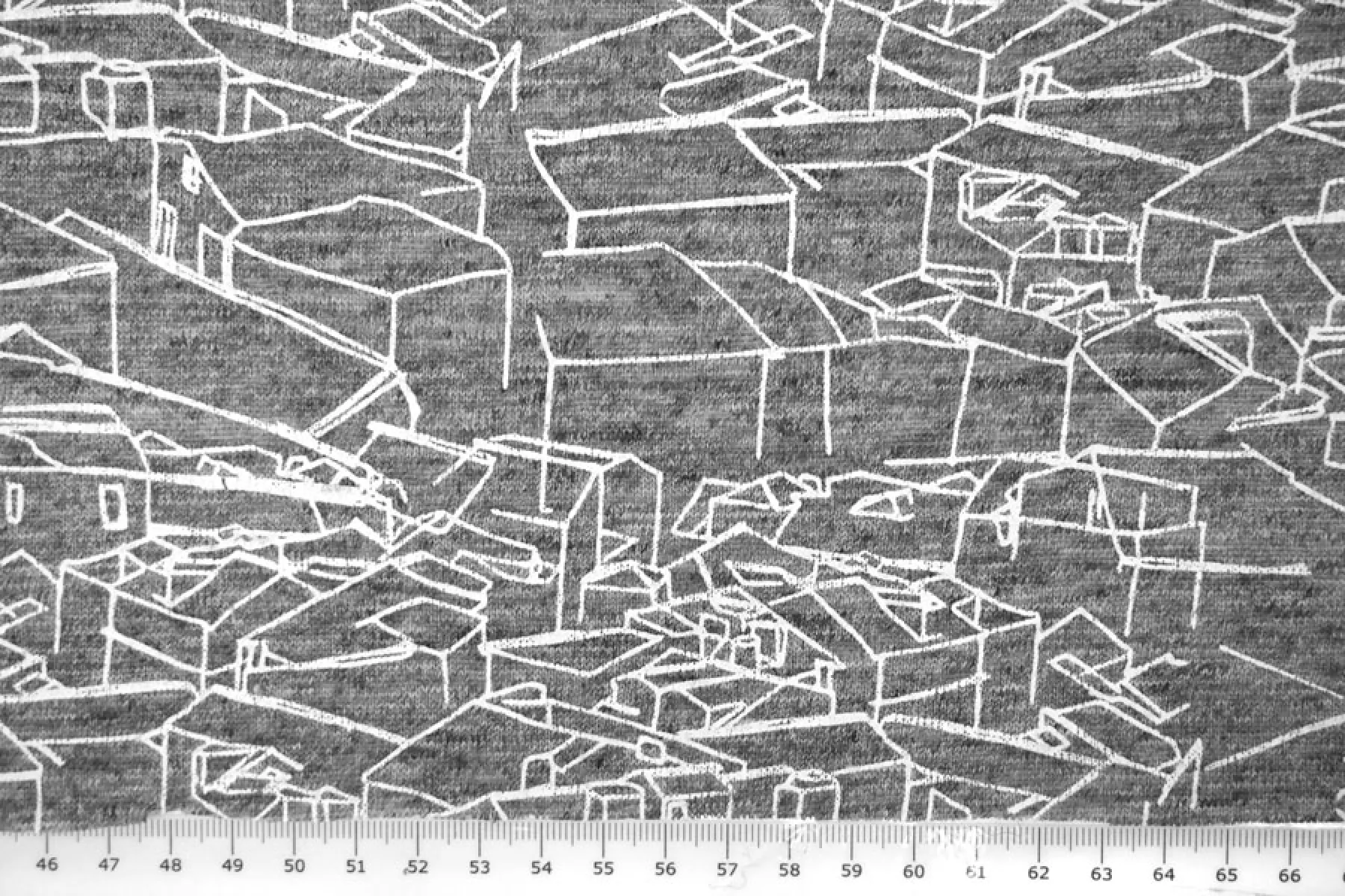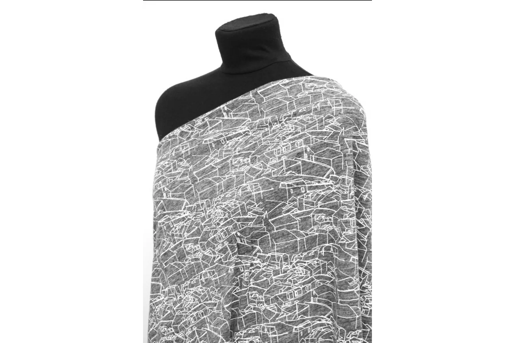 Серый льняной трикотаж с абстрактными линиями образующими узор в виде домов и улиц. Материал тактильно очень приятный и мягкий. Нет той сухости, которая свойственна льну. Неплохо тянется благодаря плетению. Слегка просвечивает силуэт. Тактильно ощущаются принтованные полоски. Совсем немного держит форму, довольно пластичен. Подойдет на футболки, туники, платья, лонгсливы и другие варианты.