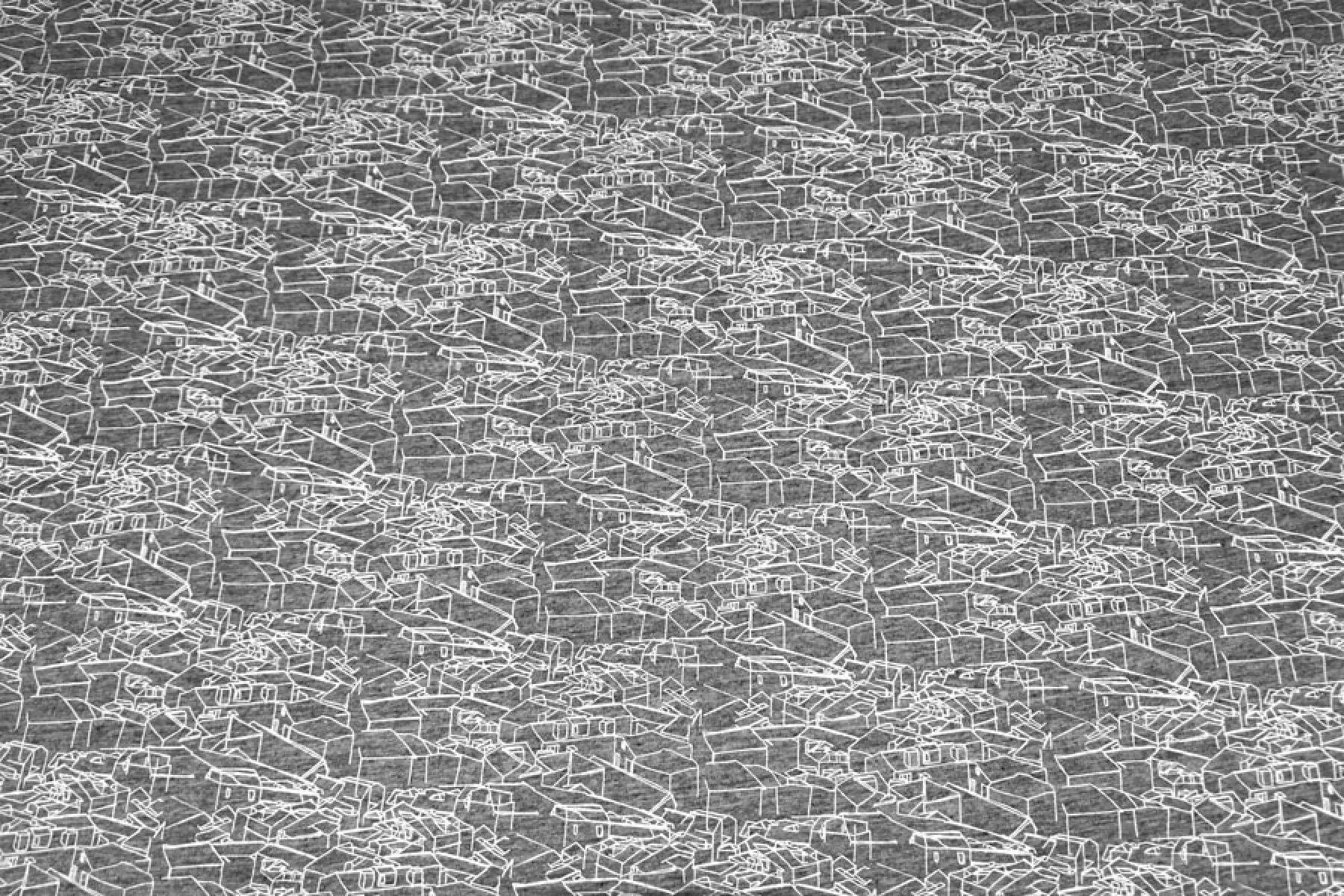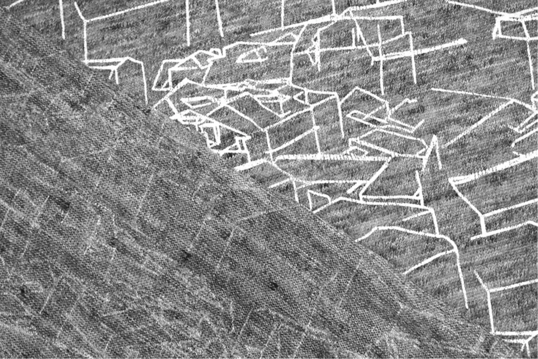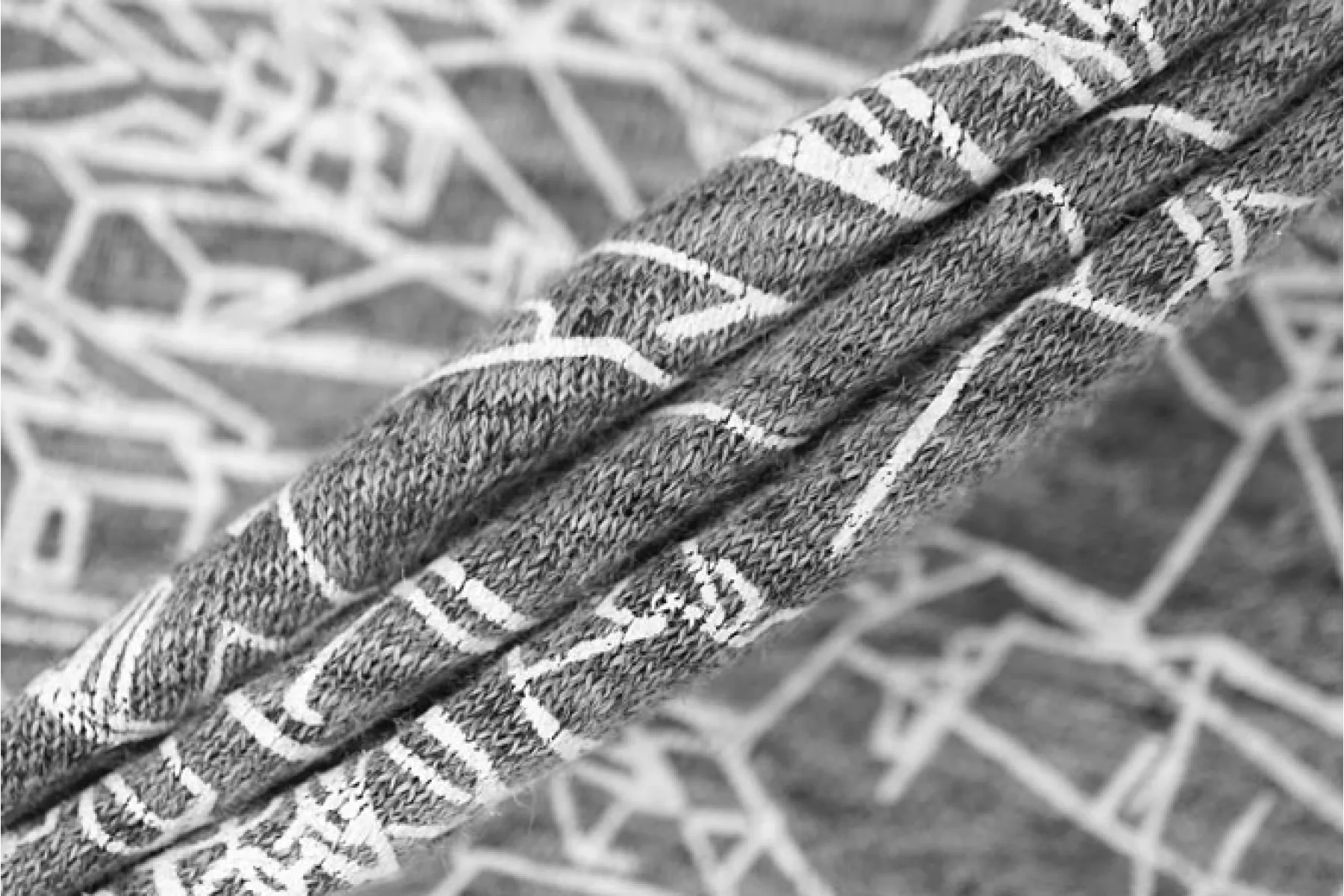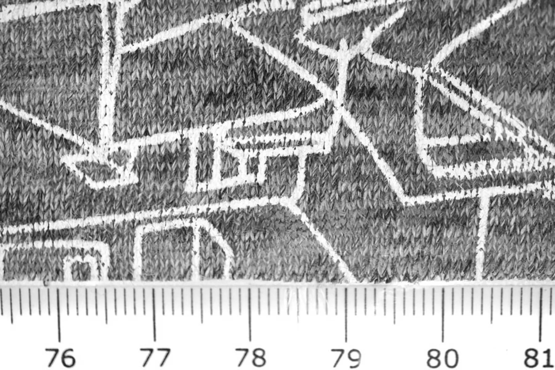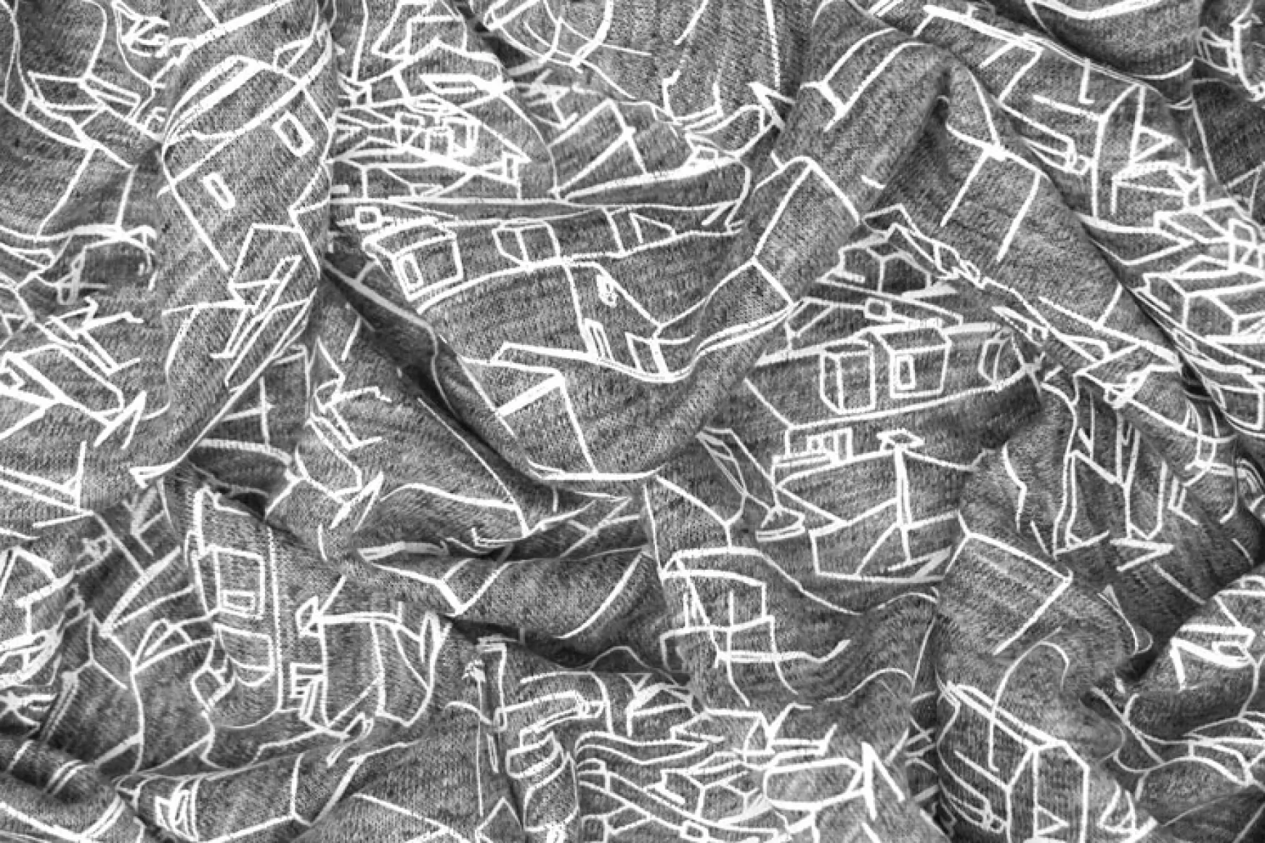 Серый льняной трикотаж с абстрактными линиями образующими узор в виде домов и улиц. Материал тактильно очень приятный и мягкий. Нет той сухости, которая свойственна льну. Неплохо тянется благодаря плетению. Слегка просвечивает силуэт. Тактильно ощущаются принтованные полоски. Совсем немного держит форму, довольно пластичен. Подойдет на футболки, туники, платья, лонгсливы и другие варианты.