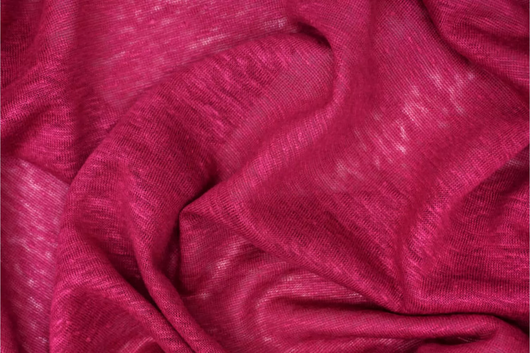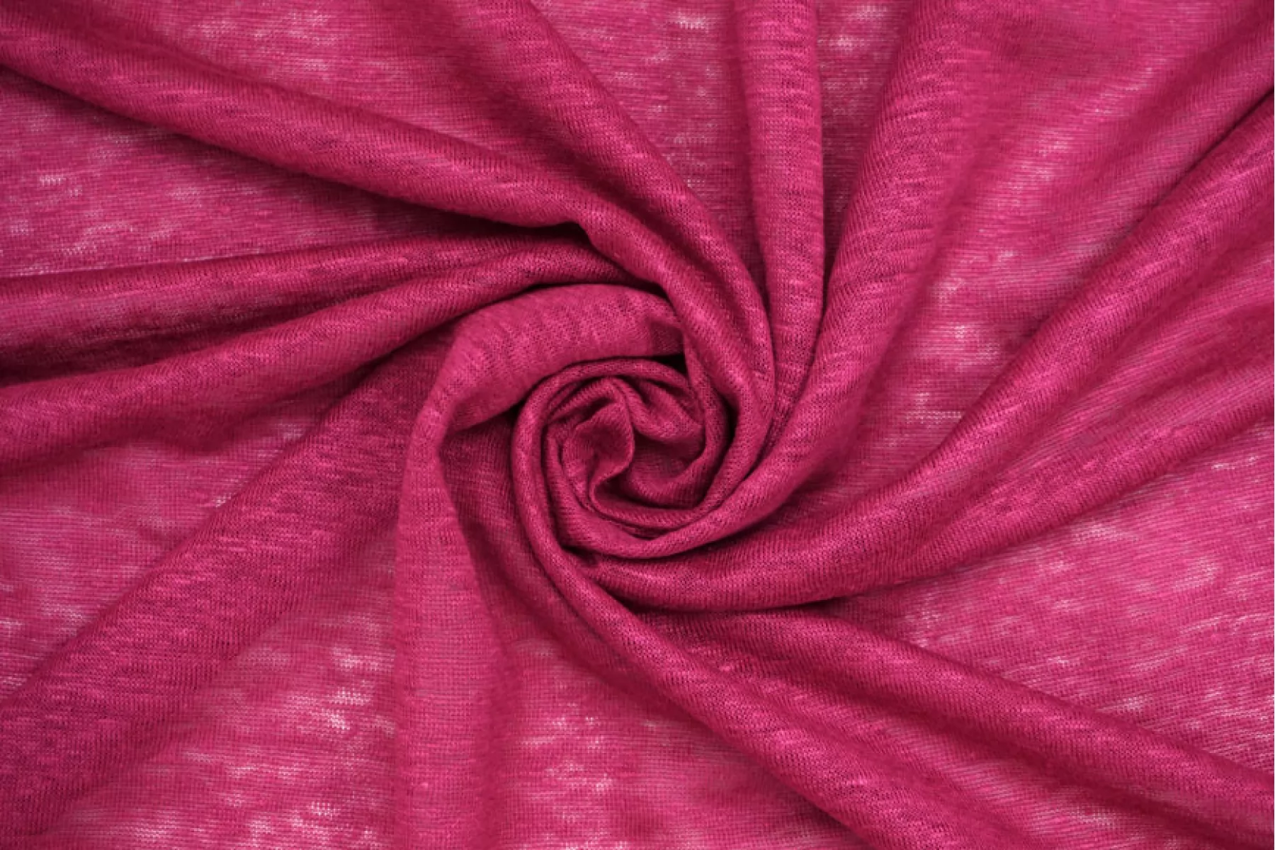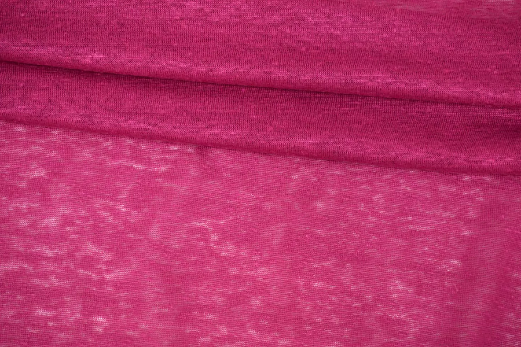 Тонкий льняной трикотаж FORTE_FORTE в оттенке розовой фуксии, кулирная гладь. Тактильно мягкий, приятный, но суховатый - как лен. Пластичный. Обладает приятным лоском. Упруго тянется за счет плетения. С небольшими уплотнениями, что свойственно льну. Немного мнется, практически полностью восстанавливается. Форму не держит. Просвечивает силуэт. Шьем летние костюмы, платья, кофты и другие варианты, но учитывайте, что просвечивает.