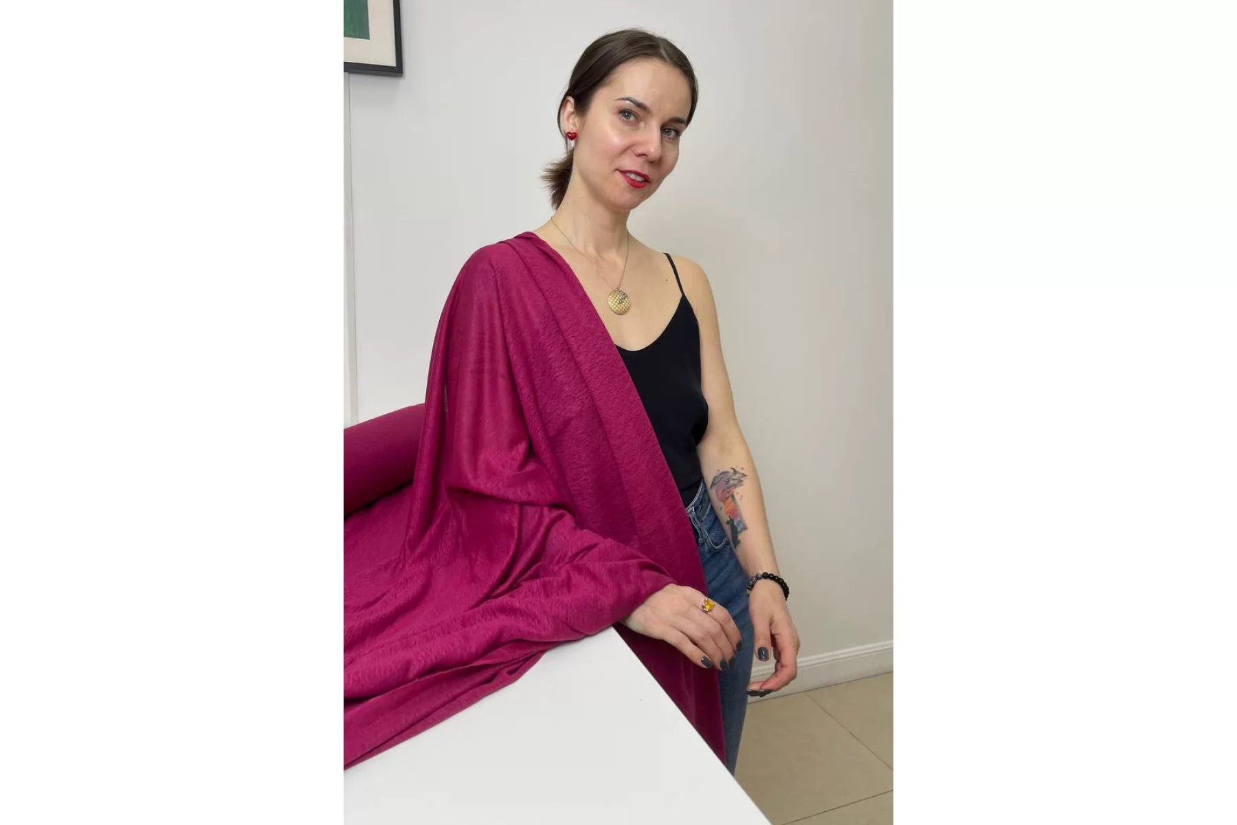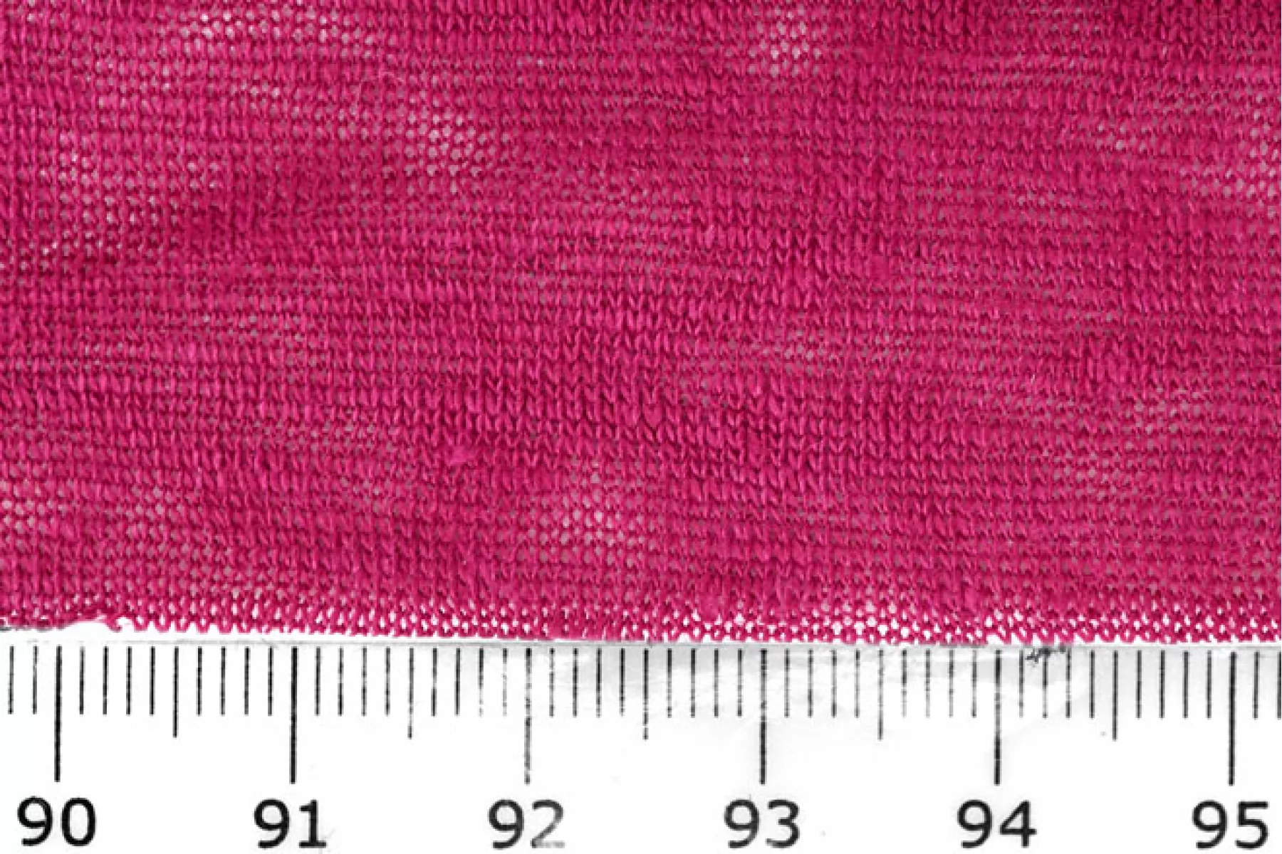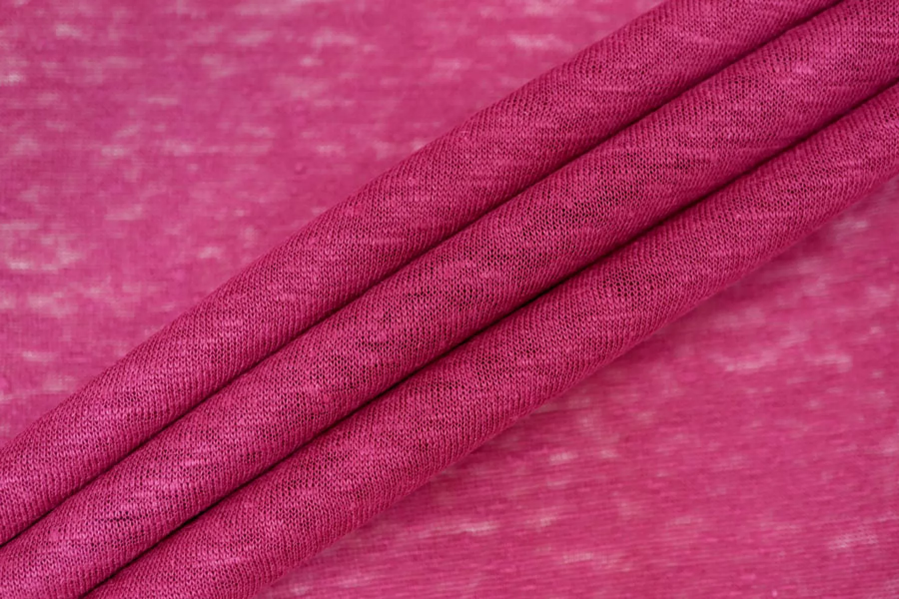 Тонкий льняной трикотаж FORTE_FORTE в оттенке розовой фуксии, кулирная гладь. Тактильно мягкий, приятный, но суховатый - как лен. Пластичный. Обладает приятным лоском. Упруго тянется за счет плетения. С небольшими уплотнениями, что свойственно льну. Немного мнется, практически полностью восстанавливается. Форму не держит. Просвечивает силуэт. Шьем летние костюмы, платья, кофты и другие варианты, но учитывайте, что просвечивает.