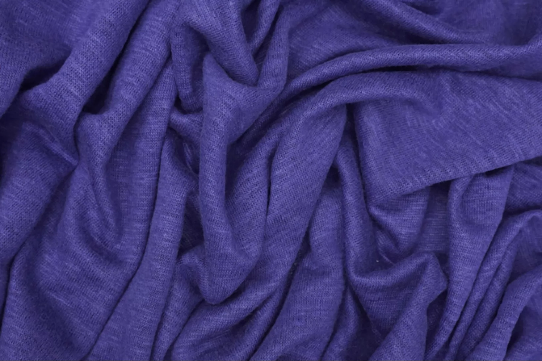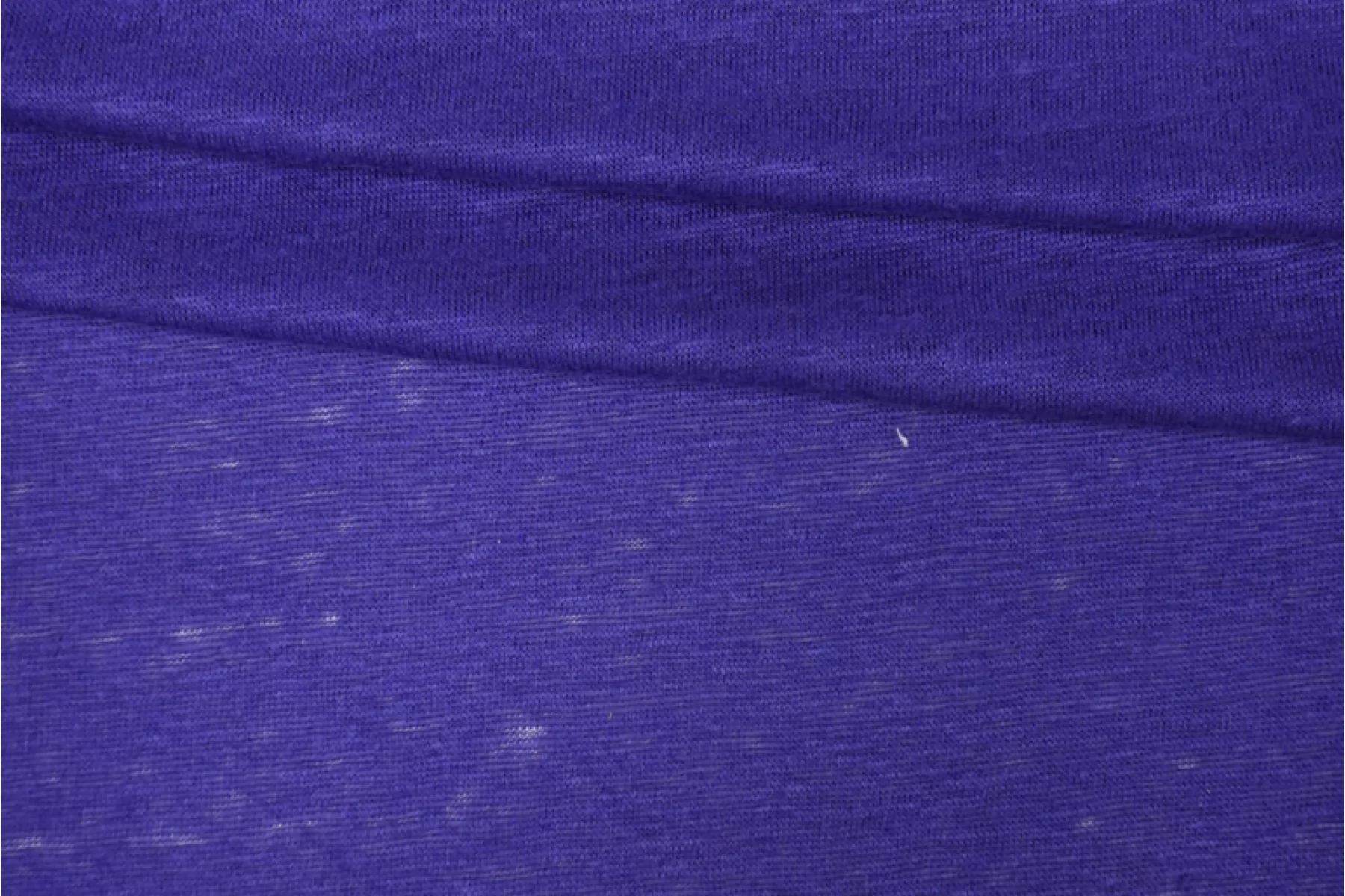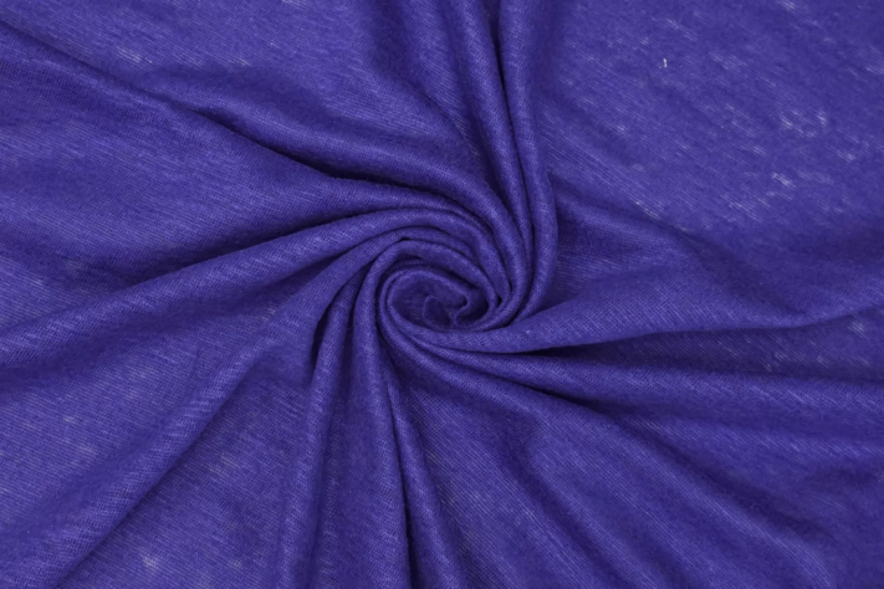 Льняной трикотаж - кулирная гладь ярко-синего, красивого цвета. Материал тактильно приятный, достаточно мягкий. Обладает легким приятным лоском, с красивой пластикой. Немного и упруго тянется за счет плетения. Трикотаж тонкий, просвечивает. Прекрасный вариант для пошива майки, футболки, топа, платья, юбки, брюк на резинке, особенно в летний период. При необходимости используйте подкладочный материал.