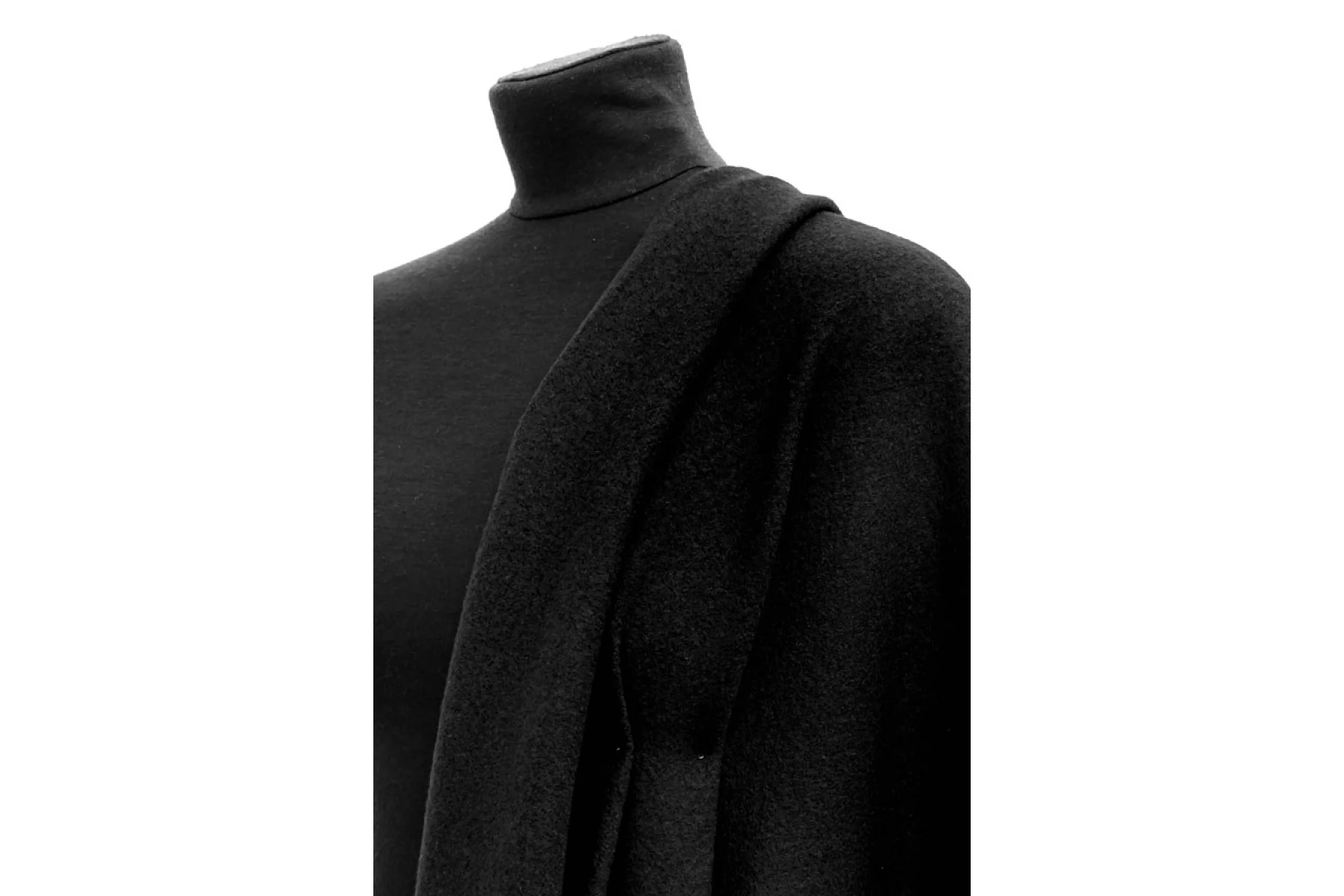 Шикарный костюмный шерстяной лоден классического черного цвета. Тактильно сухой, слегка шероховатый, но мягкий и не колется. Растяжим за счет плетения. Плотненький, около 1-1,5 мм толщиной. Не просвечивает. Слегка сминается, но восстанавливается. Неплохо держит форму и складки, хорошо драпируется. Срезы, как и у любого лодена, не осыпаются. Отличный вариант как для костюма, на теплые рубашки и не только. Уход, как за любой шерстью деликатный.